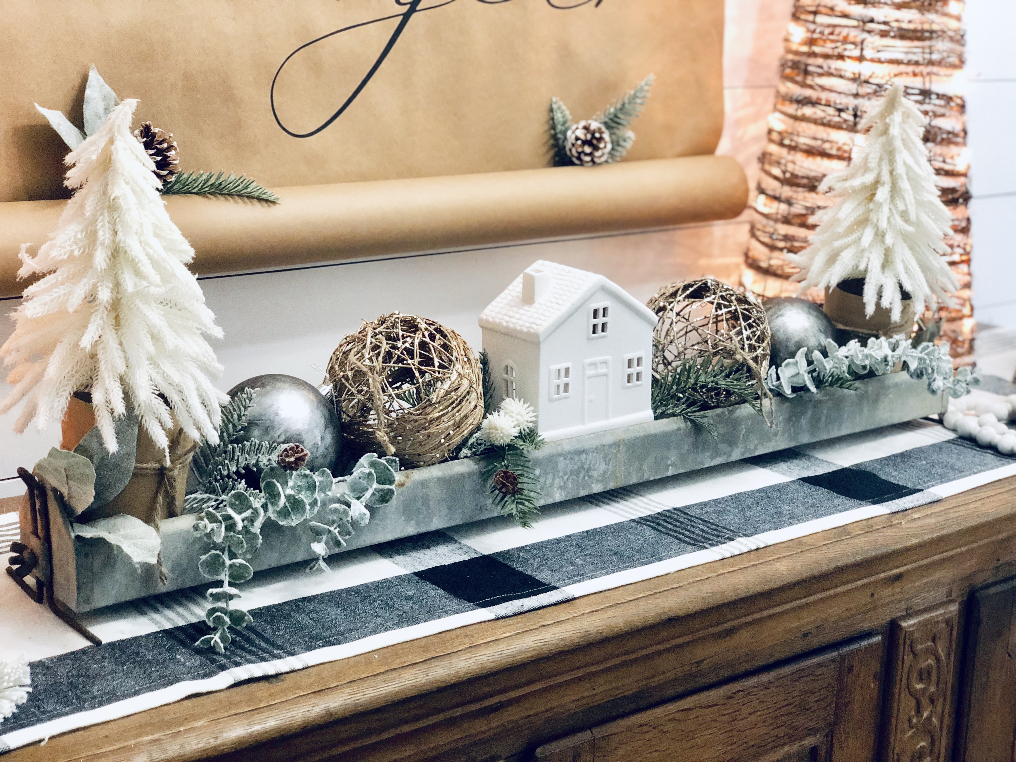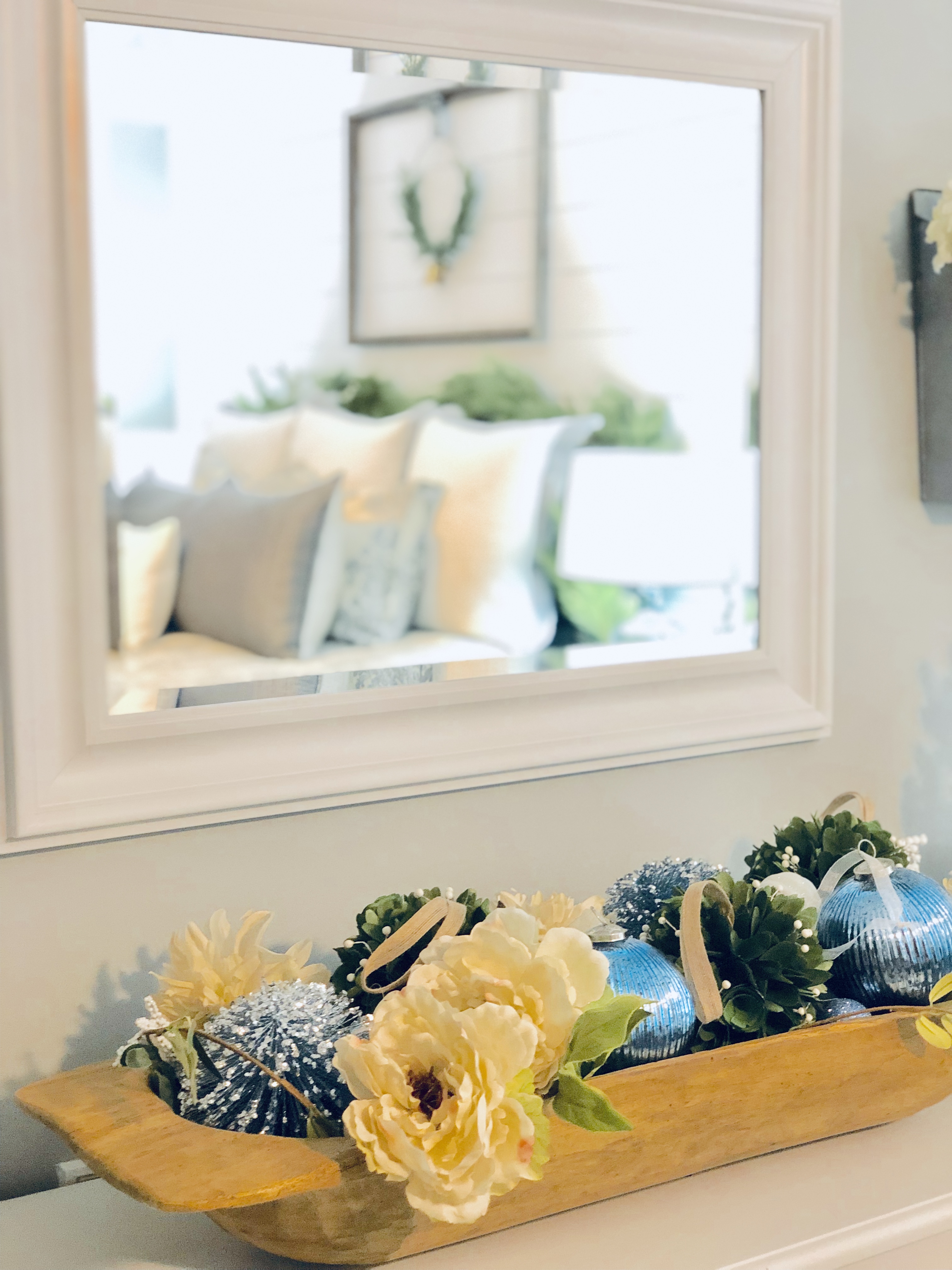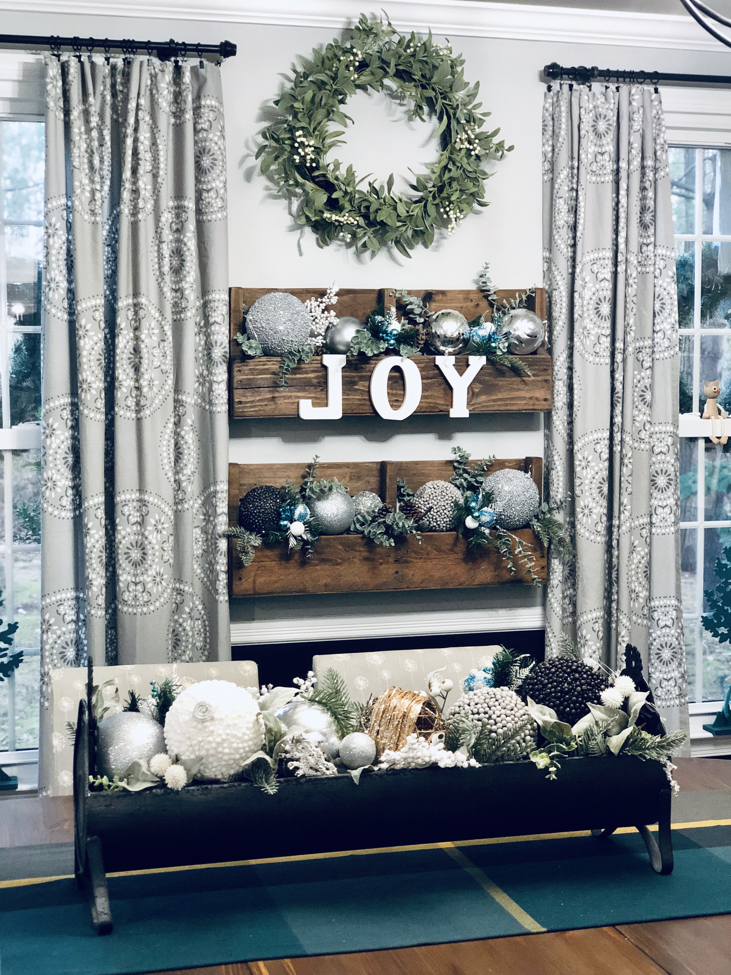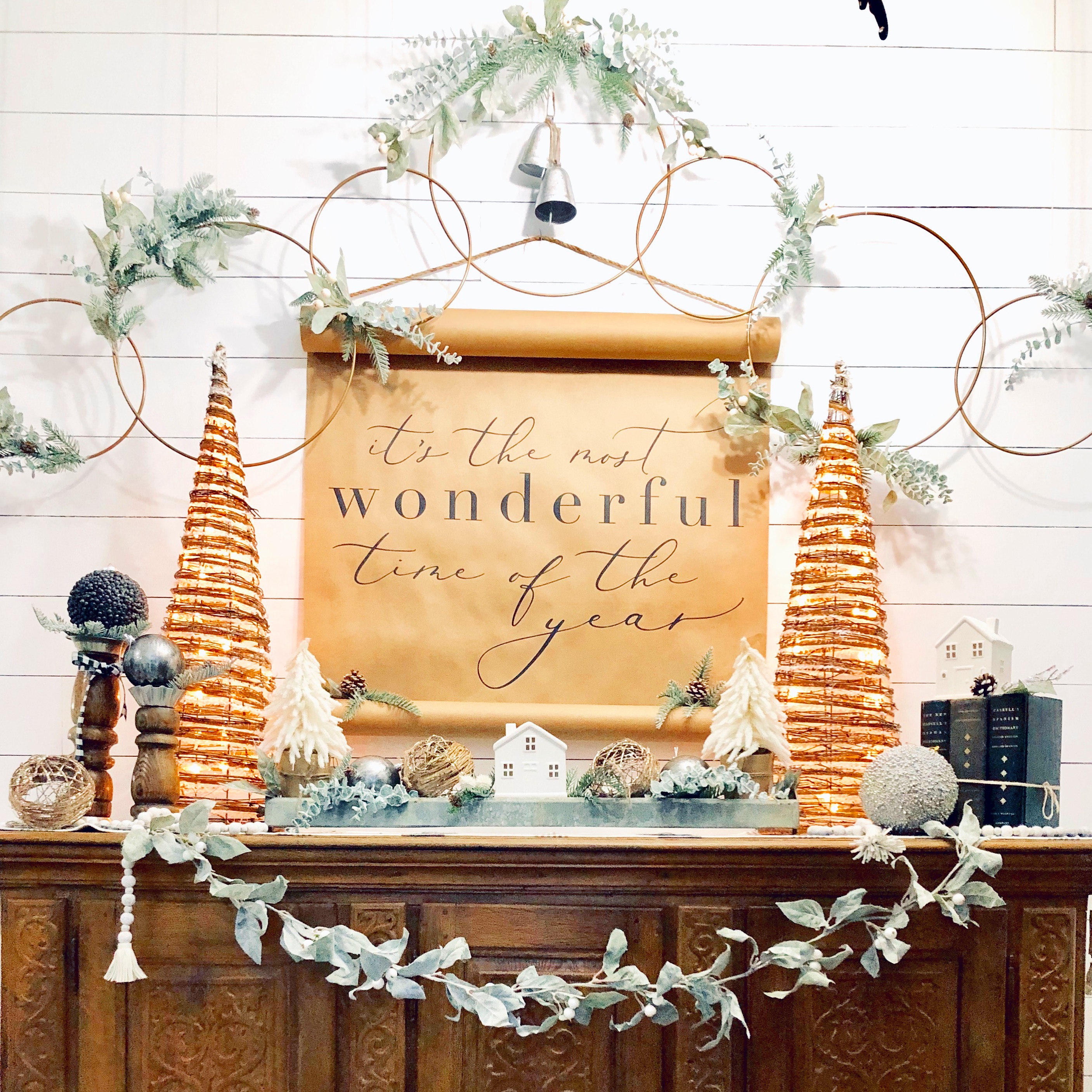 My entryway is one of my favorite spots in the house! Decorated for Christmas it is a real focal point from the front door and I absolutely love that. This area has gone through major changes since we first moved in. It’s still not completely finished, but what really is. The main wall is shiplapped, which you can read here on our DIY Shiplap tutorial on how to do that. The main piece in the Entryway is this sideboard table. This was one of the last pieces I bought while living overseas in Germany. I found it in France, at one of the thrift stores and somehow snuck it into our big PCS move. If you could only have seen Greg’s face when it got off the truck in the states!! lol;) For Christmas, I added a ton of my DIY Scandinavian Wreaths, they are all hanging with twine and fishing wire. The main piece for my sideboard is an old chicken feeder, which I have used as my centerpiece. One of my favorite things to do is to find something old and reuse it for something completely unexpected. You will see that a lot throughout my home.