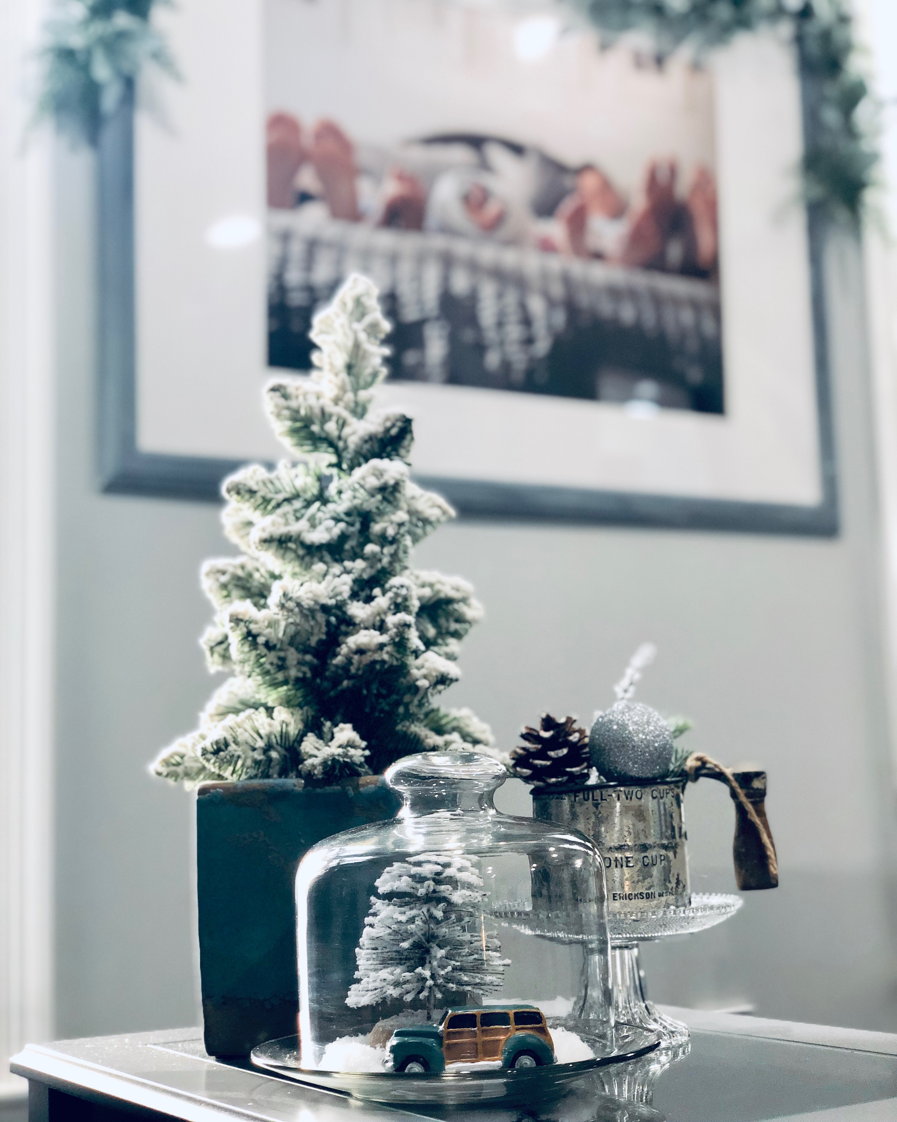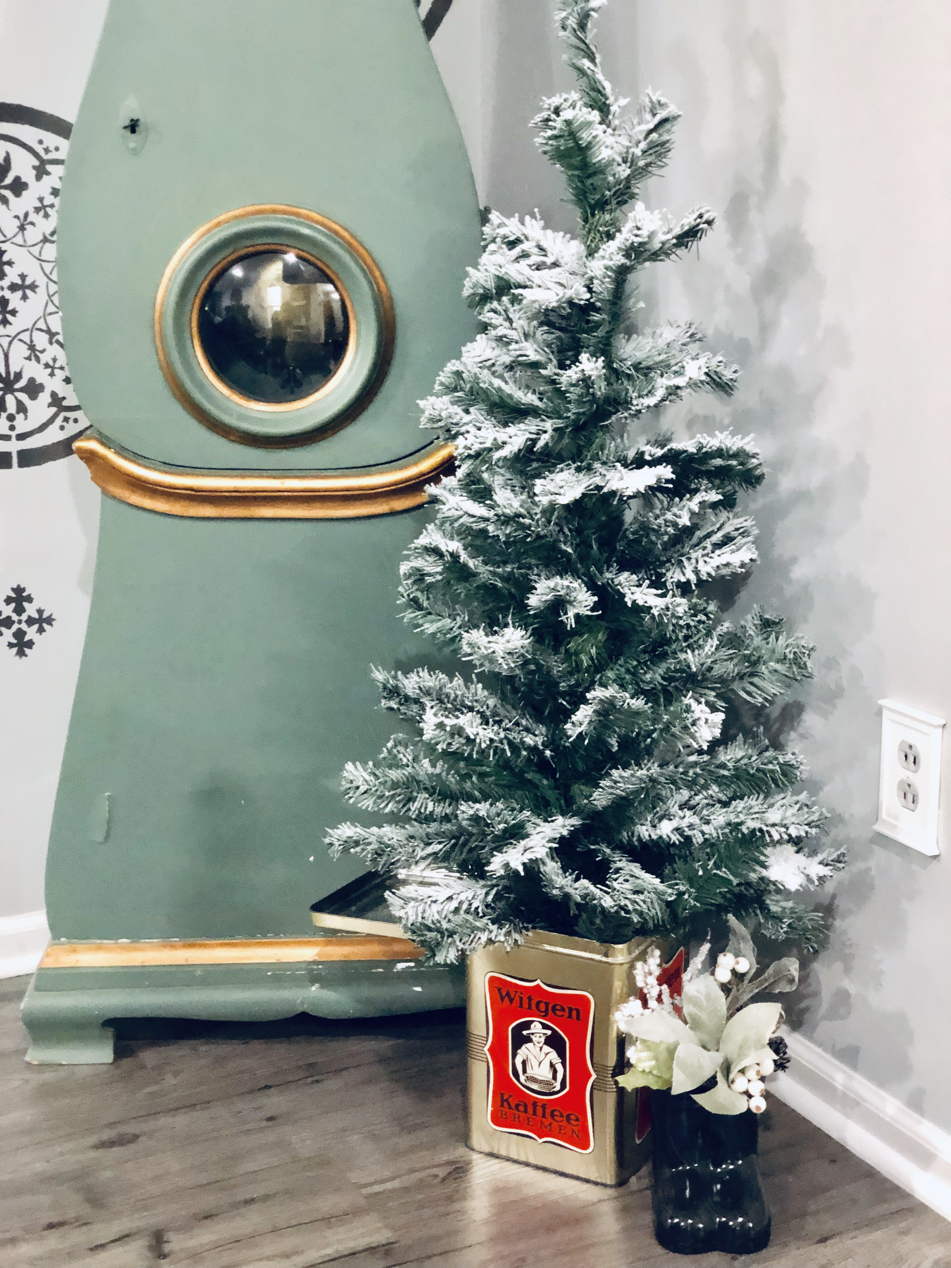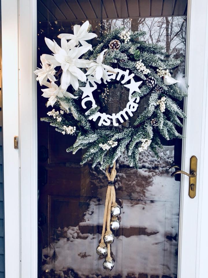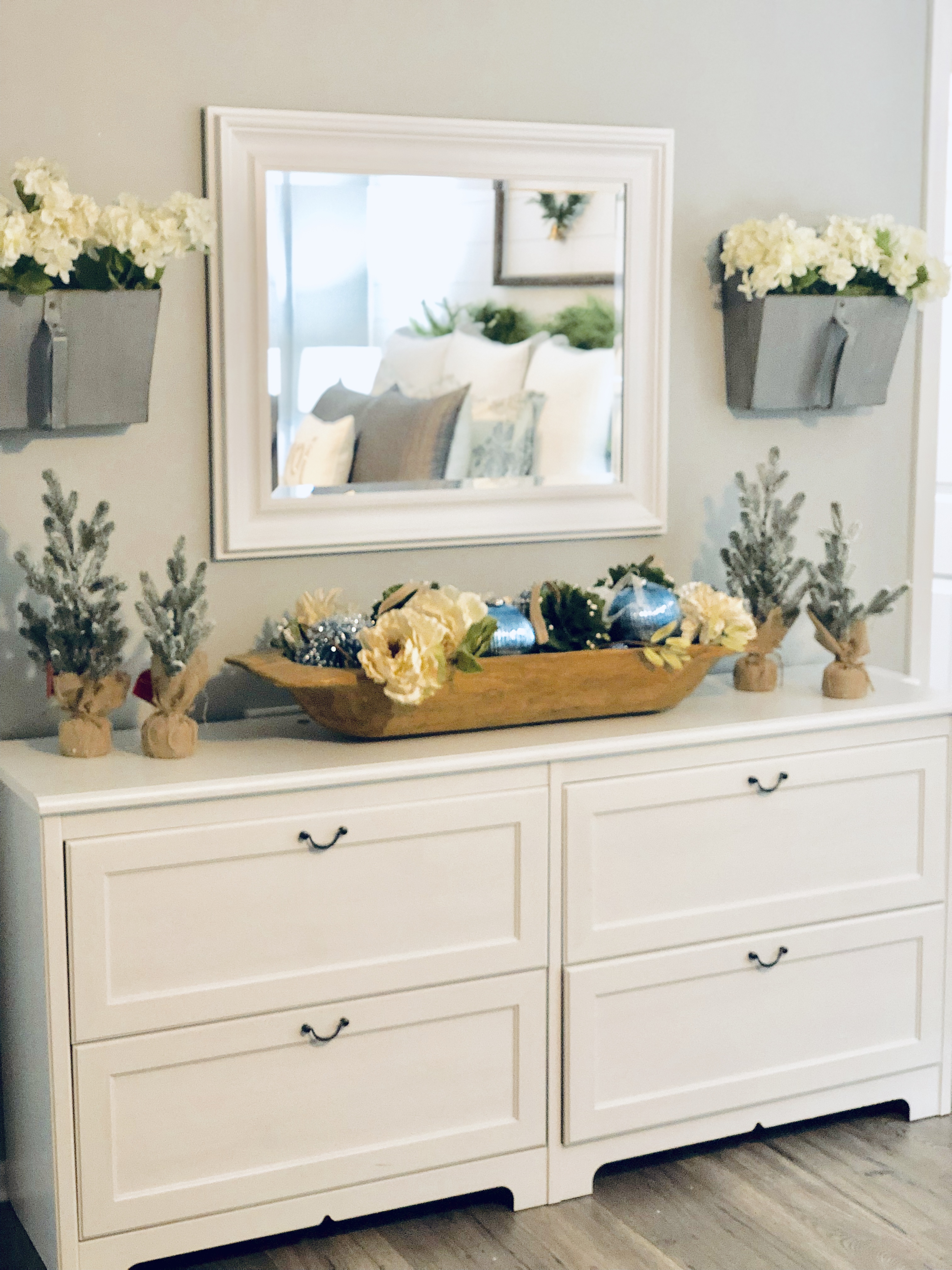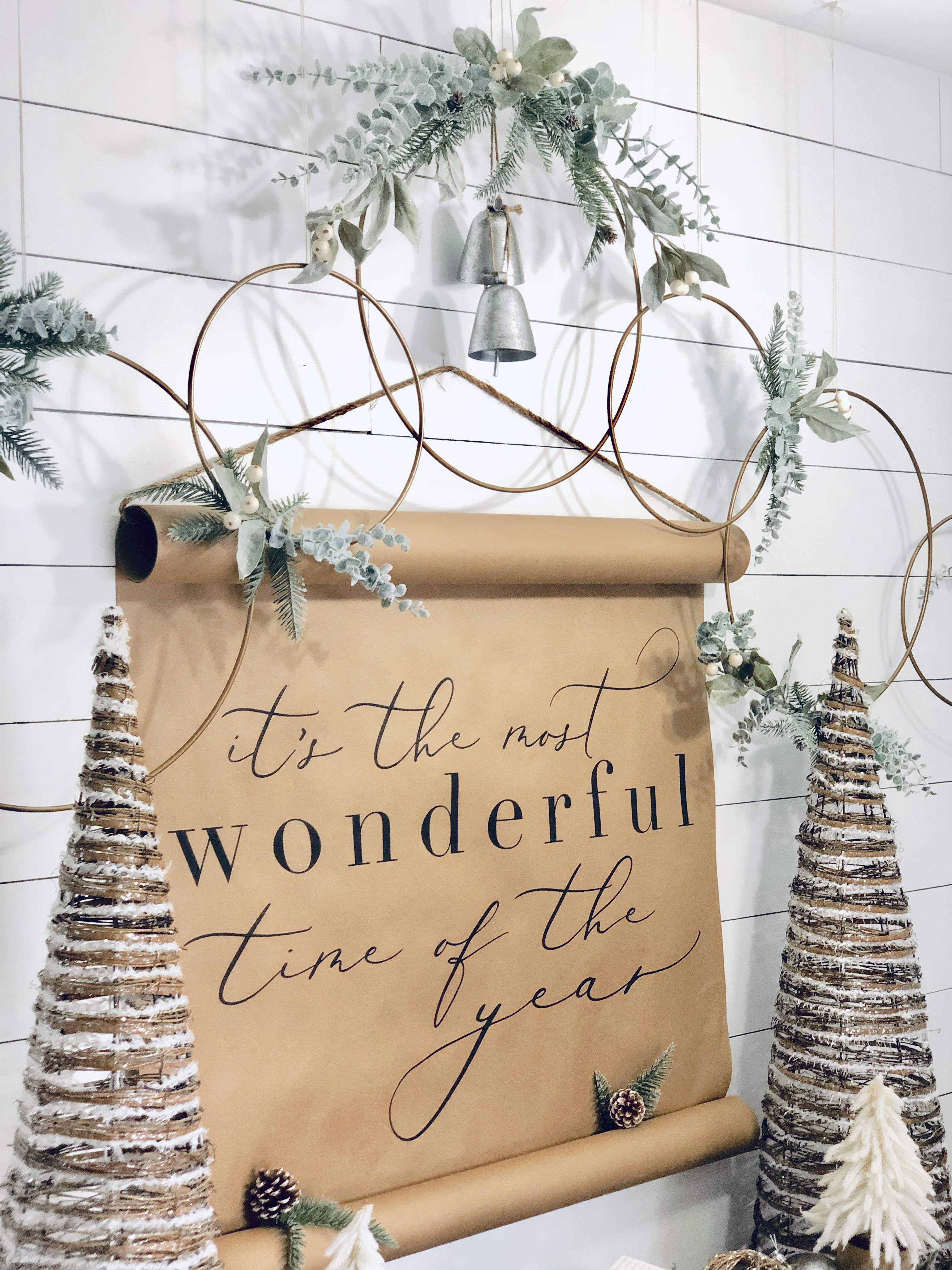 My entryway is one of my favorite spots in the house! Decorated for Christmas it is a real focal point from the front door and I absolutely love that. This area has gone through major changes since we first moved in. It’s still not completely finished, but what really is. The main wall is shiplapped, which you can read here on our DIY Shiplap tutorial on how to do that. The main piece in the Entryway is this sideboard table. This was one of the last pieces I bought while living overseas in Germany. I found it in France, at one of the thrift stores and somehow snuck it into our big PCS move. If you could only have seen Greg’s face when it got off the truck in the states!! lol;) For Christmas, I added a ton of my DIY Scandinavian Wreaths, they are all hanging with twine and fishing wire. The main piece for my sideboard is an old chicken feeder, which I have used as my centerpiece. One of my favorite things to do is to find something old and reuse it for something completely unexpected. You will see that a lot throughout my home.