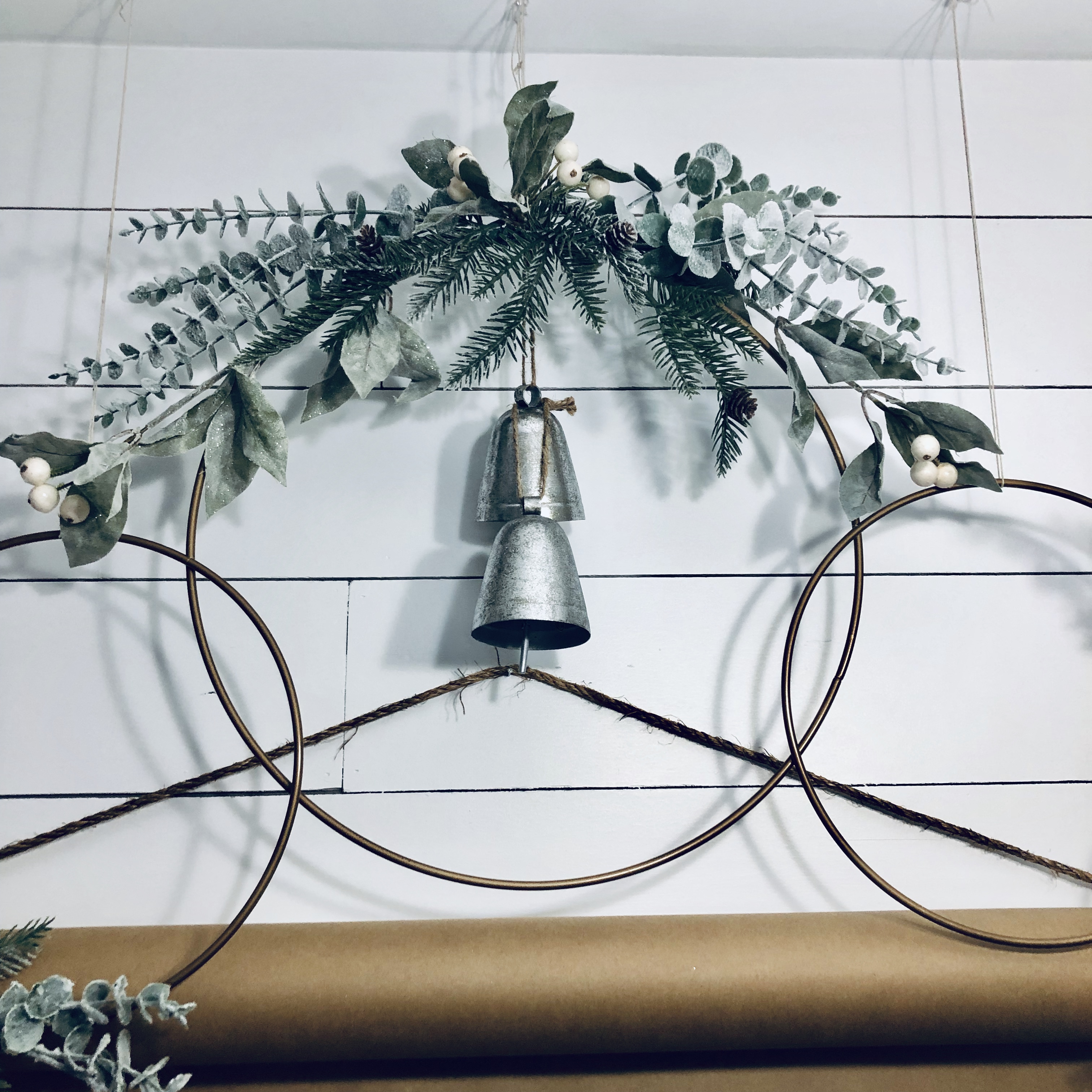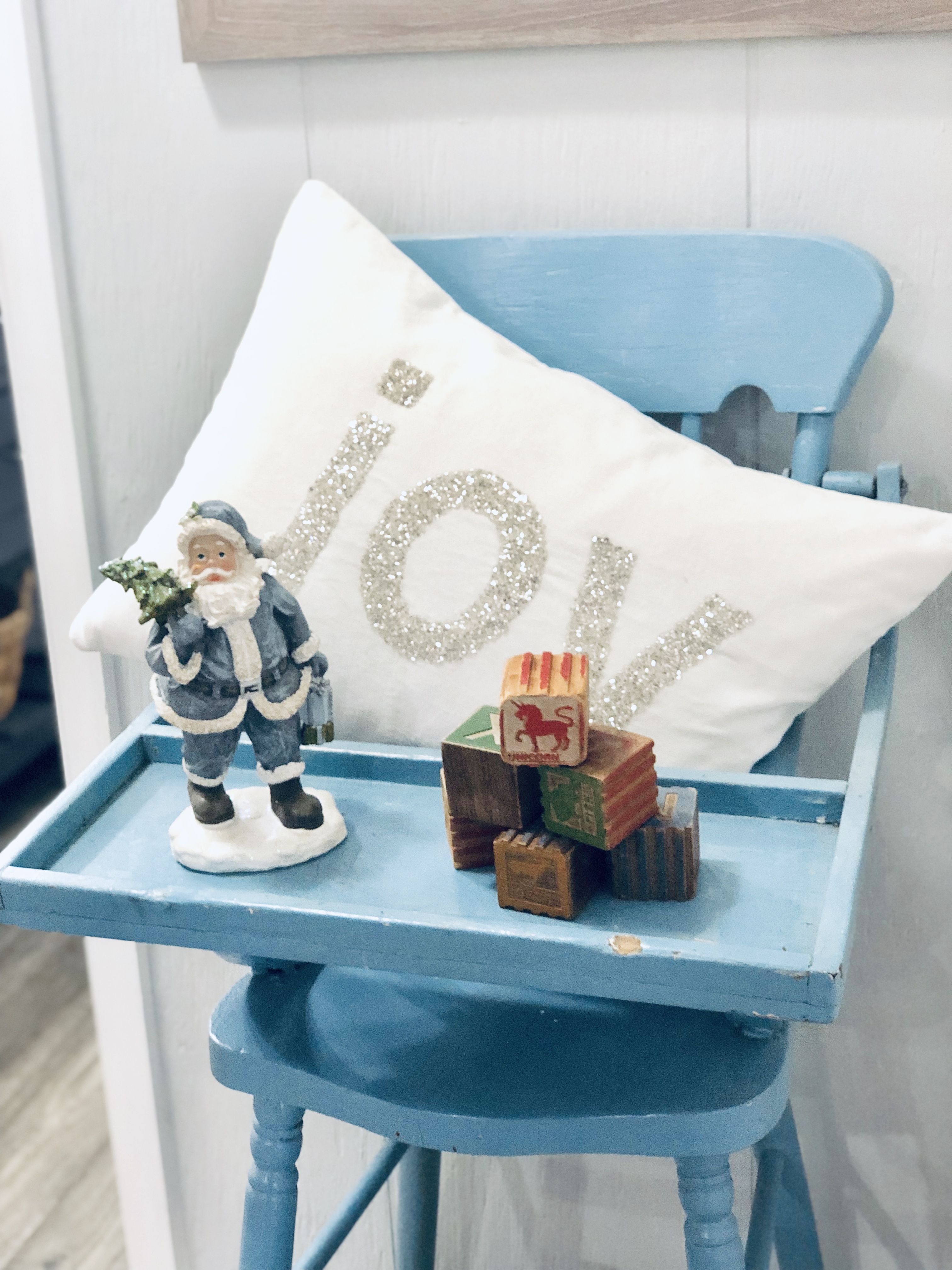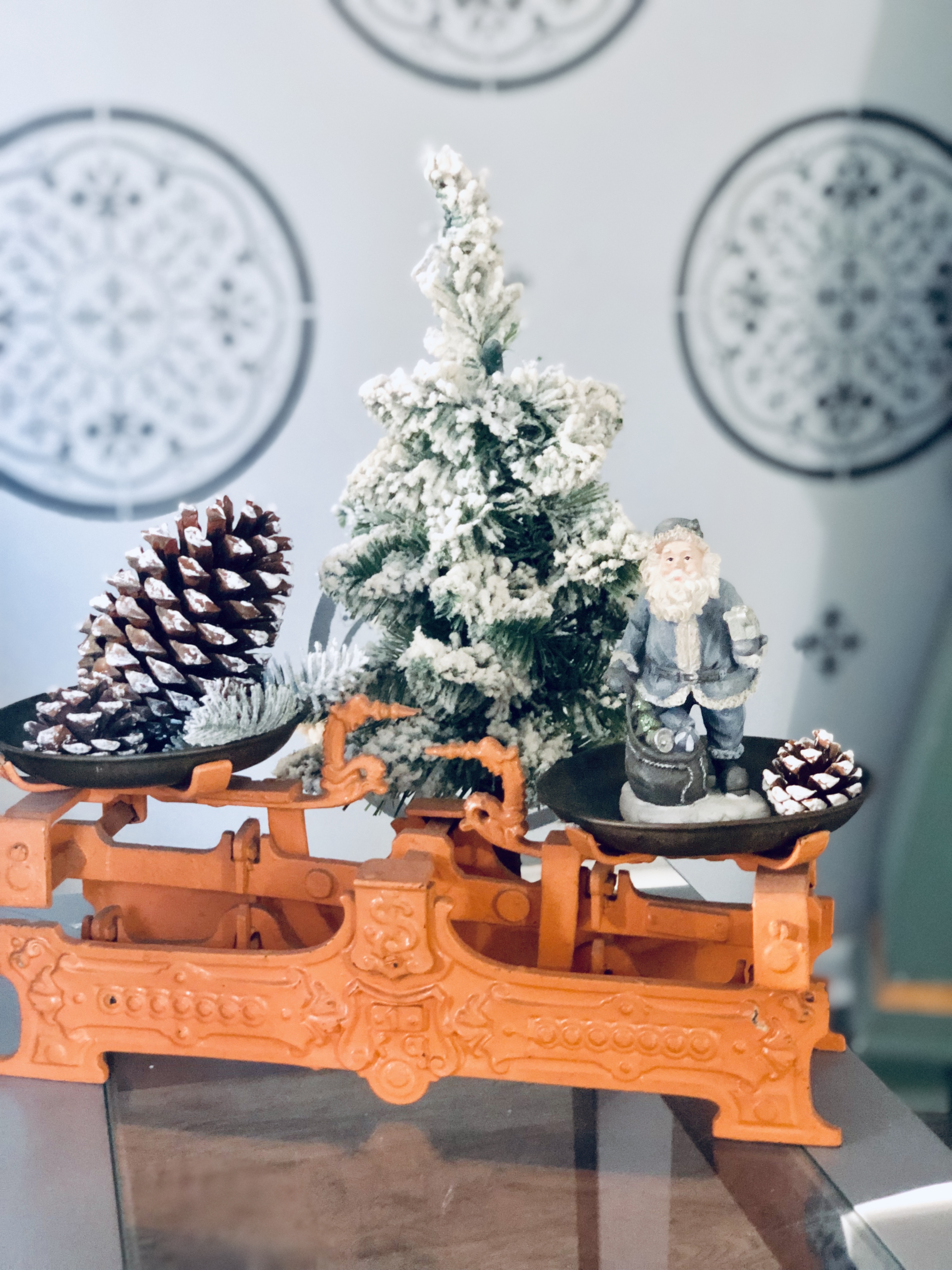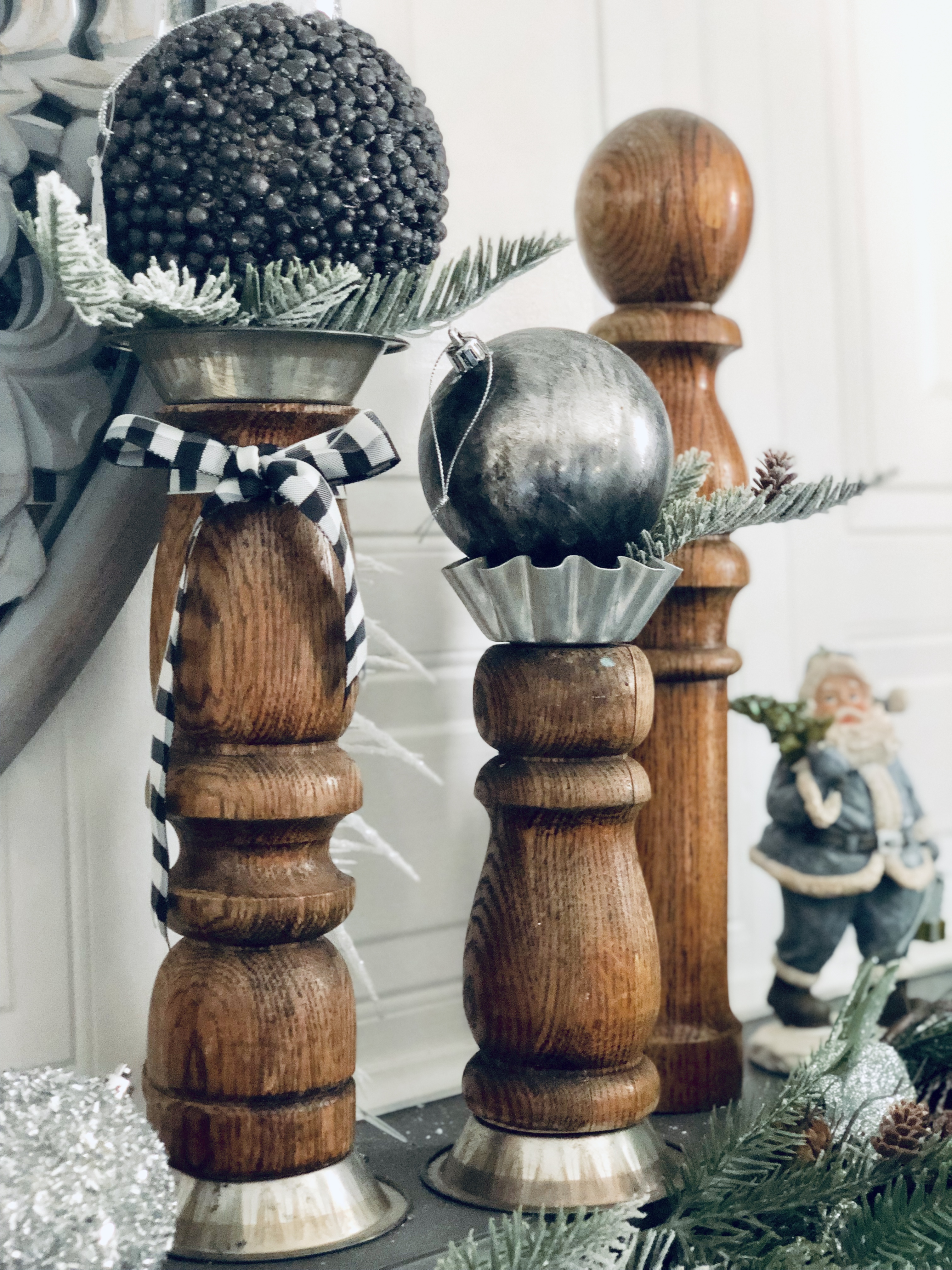 My entryway is one of my favorite spots in the house! Decorated for Christmas it is a real focal point from the front door and I absolutely love that. This area has gone through major changes since we first moved in. It’s still not completely finished, but what really is. The main wall is shiplapped, which you can read here on our DIY Shiplap tutorial on how to do that. The main piece in the Entryway is this sideboard table. This was one of the last pieces I bought while living overseas in Germany. I found it in France, at one of the thrift stores and somehow snuck it into our big PCS move. If you could only have seen Greg’s face when it got off the truck in the states!! lol;) For Christmas, I added a ton of my DIY Scandinavian Wreaths, they are all hanging with twine and fishing wire. The main piece for my sideboard is an old chicken feeder, which I have used as my centerpiece. One of my favorite things to do is to find something old and reuse it for something completely unexpected. You will see that a lot throughout my home.