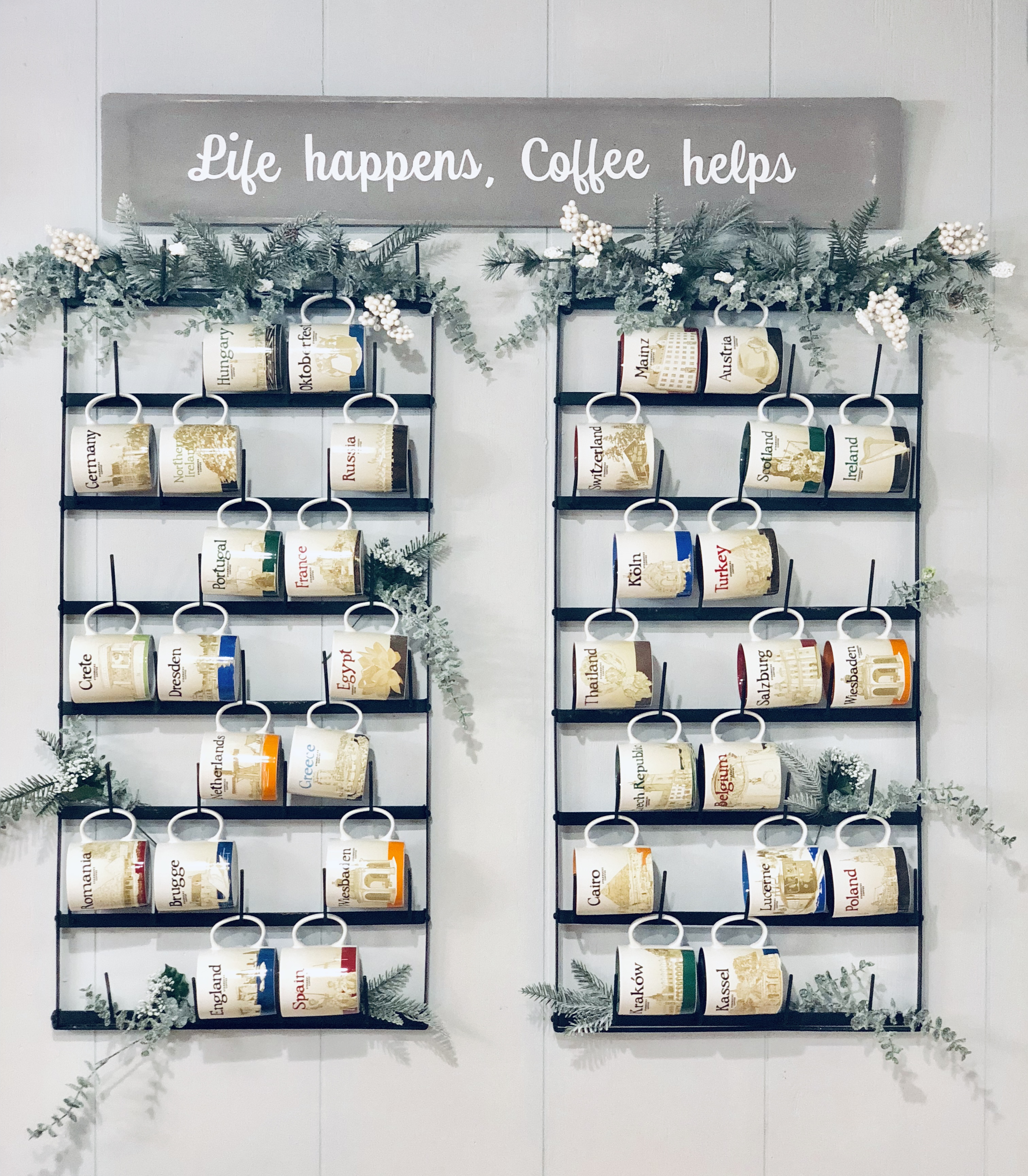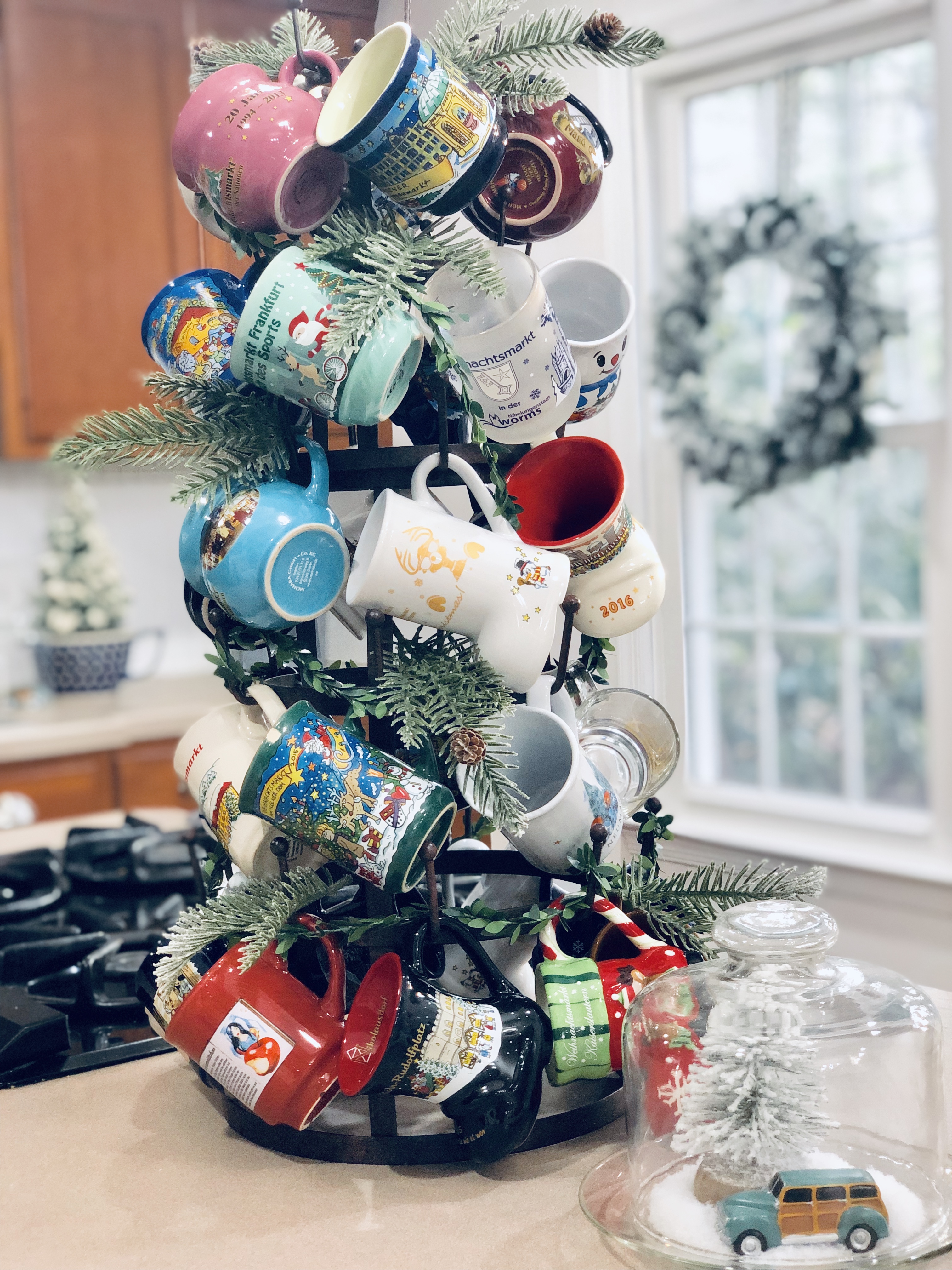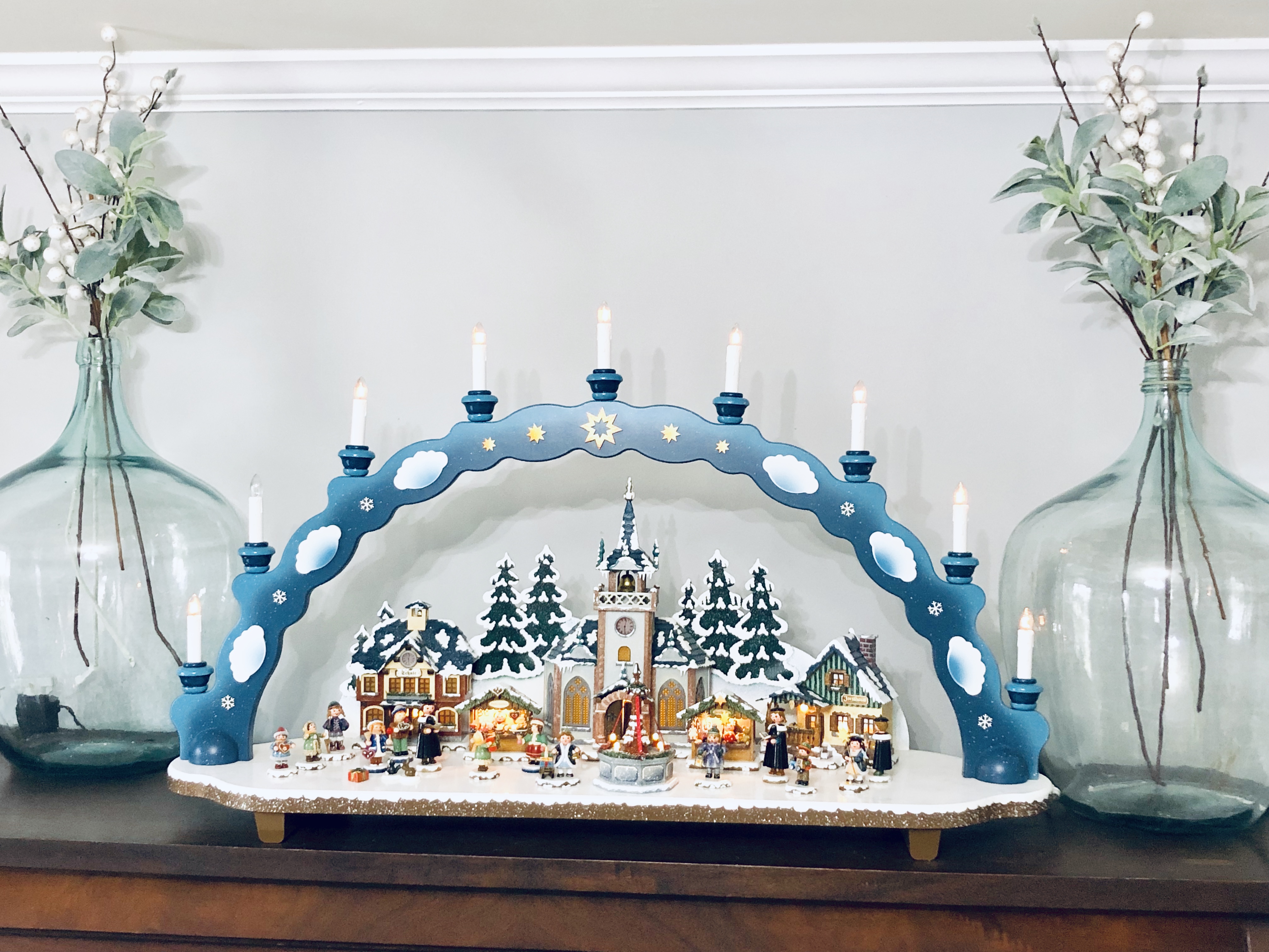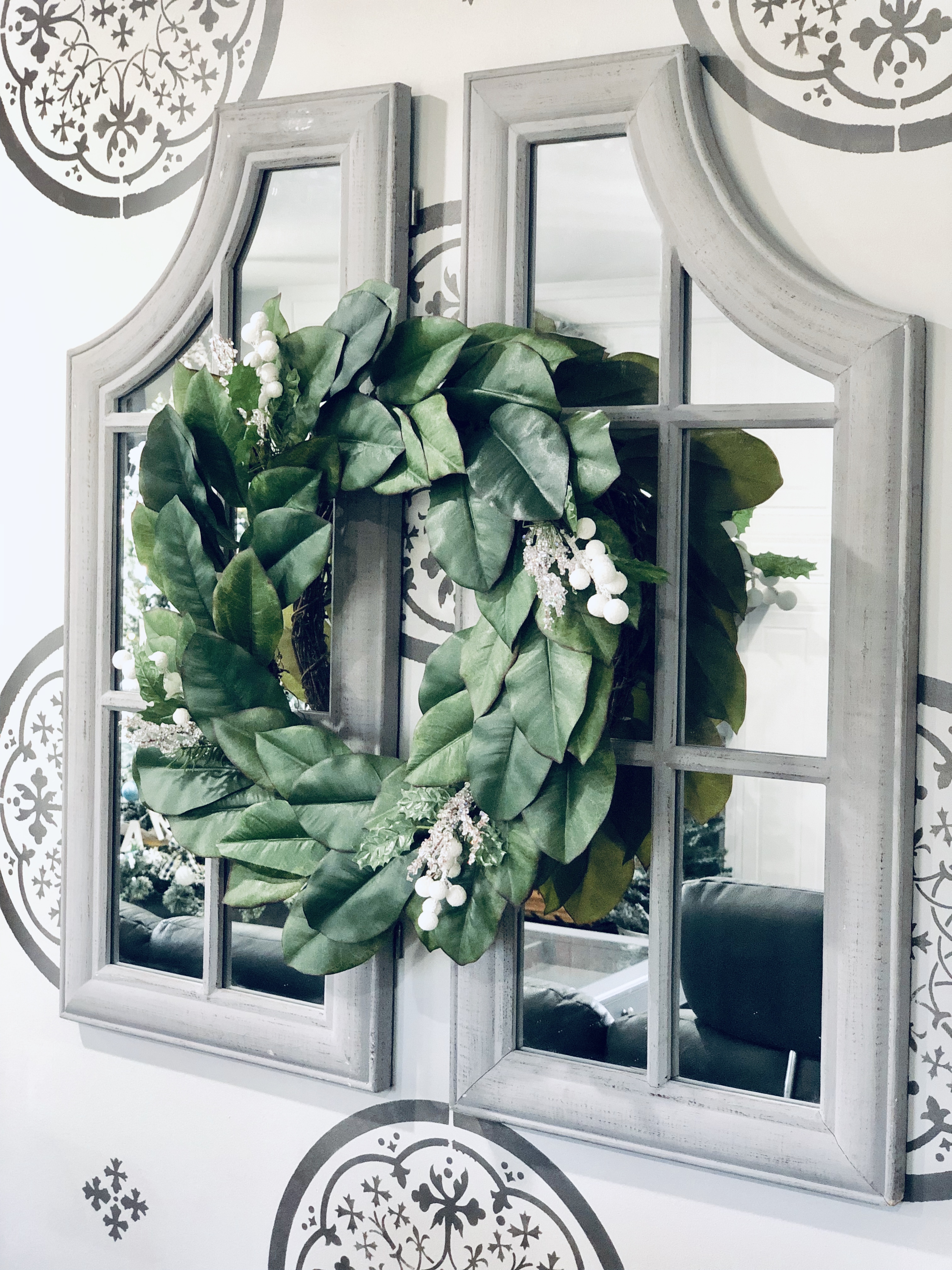 My entryway is one of my favorite spots in the house! Decorated for Christmas it is a real focal point from the front door and I absolutely love that. This area has gone through major changes since we first moved in. It’s still not completely finished, but what really is. The main wall is shiplapped, which you can read here on our DIY Shiplap tutorial on how to do that. The main piece in the Entryway is this sideboard table. This was one of the last pieces I bought while living overseas in Germany. I found it in France, at one of the thrift stores and somehow snuck it into our big PCS move. If you could only have seen Greg’s face when it got off the truck in the states!! lol;) For Christmas, I added a ton of my DIY Scandinavian Wreaths, they are all hanging with twine and fishing wire. The main piece for my sideboard is an old chicken feeder, which I have used as my centerpiece. One of my favorite things to do is to find something old and reuse it for something completely unexpected. You will see that a lot throughout my home.