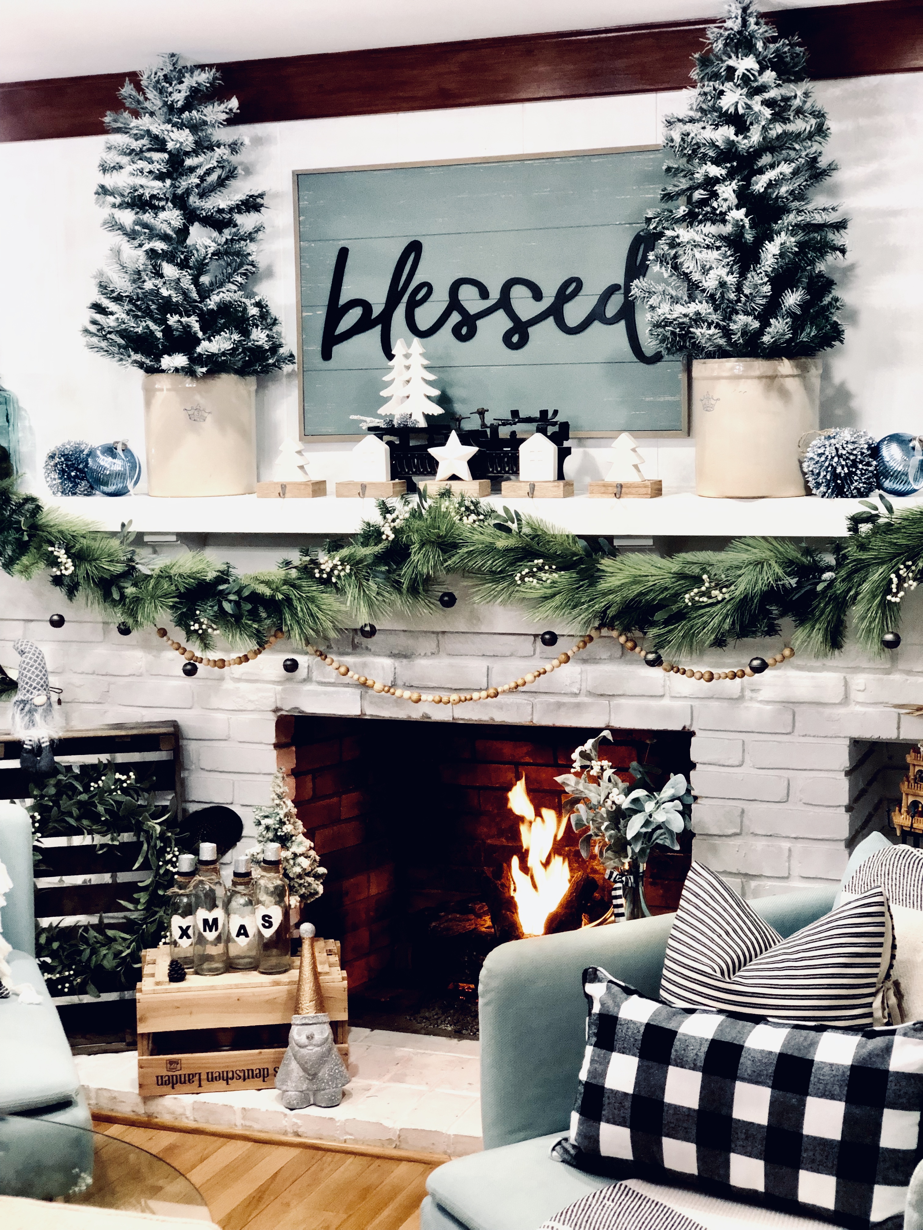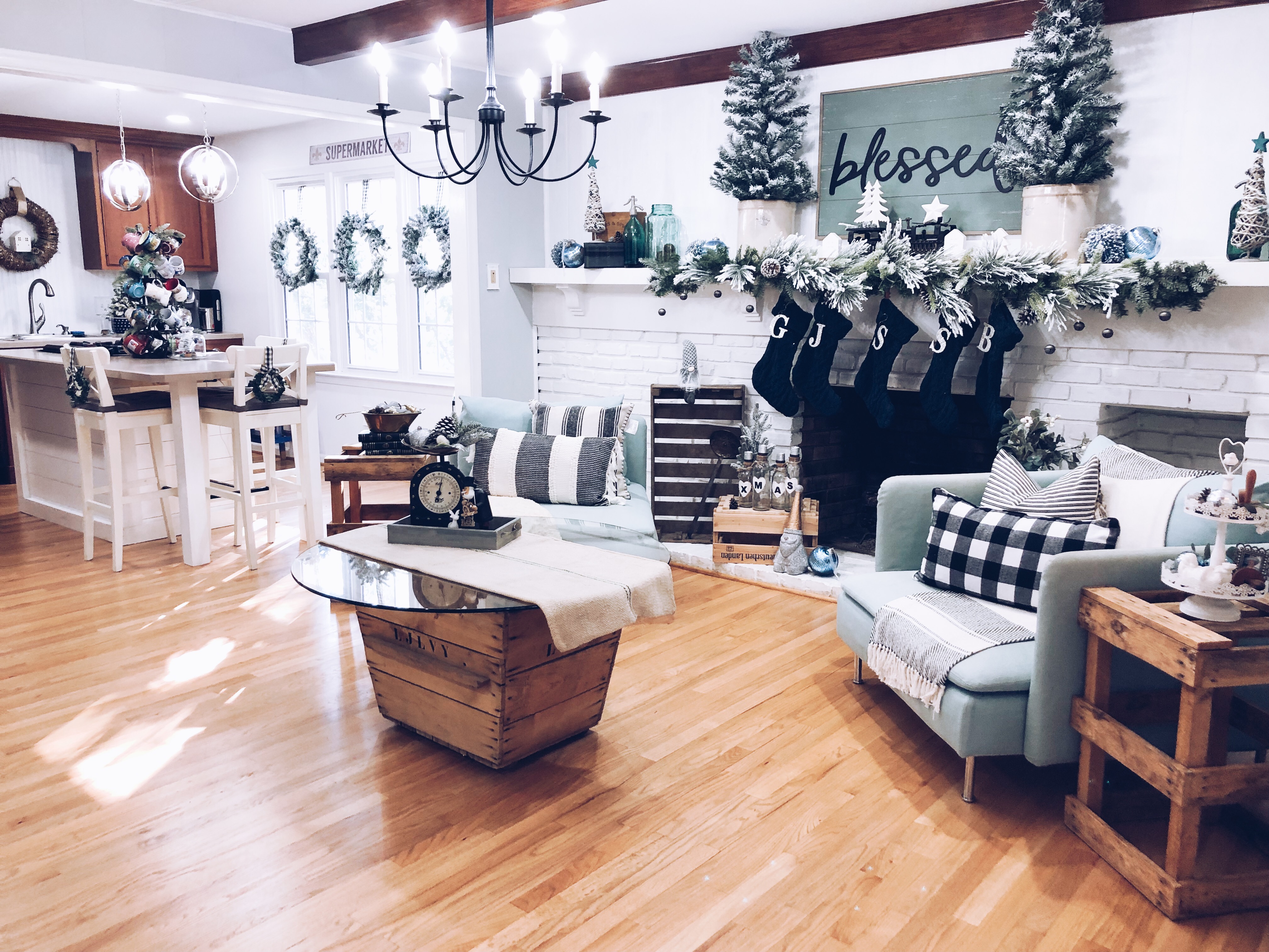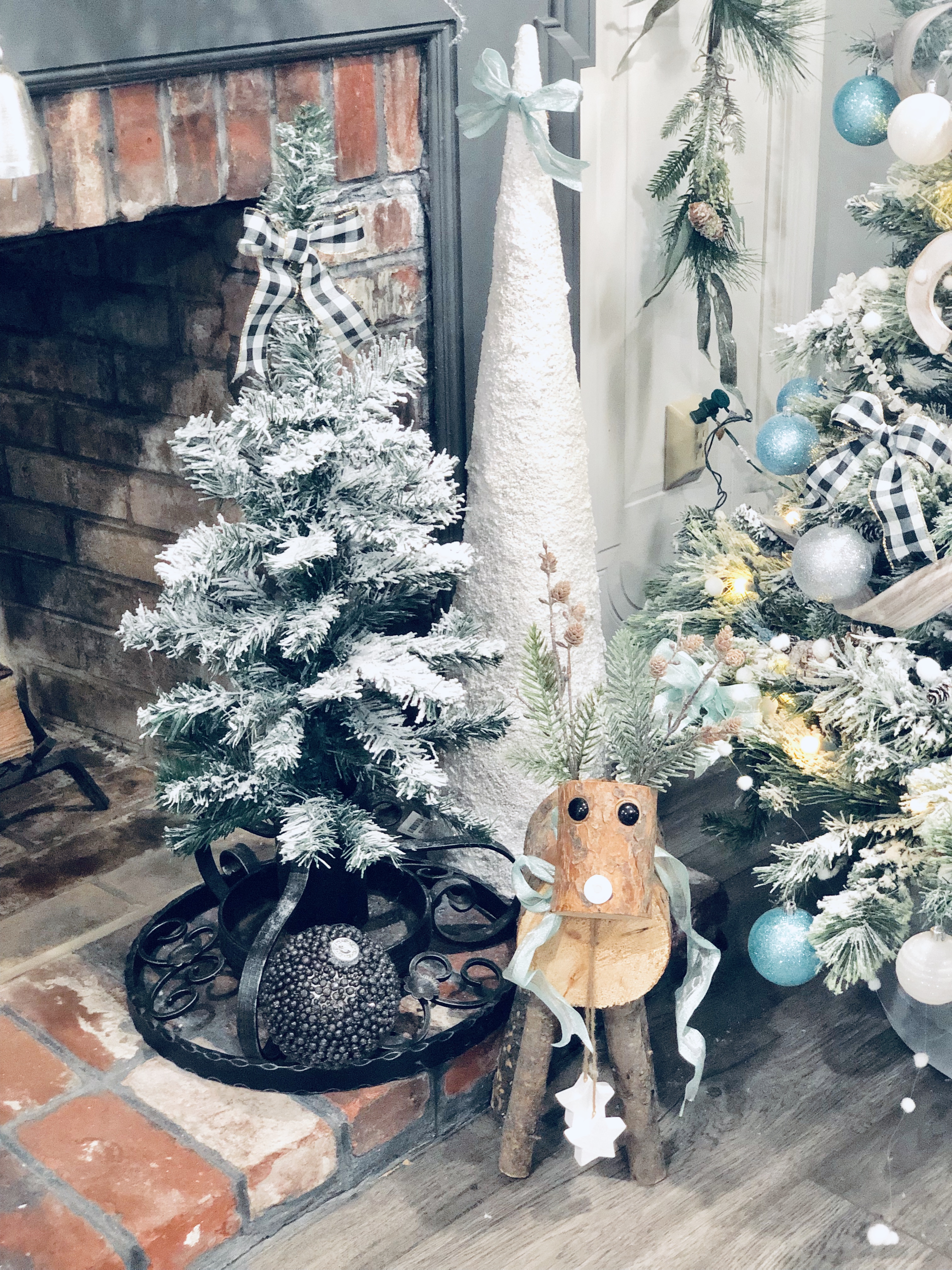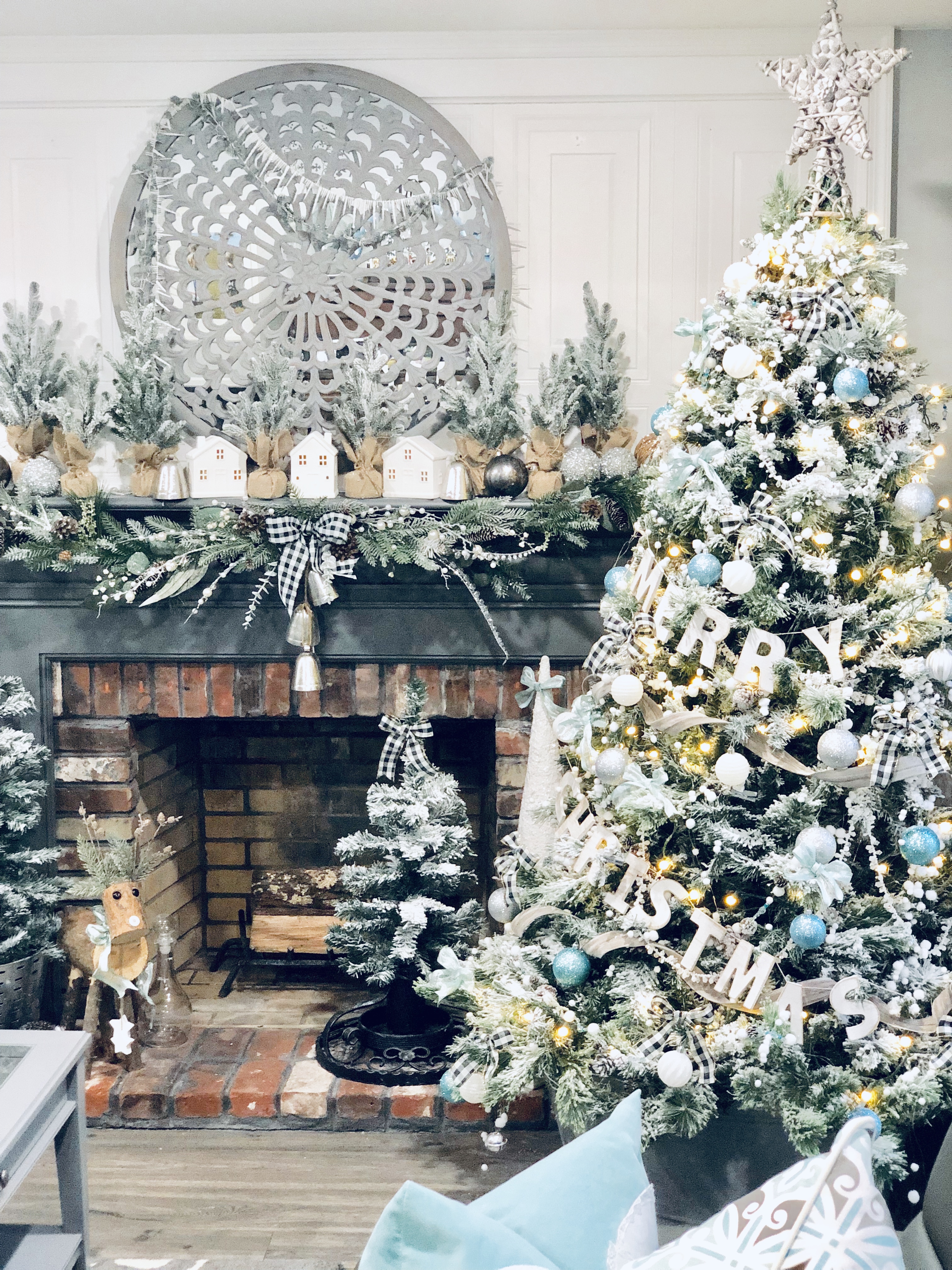 When we bought this house, I loved that their were two fireplaces and one in the Kitchen area. I turned this eat-in Kitchen area into a Sitting Room. There is so much I still want to do to this space, but it was the most finished so I’m waiting till the end to get here. I did a few things though, slowly. The wood beams had been painted, so I changed them back to wood color. I also, DIY Shiplapped the Kitchen Island, added pendent lights above the Island and of course painted the walls, trim and ceilings. For Christmas, well actually all year I love decorating this mantel. That is why I changed it into a sitting room, when I had a dining room table in this space it blocked the entire area and really took away from a great focal point. I added a few of my DIY Flocked Trees and Wreaths into this space as well. Have you been counting? That’s 10 little trees and 8 wreaths… Lol!