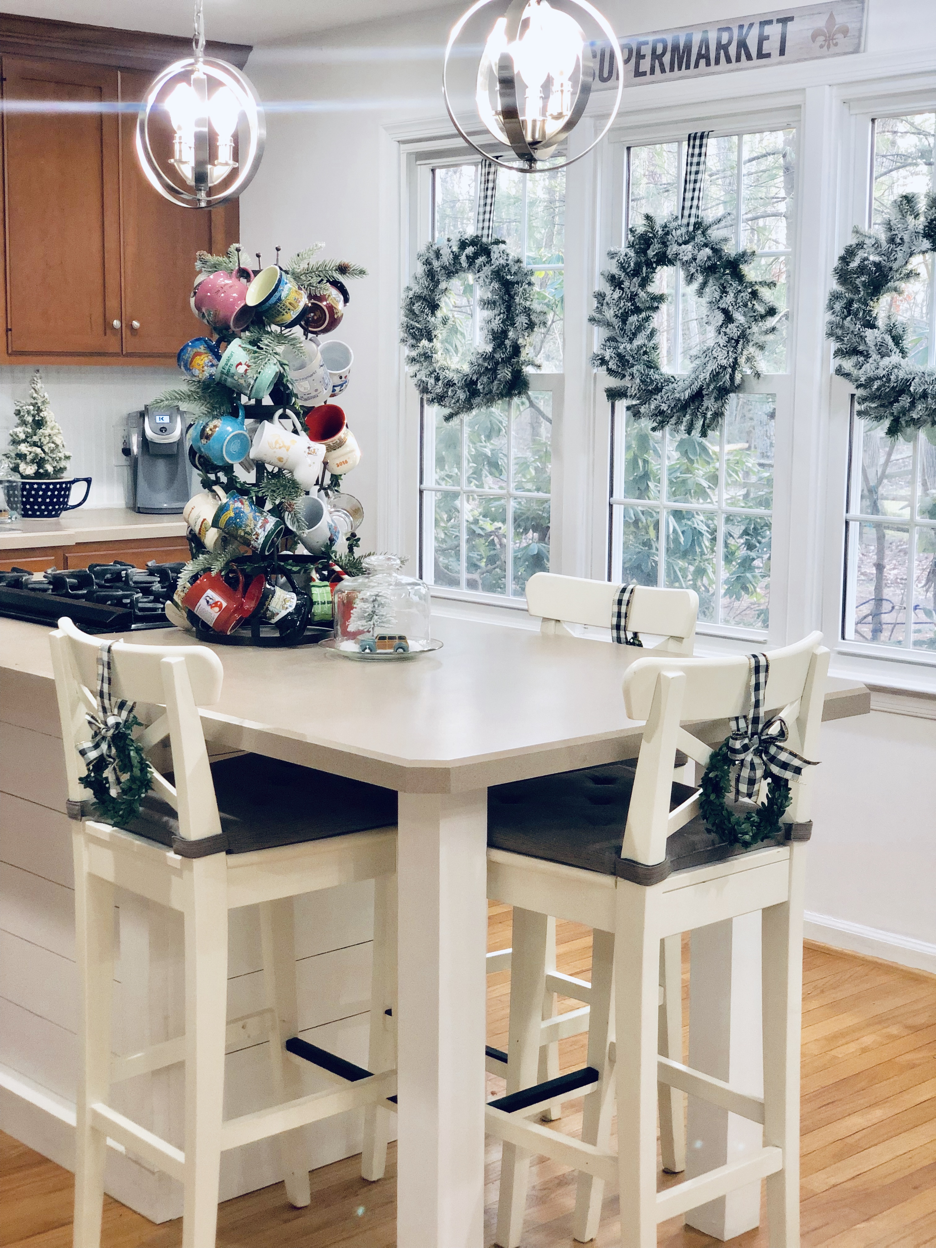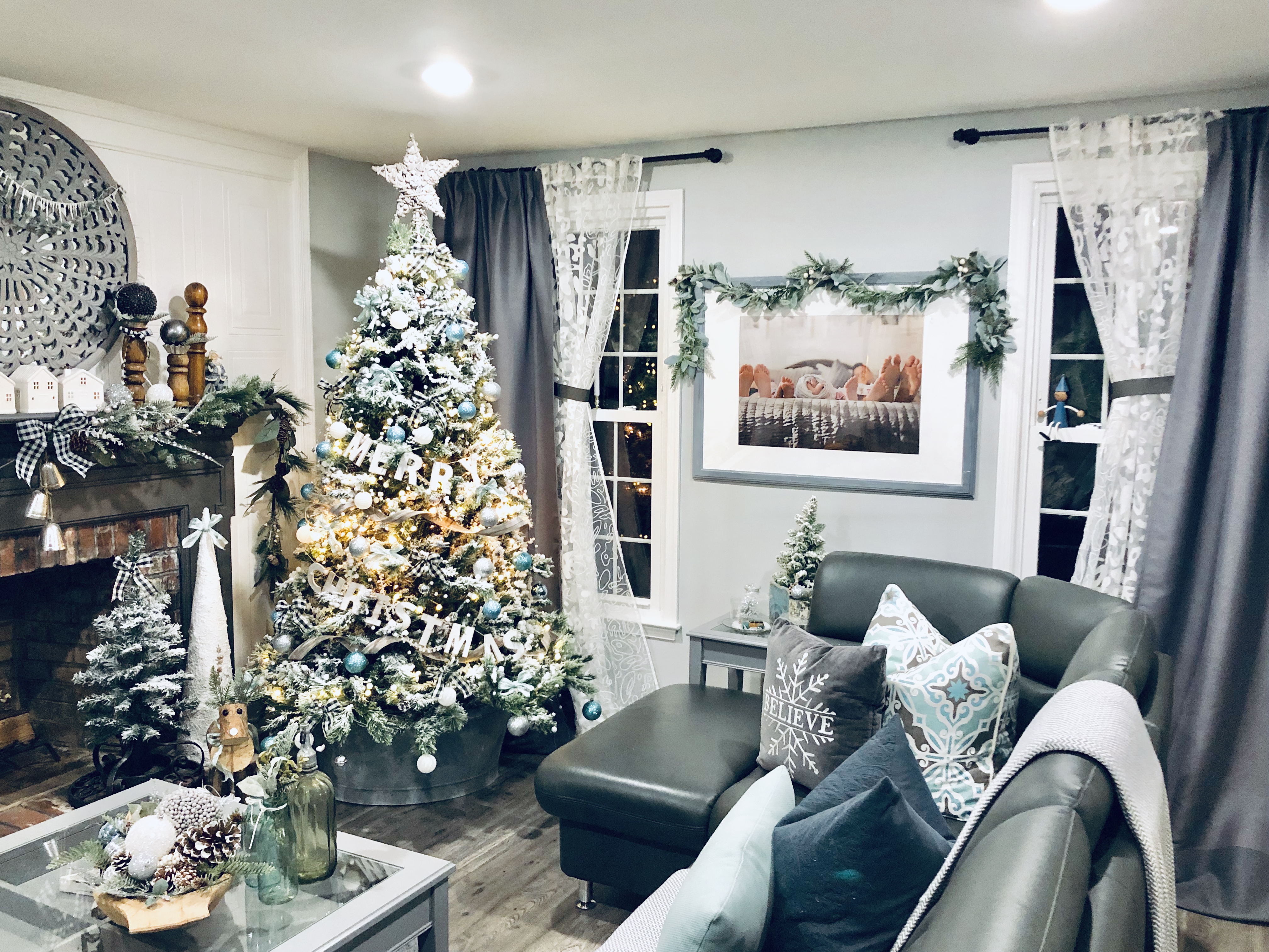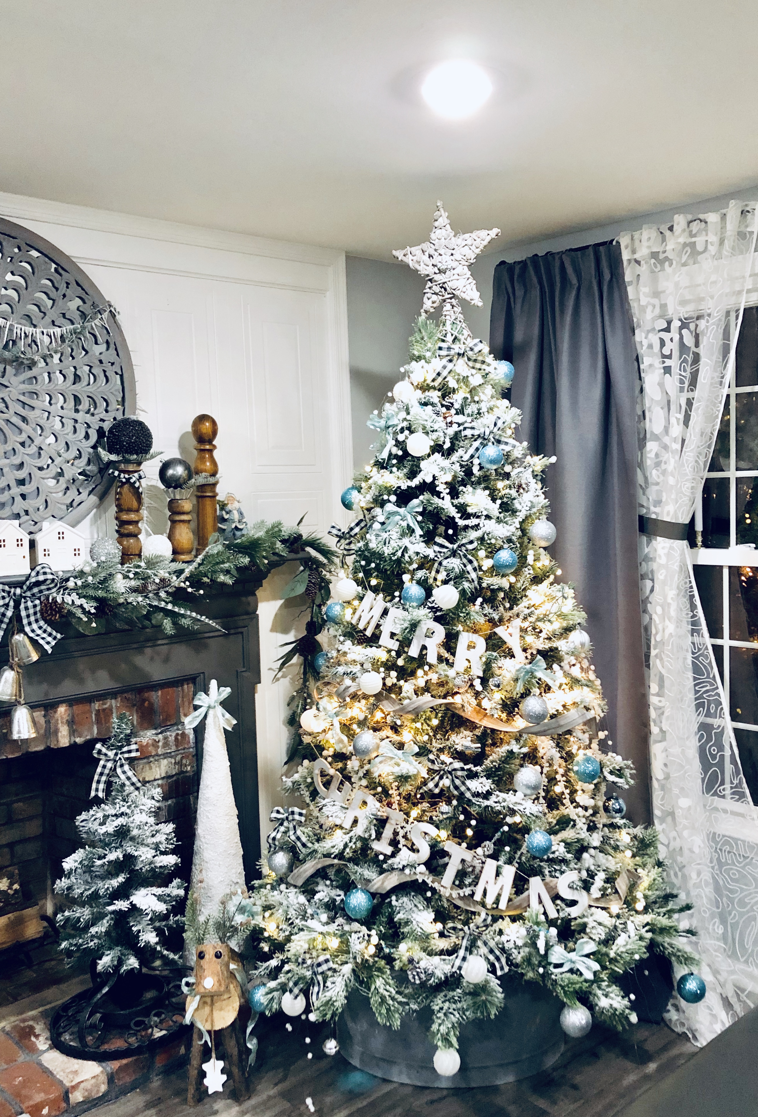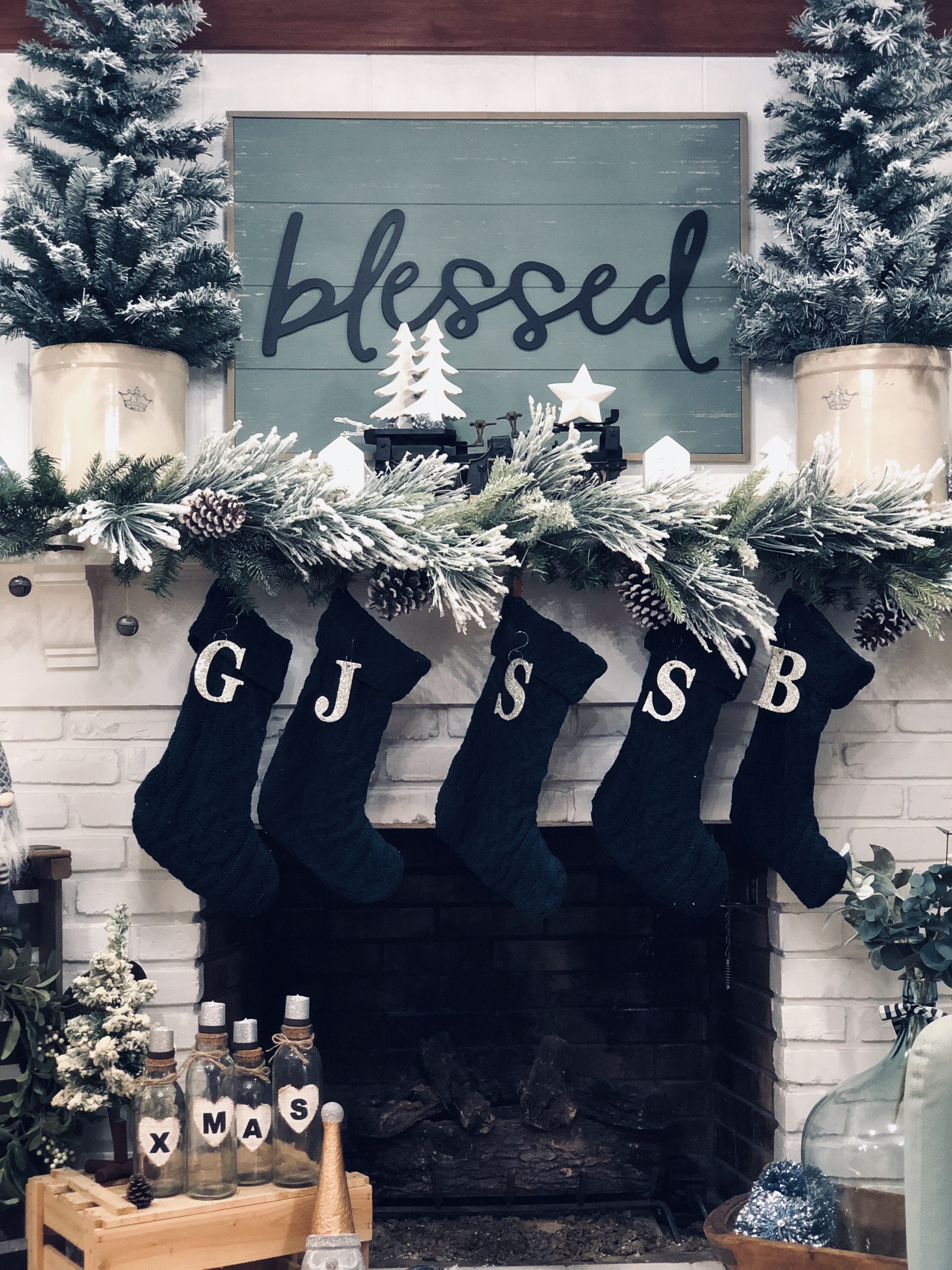 When we bought this house, I loved that their were two fireplaces and one in the Kitchen area. I turned this eat-in Kitchen area into a Sitting Room. There is so much I still want to do to this space, but it was the most finished so I’m waiting till the end to get here. I did a few things though, slowly. The wood beams had been painted, so I changed them back to wood color. I also, DIY Shiplapped the Kitchen Island, added pendent lights above the Island and of course painted the walls, trim and ceilings. For Christmas, well actually all year I love decorating this mantel. That is why I changed it into a sitting room, when I had a dining room table in this space it blocked the entire area and really took away from a great focal point. I added a few of my DIY Flocked Trees and Wreaths into this space as well. Have you been counting? That’s 10 little trees and 8 wreaths… Lol!