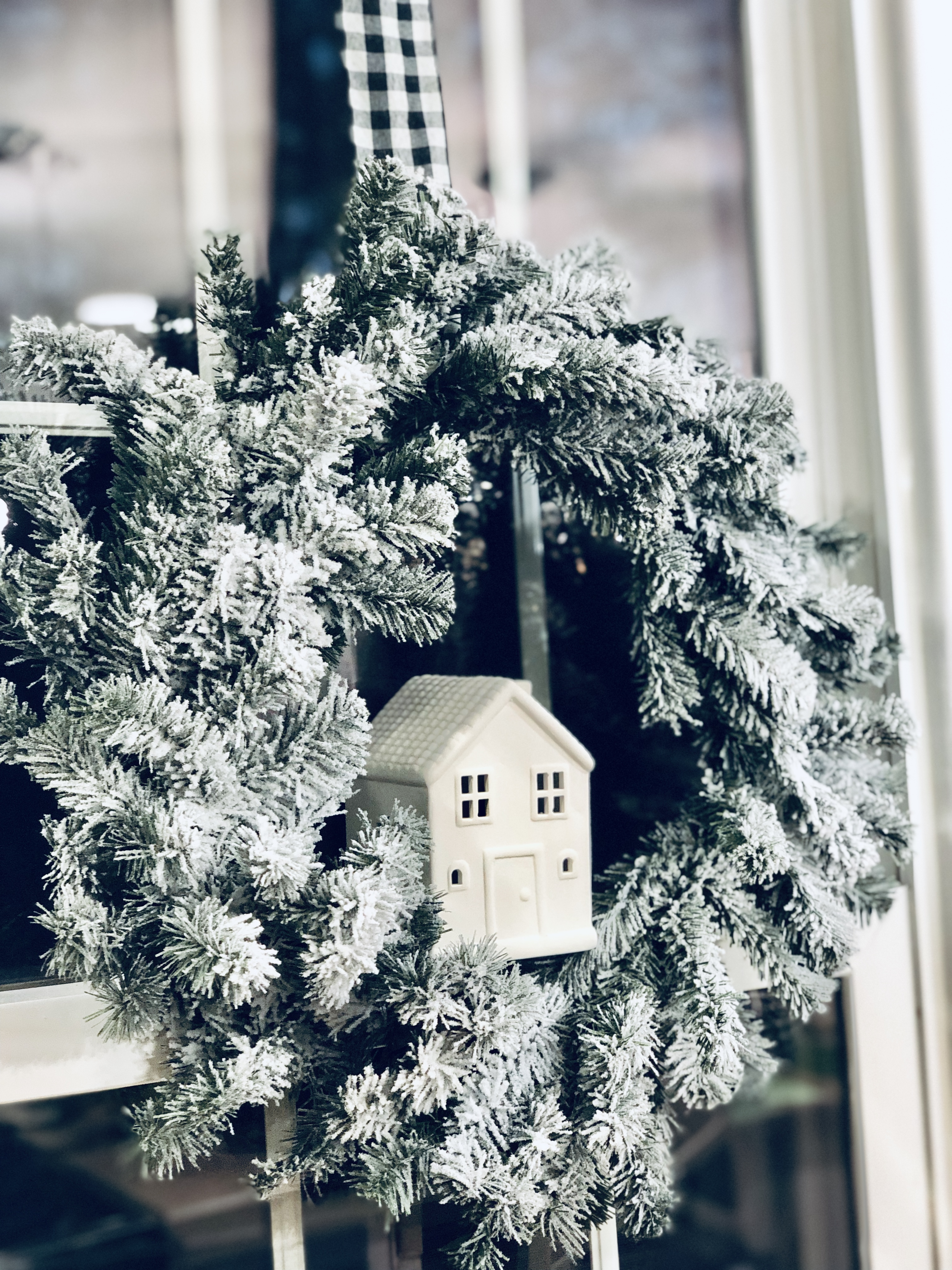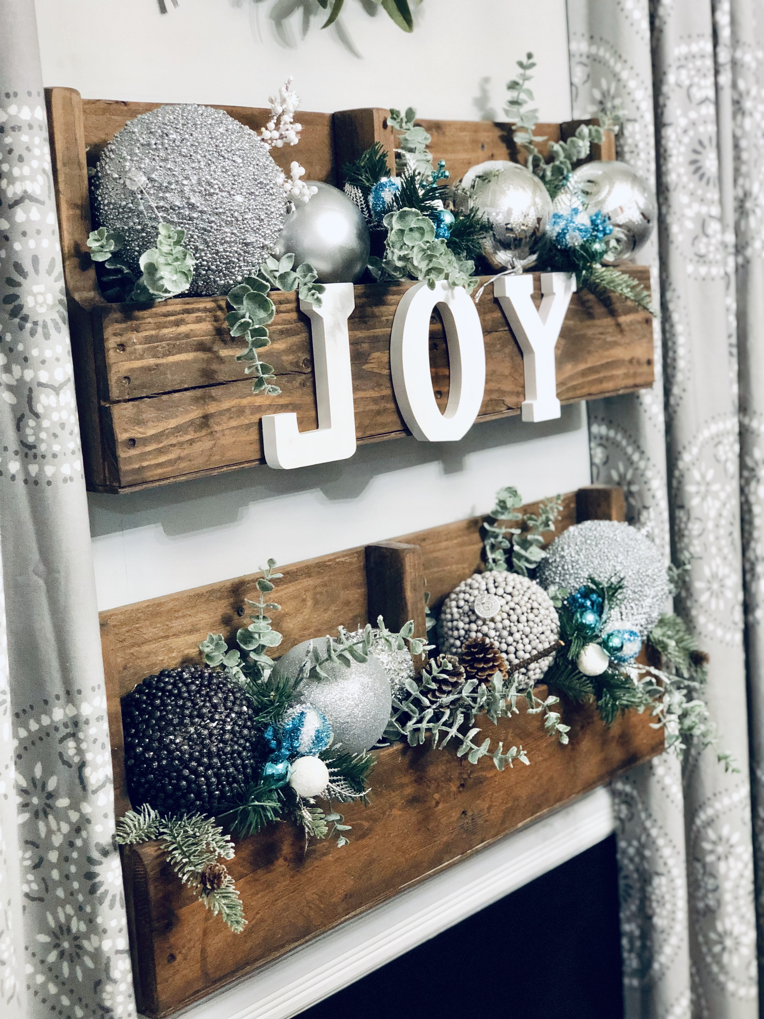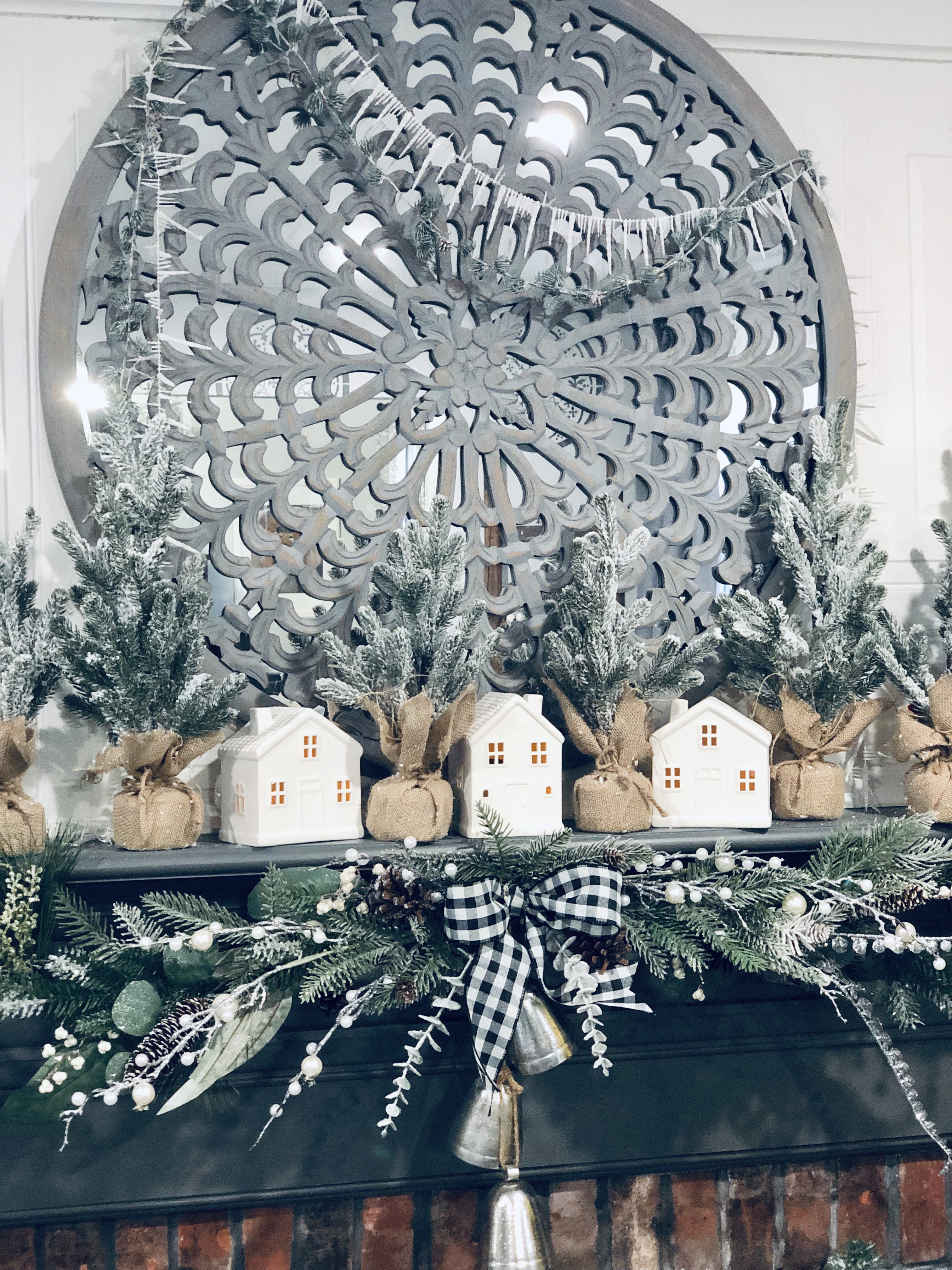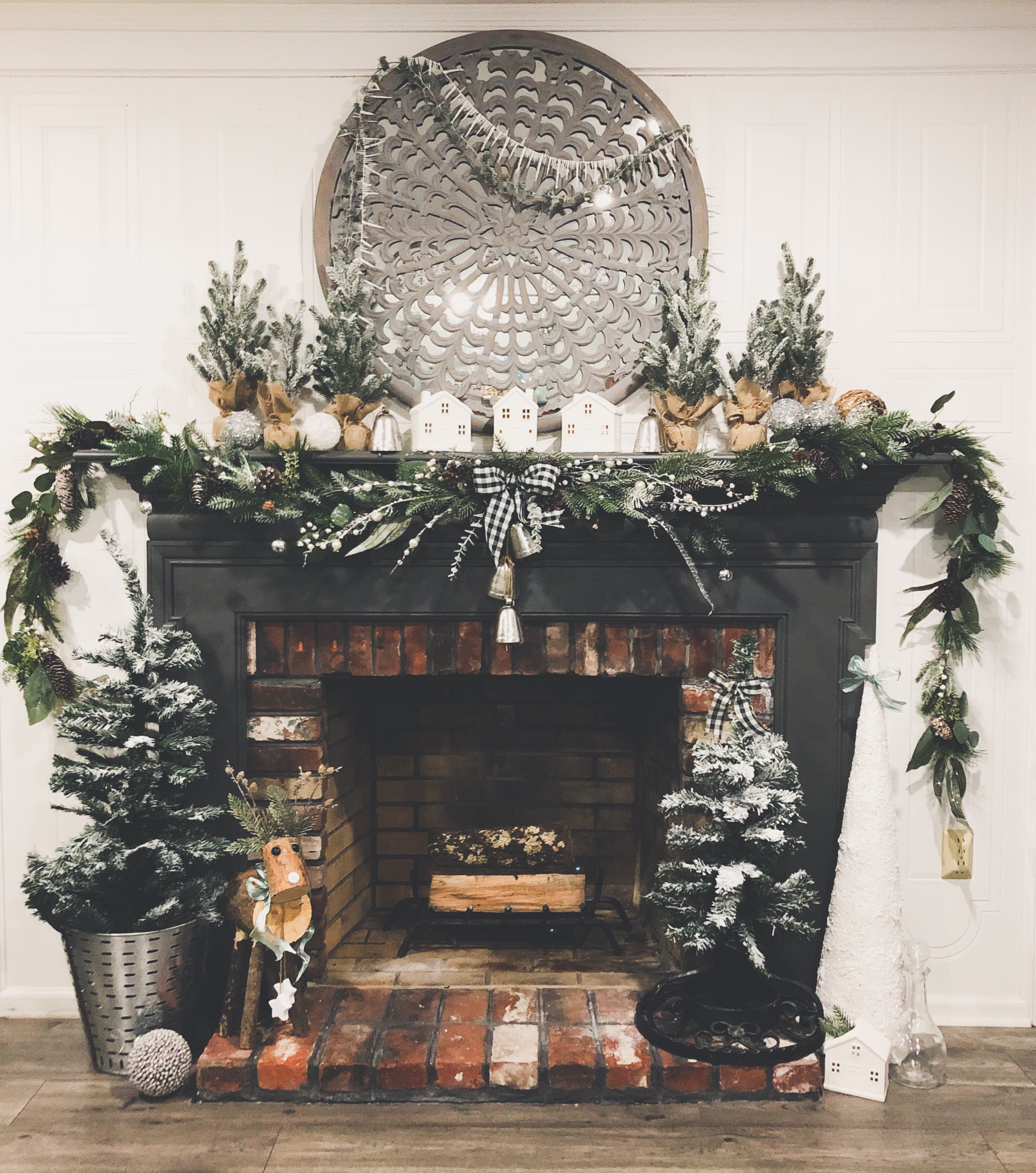 When we bought this house, I loved that their were two fireplaces and one in the Kitchen area. I turned this eat-in Kitchen area into a Sitting Room. There is so much I still want to do to this space, but it was the most finished so I’m waiting till the end to get here. I did a few things though, slowly. The wood beams had been painted, so I changed them back to wood color. I also, DIY Shiplapped the Kitchen Island, added pendent lights above the Island and of course painted the walls, trim and ceilings. For Christmas, well actually all year I love decorating this mantel. That is why I changed it into a sitting room, when I had a dining room table in this space it blocked the entire area and really took away from a great focal point. I added a few of my DIY Flocked Trees and Wreaths into this space as well. Have you been counting? That’s 10 little trees and 8 wreaths… Lol!