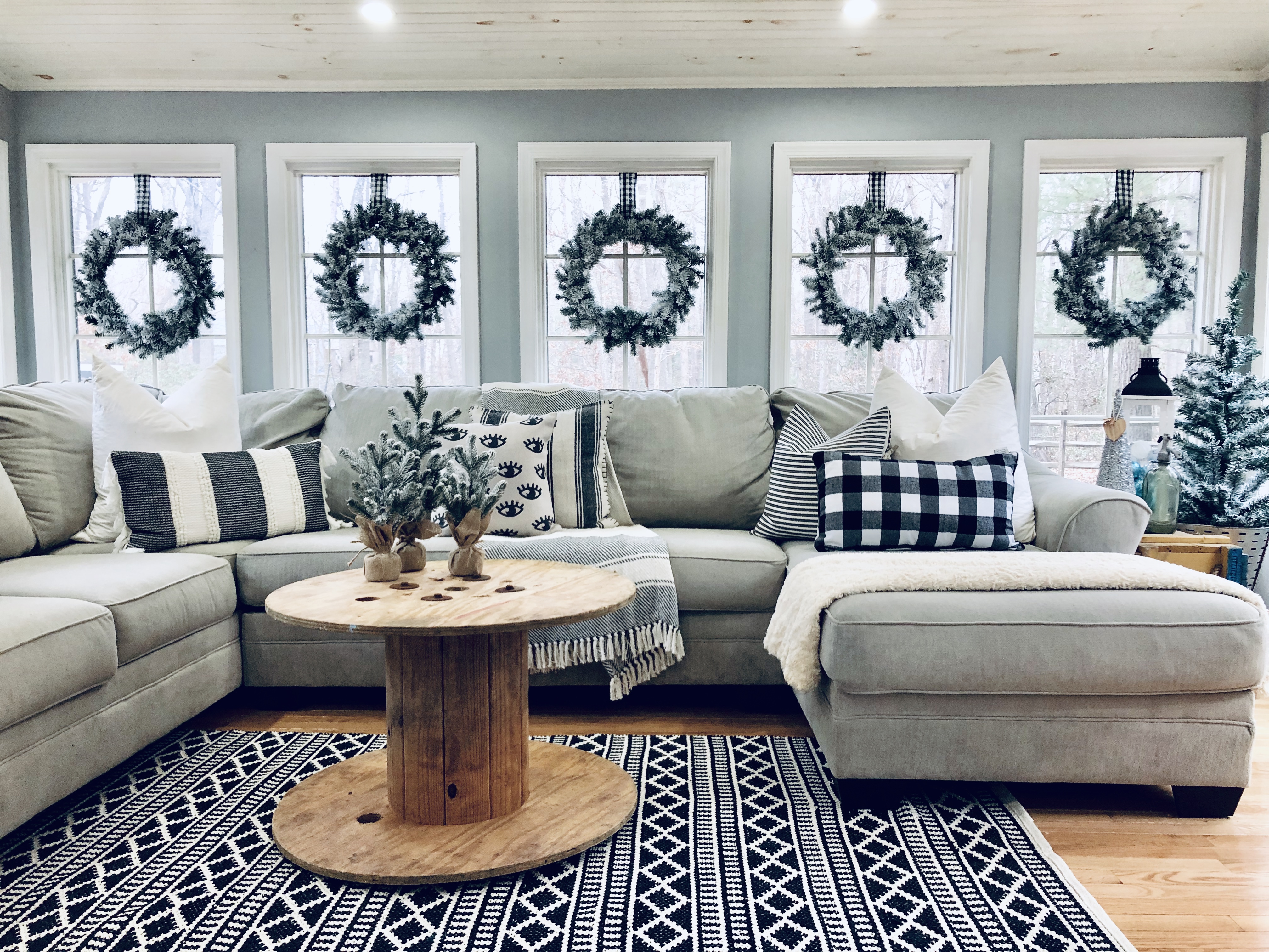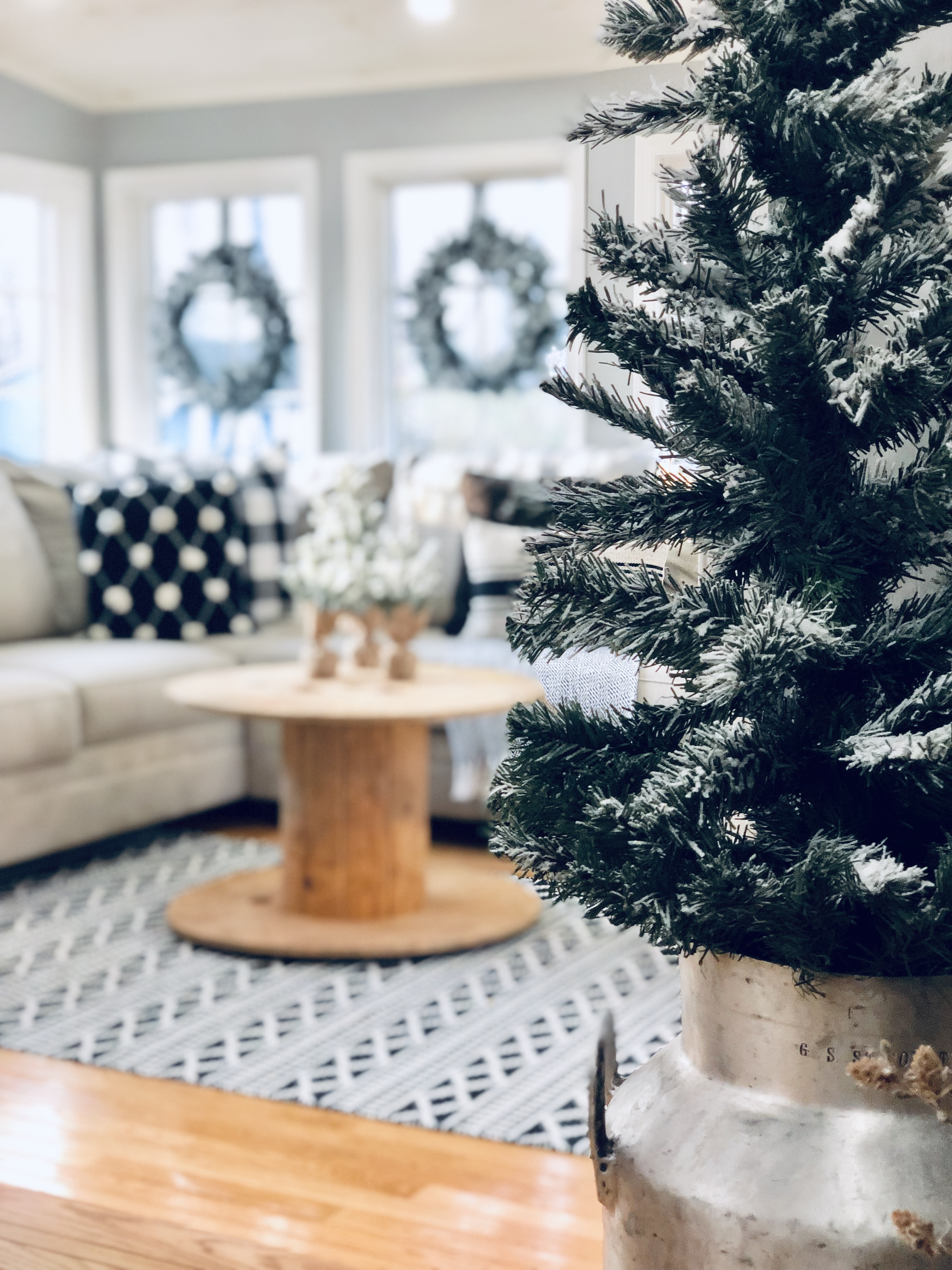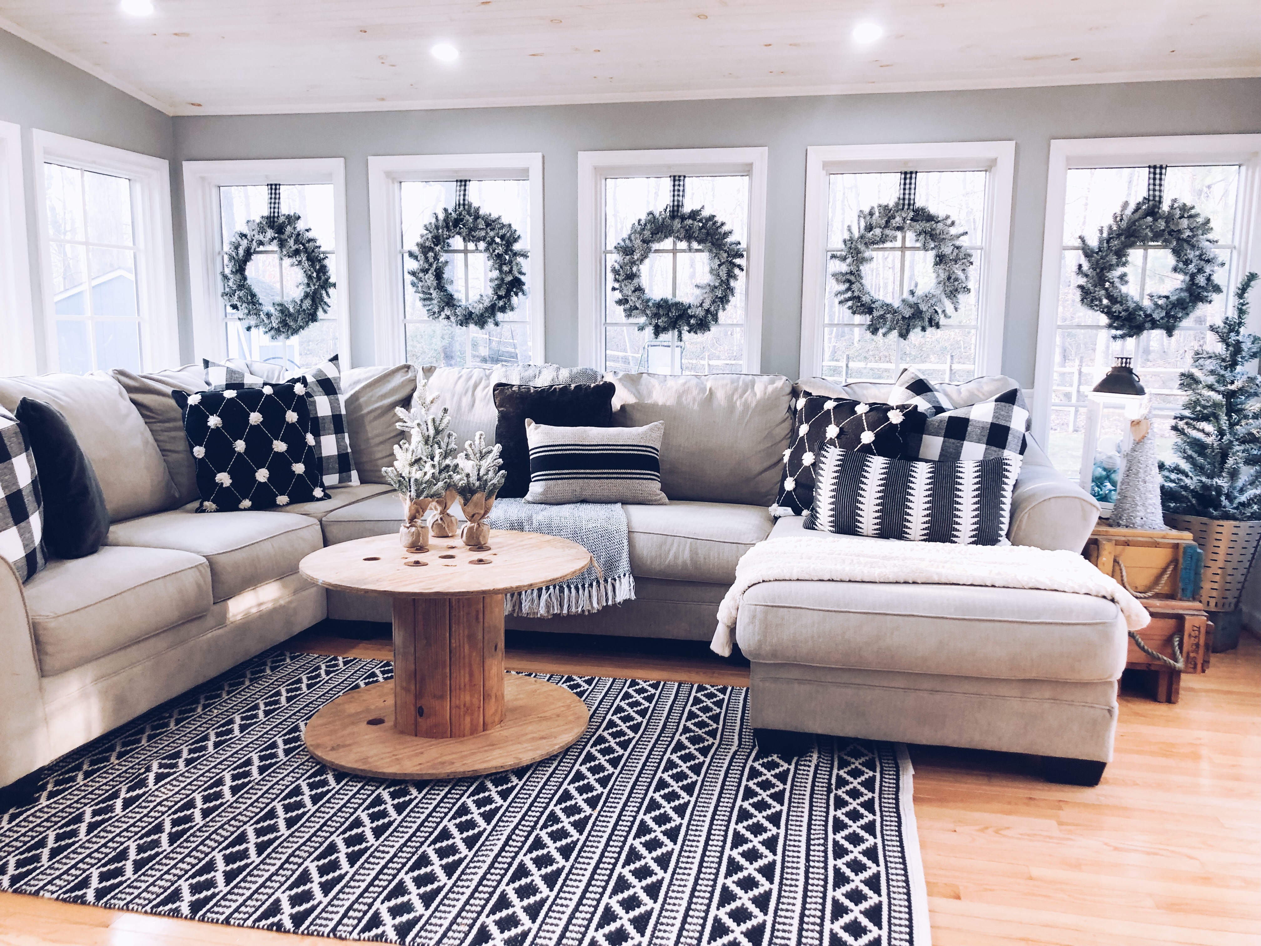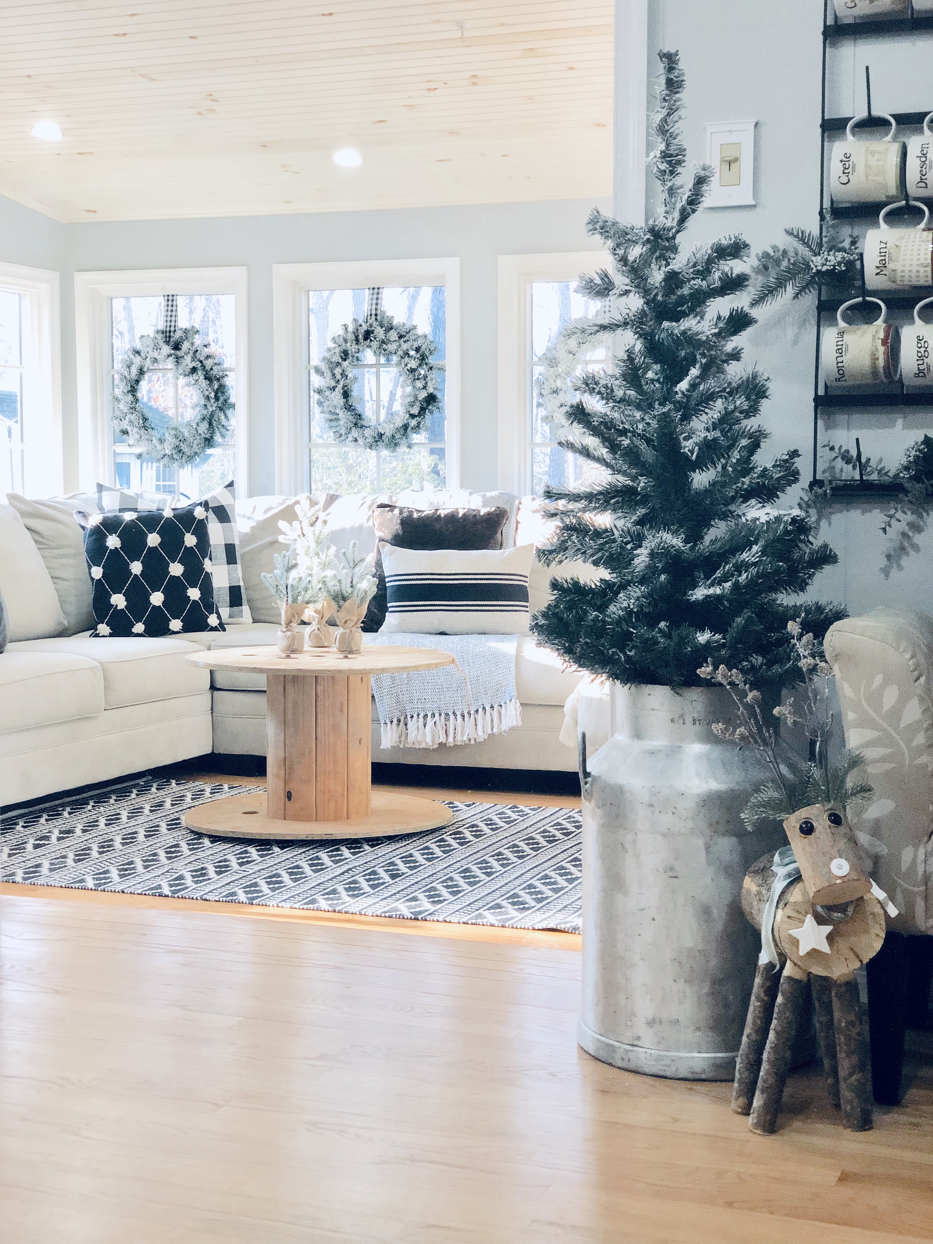 This is one of the best rooms in the house and a room I knew it would be well loved. You don’t see it much, because it has been a work in progress. Also, it’s the most lived in room in the whole house!! 😉 I used most of my DIY Flocked wreaths in this room, because it is filled with windows. I’ve reused a bunch of stuff in this room. Ammo boxes are my end tables and an old wooden spool, which I found at the Farm Sale I went to with my grandfather is the coffee table. Everyone laughed as I pushed it away, but I said I would find something amazing to do with it…and it really finishes this room.