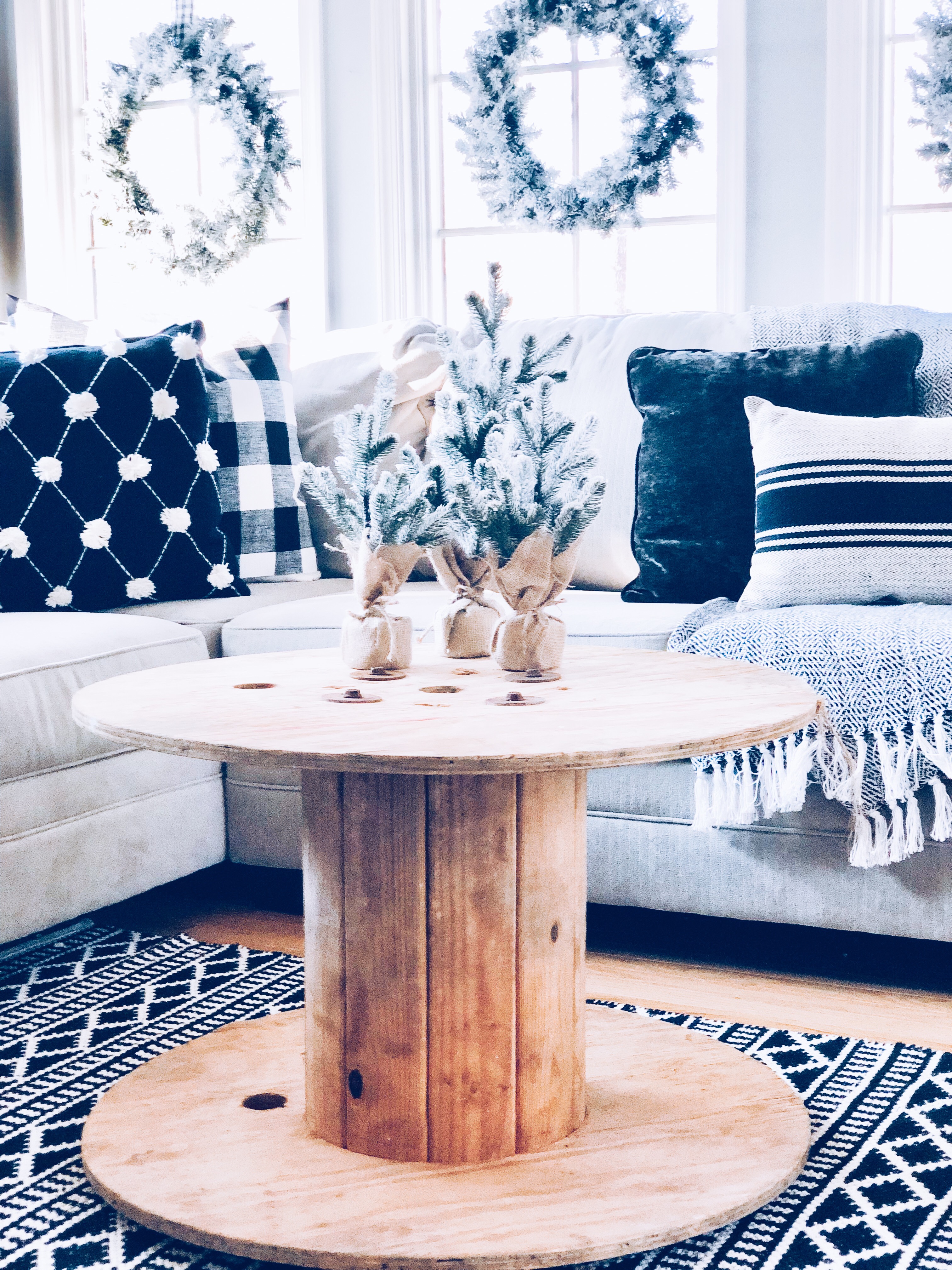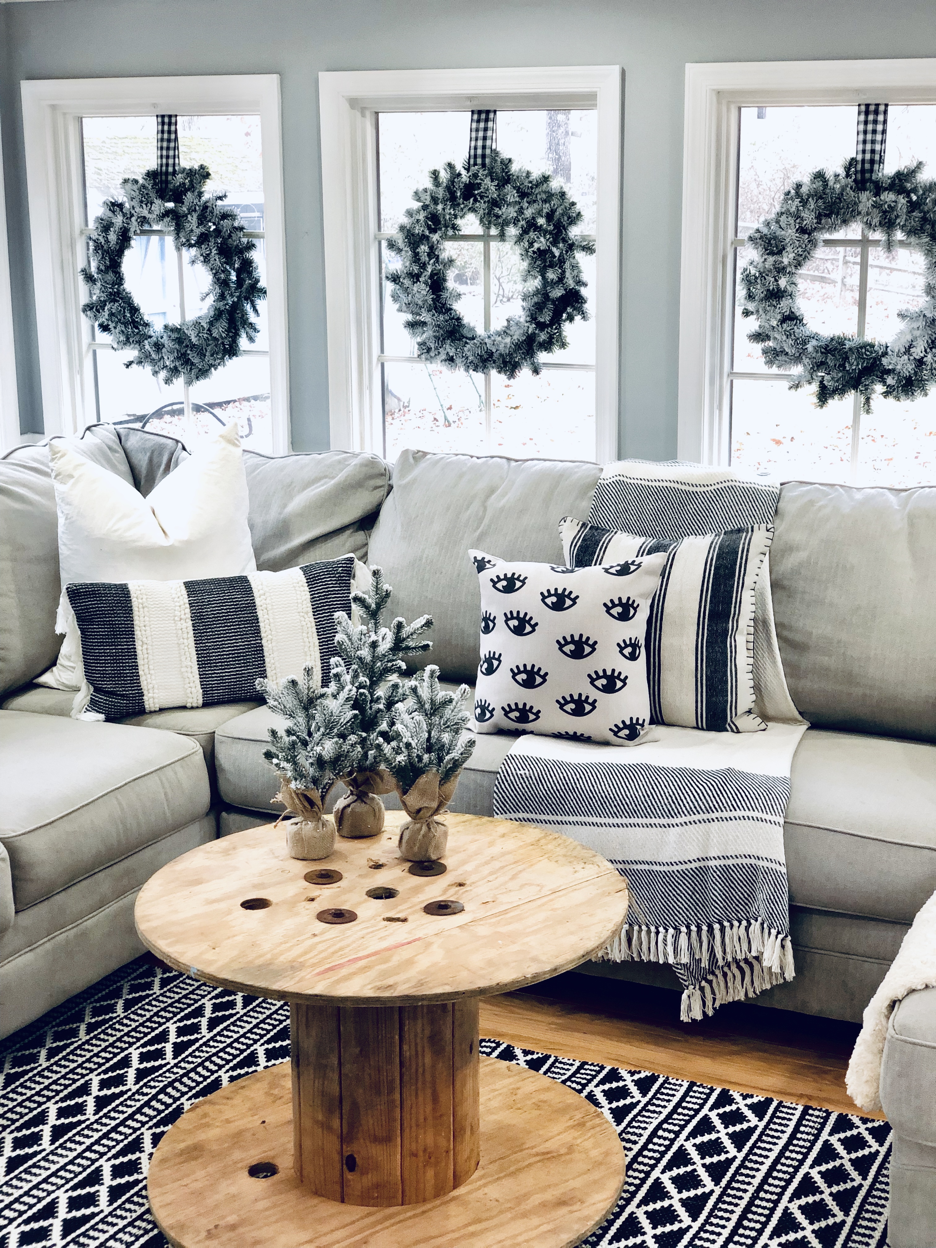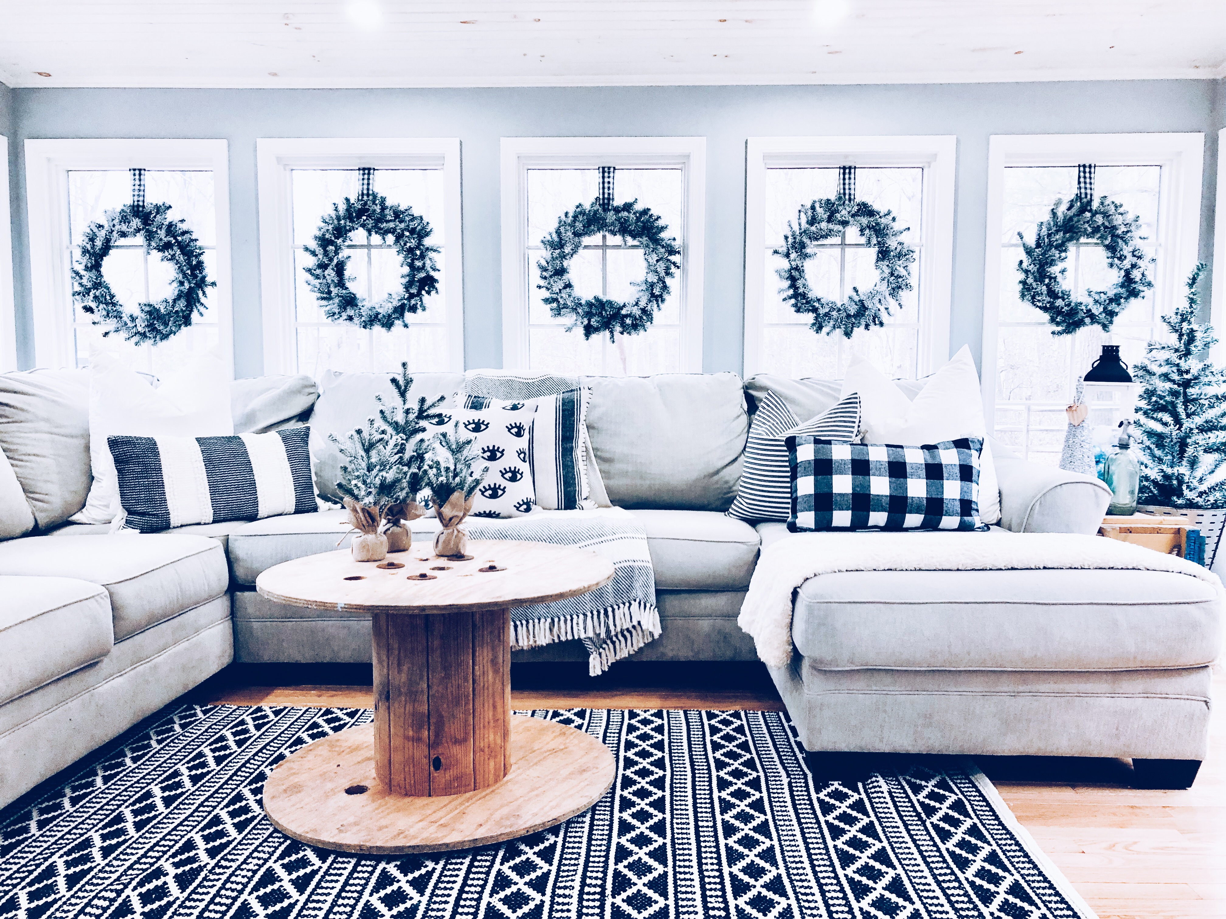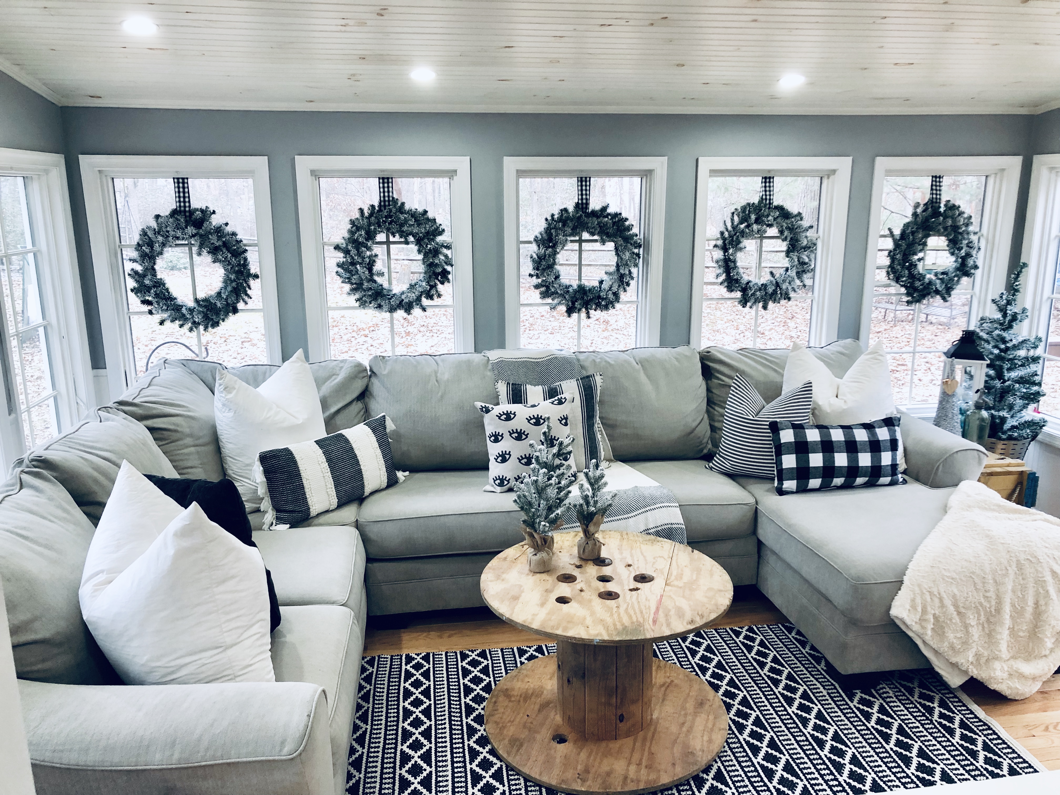This is one of the best rooms in the house and a room I knew it would be well loved. You don’t see it much, because it has been a work in progress. Also, it’s the most lived in room in the whole house!! 😉 I used most of my DIY Flocked wreaths in this room, because it is filled with windows. I’ve reused a bunch of stuff in this room. Ammo boxes are my end tables and an old wooden spool, which I found at the Farm Sale I went to with my grandfather is the coffee table. Everyone laughed as I pushed it away, but I said I would find something amazing to do with it…and it really finishes this room.