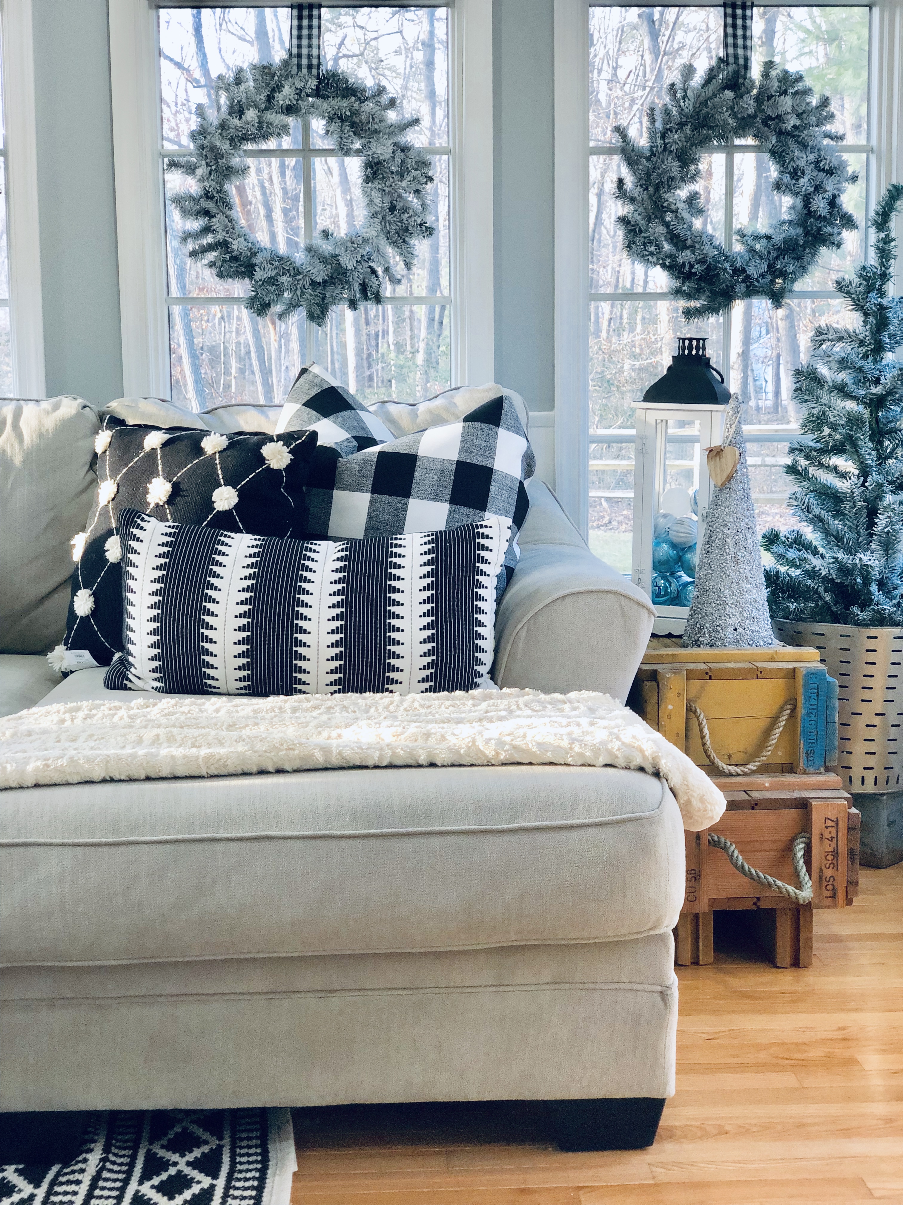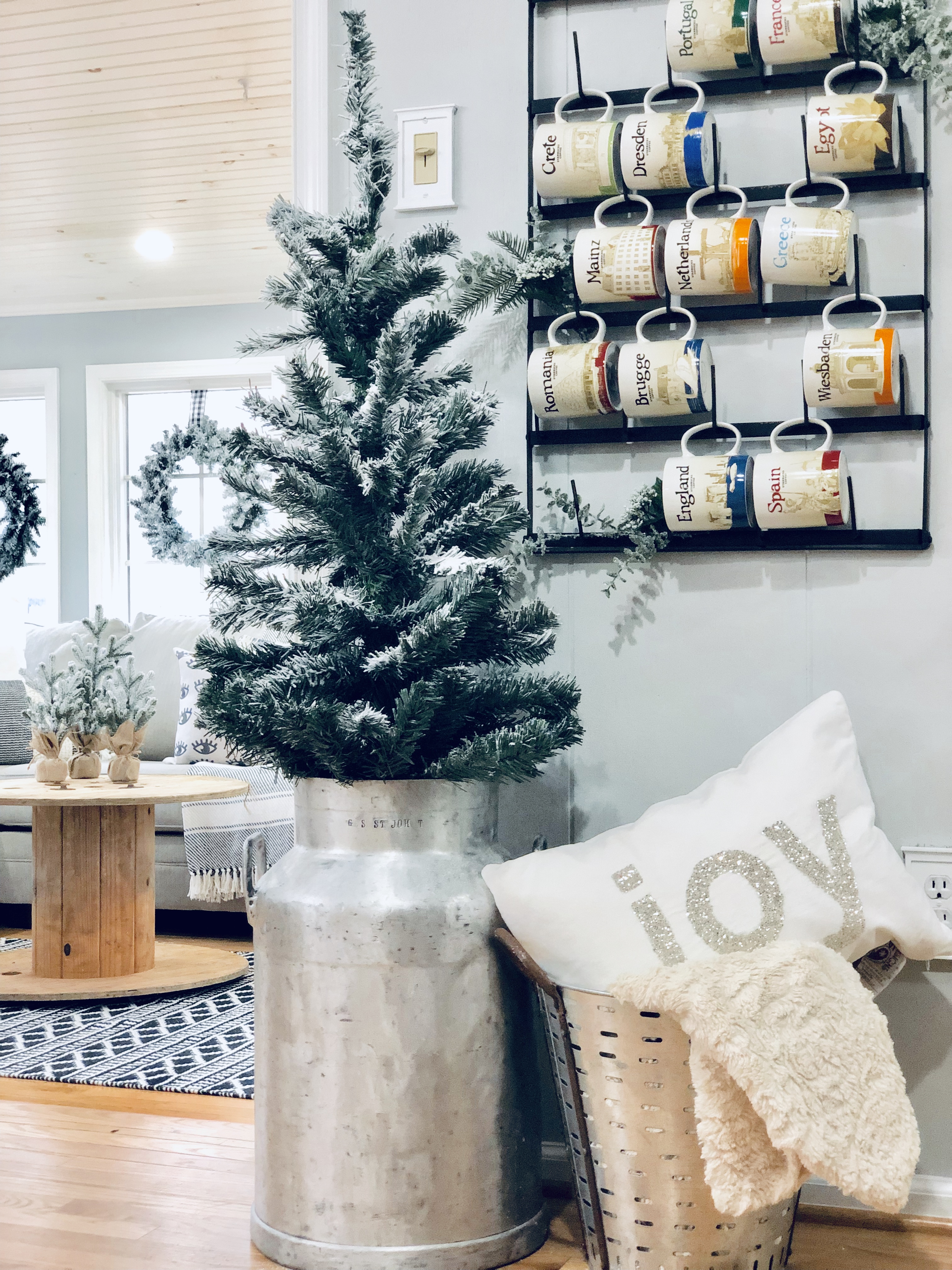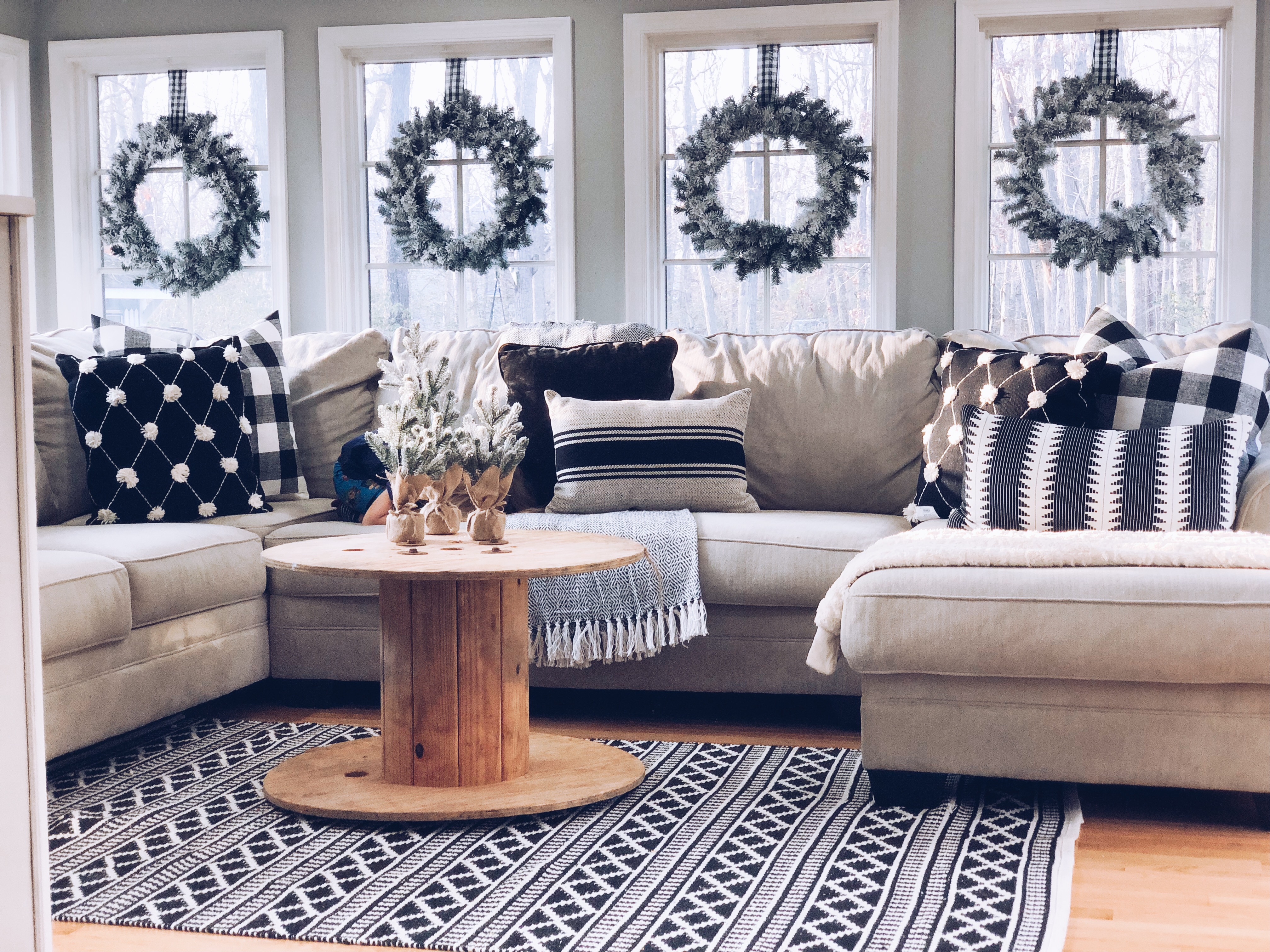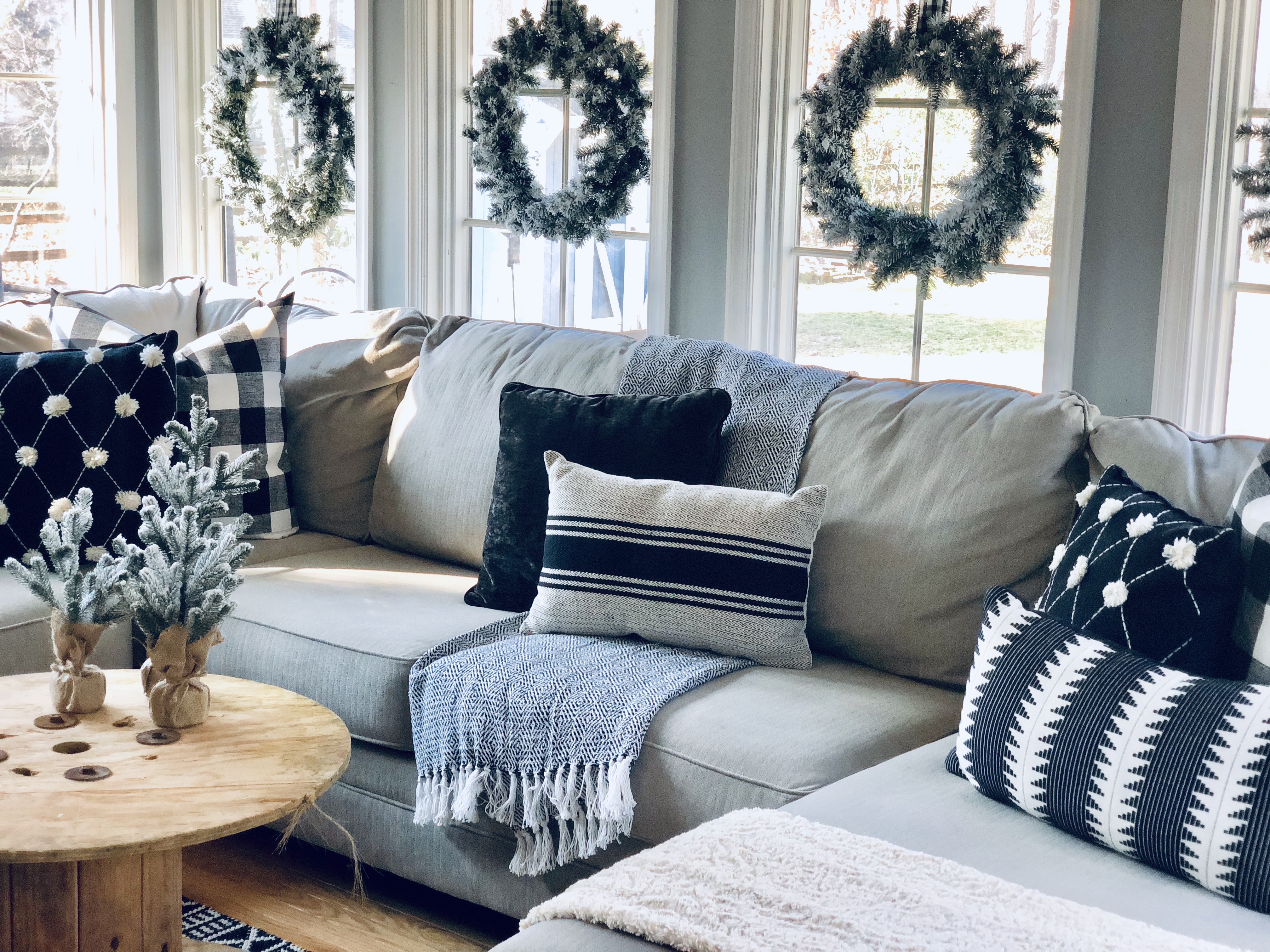 This is one of the best rooms in the house and a room I knew it would be well loved. You don’t see it much, because it has been a work in progress. Also, it’s the most lived in room in the whole house!! 😉 I used most of my DIY Flocked wreaths in this room, because it is filled with windows. I’ve reused a bunch of stuff in this room. Ammo boxes are my end tables and an old wooden spool, which I found at the Farm Sale I went to with my grandfather is the coffee table. Everyone laughed as I pushed it away, but I said I would find something amazing to do with it…and it really finishes this room.