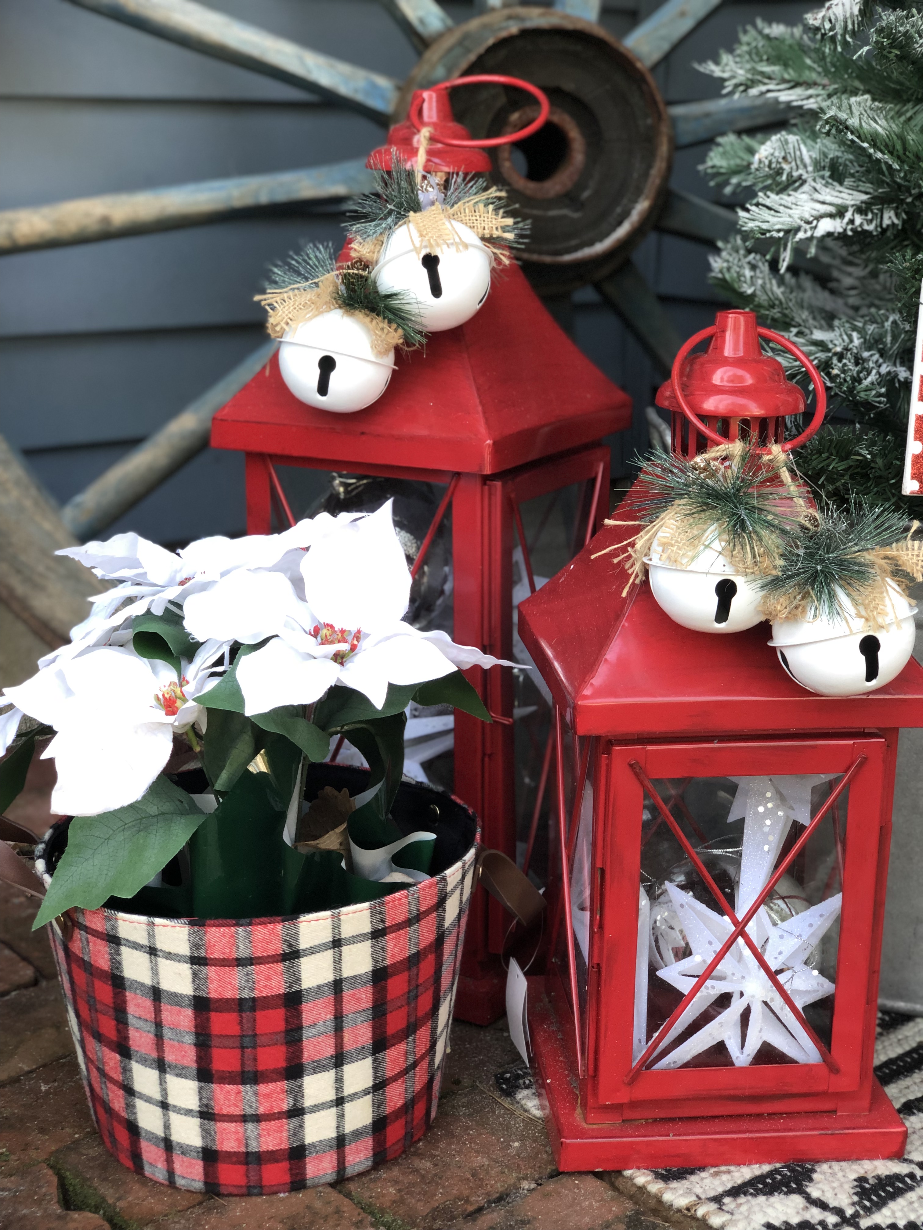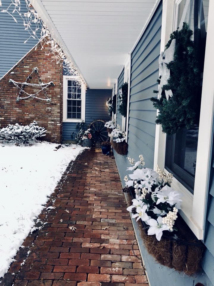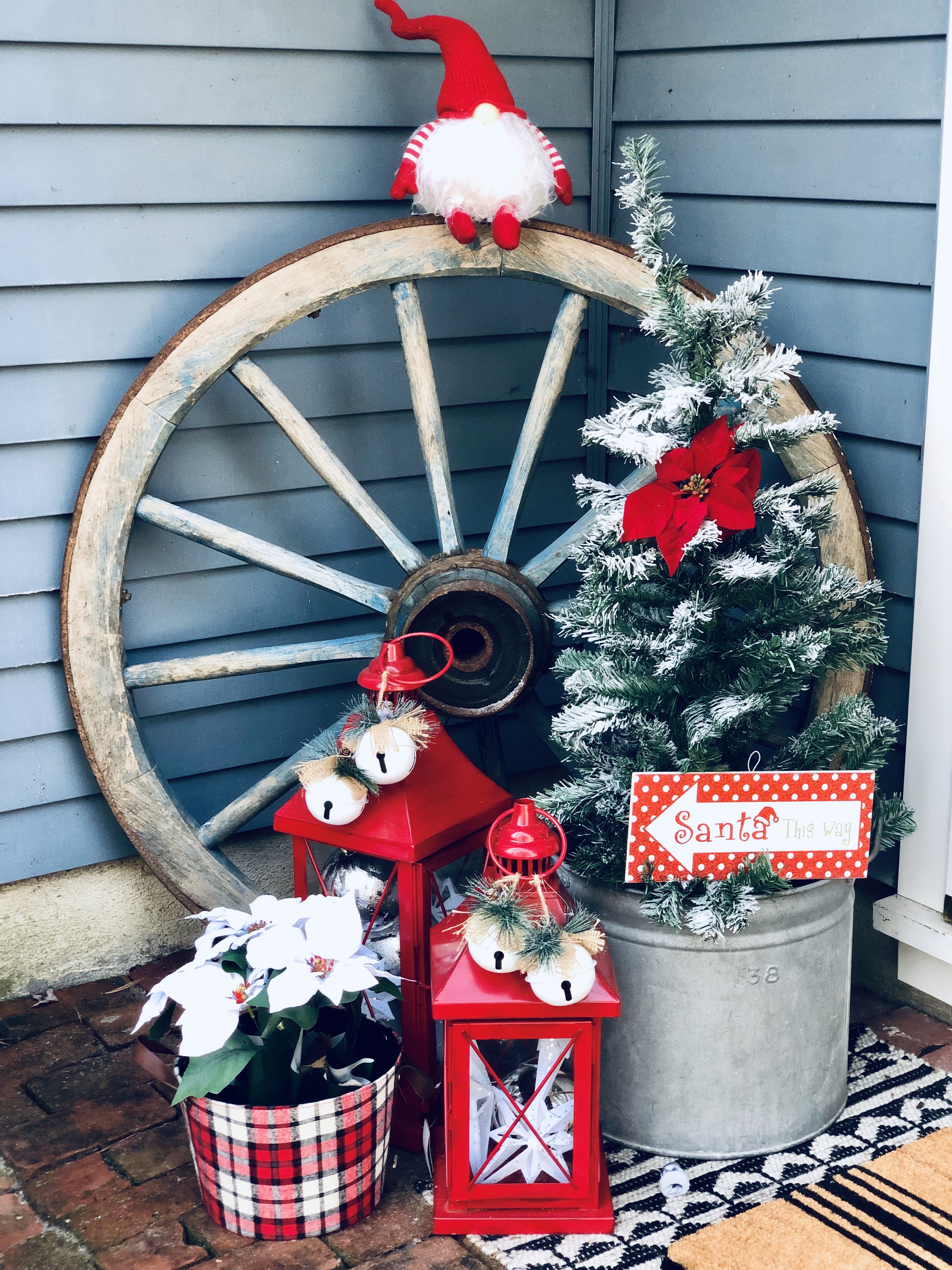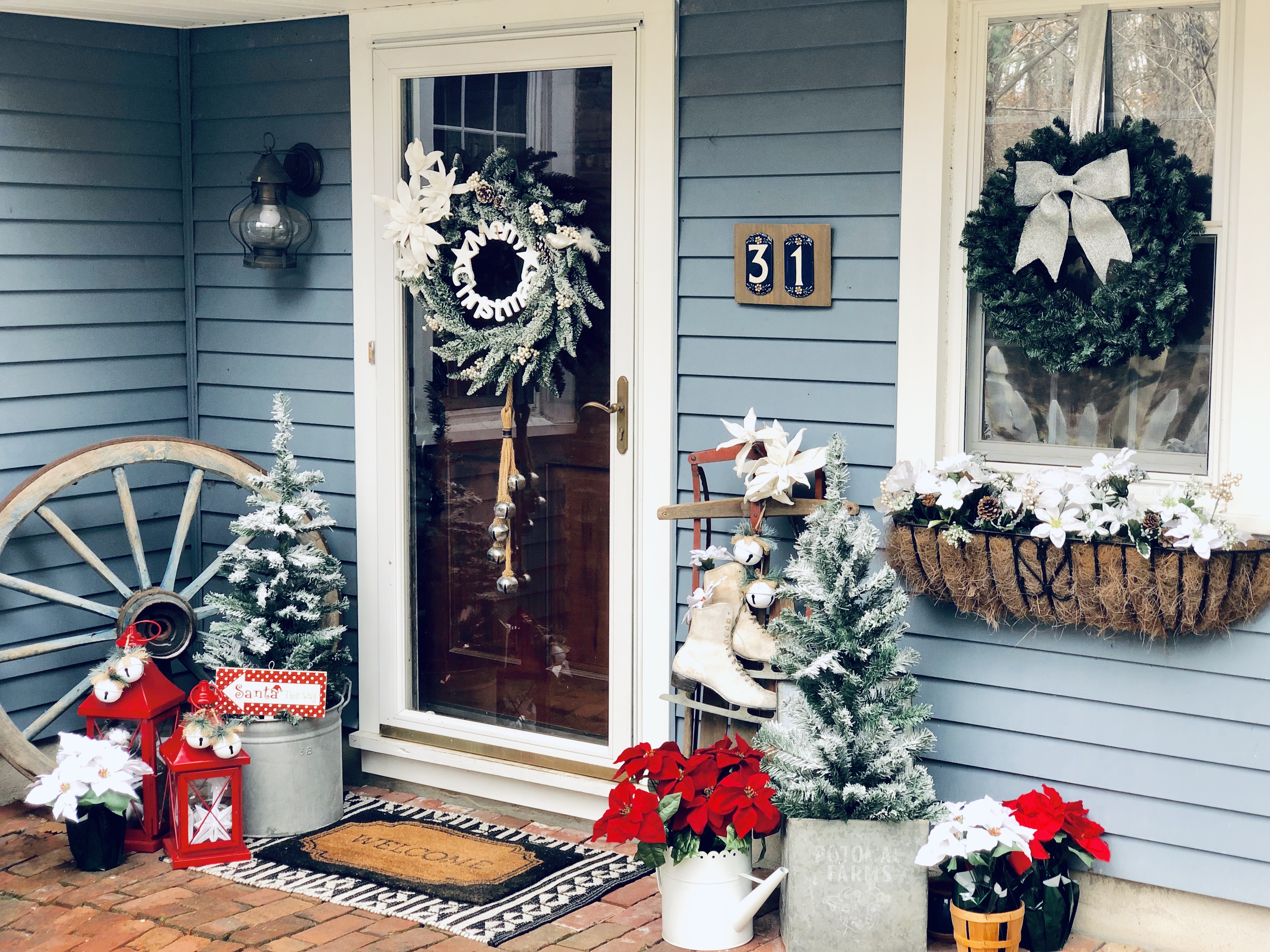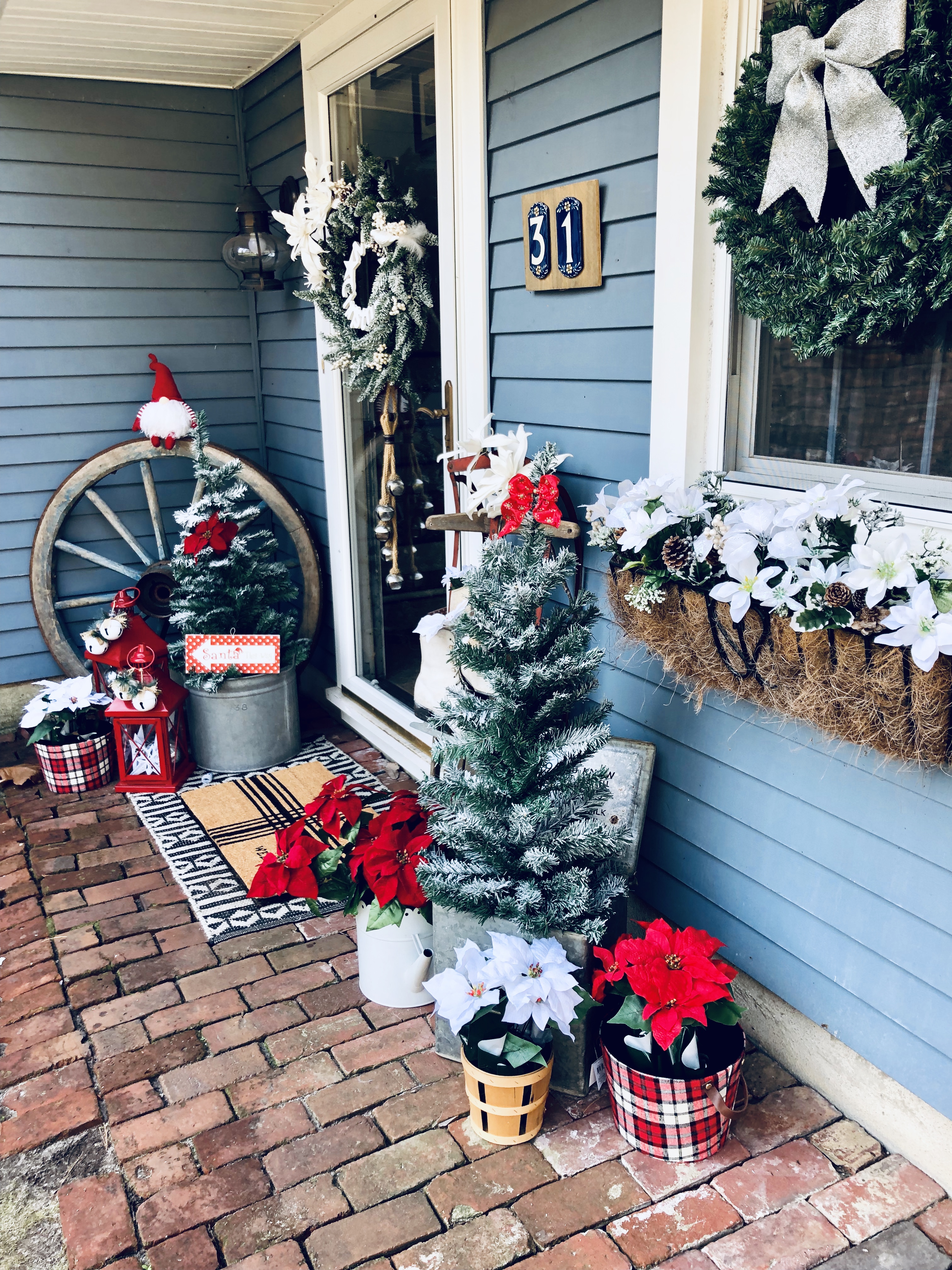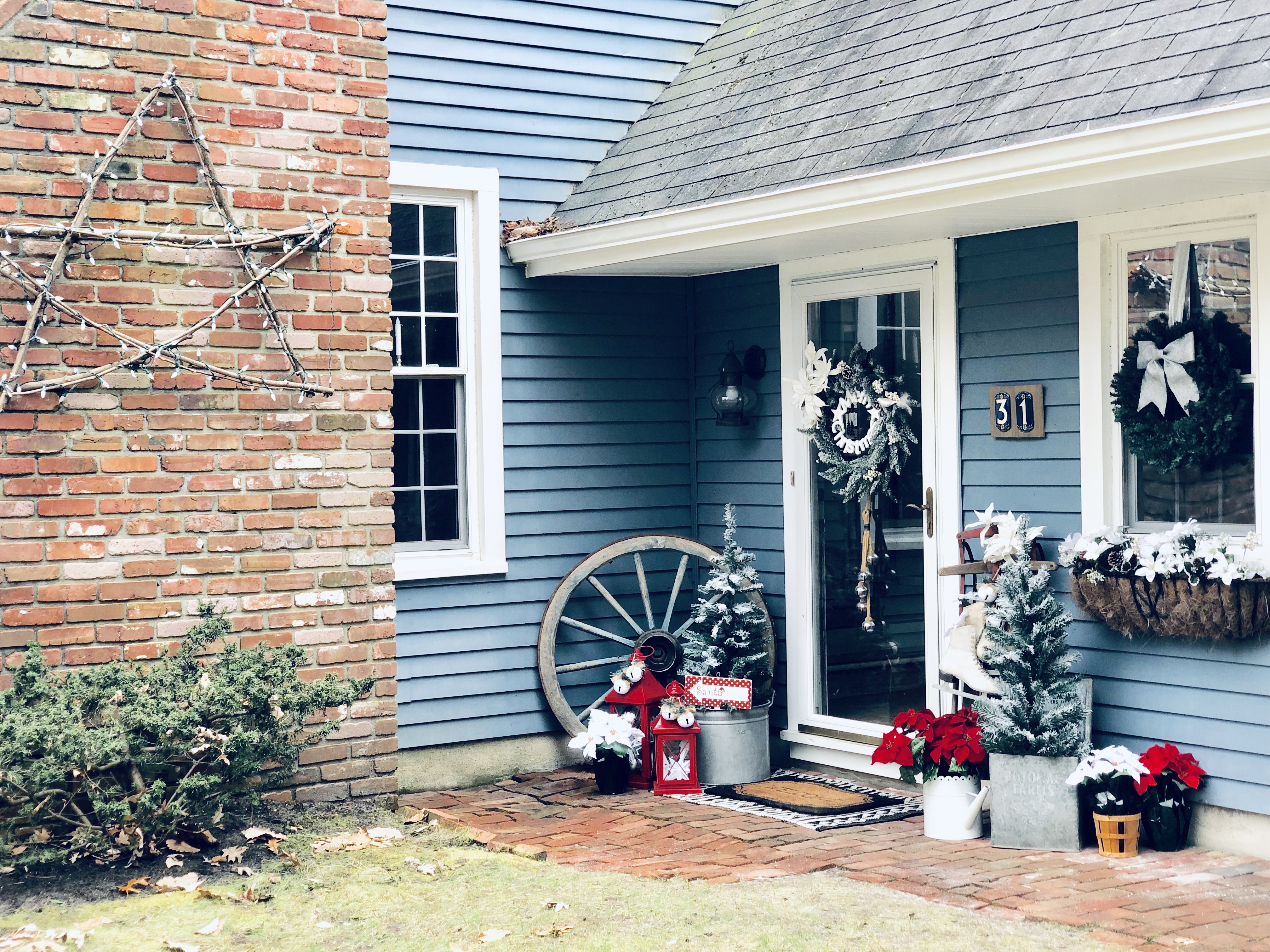 My Front Porch this year is filled with new and old, like so much of my home. I love switching out the decor for each season. Some of my favorite things are my layered mat, of course, and my wagon wheel from Germany, which weighs probably 5oo lbs, don’t let that bad boy roll over you! I added a few of my DIY Flocked Christmas Trees to the porch this year. There is even an added pop of color, which I normally never do. Switching out my florals in my flower boxes is also a great touch for every season. I try to go to the dollar store before anyone is even thinking about switching seasons and grab all the best stuff. Then I add a few really nice florals that I get from Hobby Lobby to spruce it up and look fuller and nicer. Last year, I made a wooden star out of tree branches for my chimney, which I love that you can see from the road. So unique!