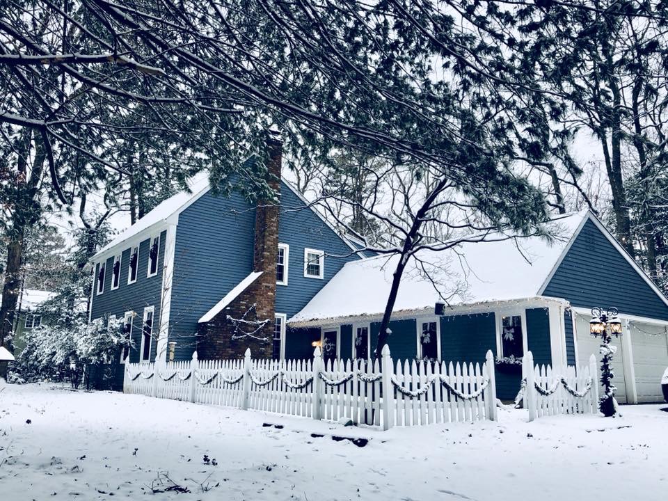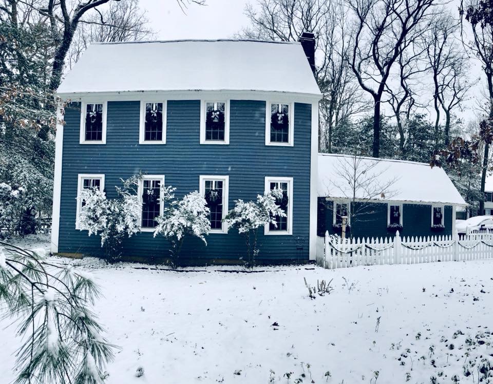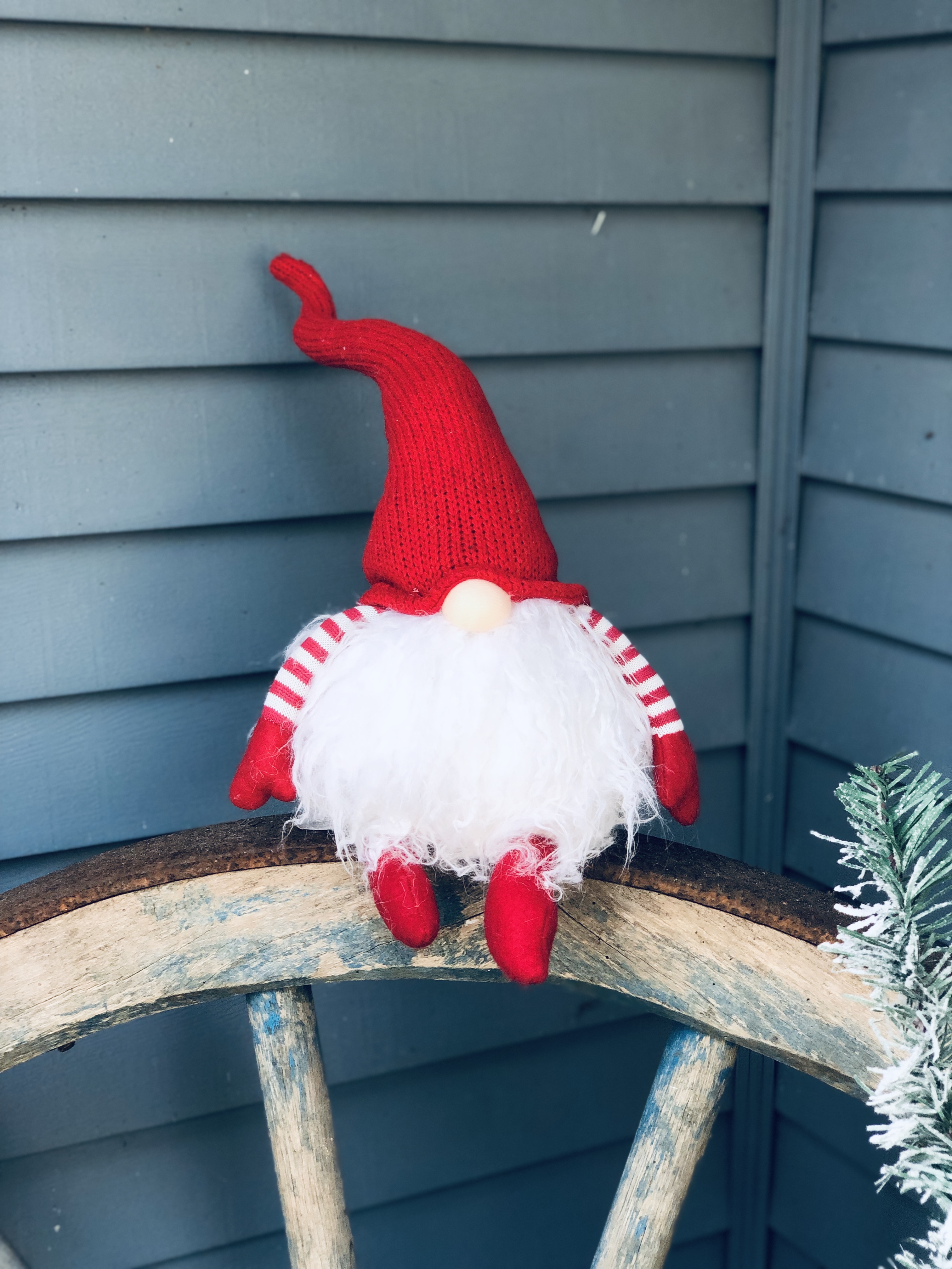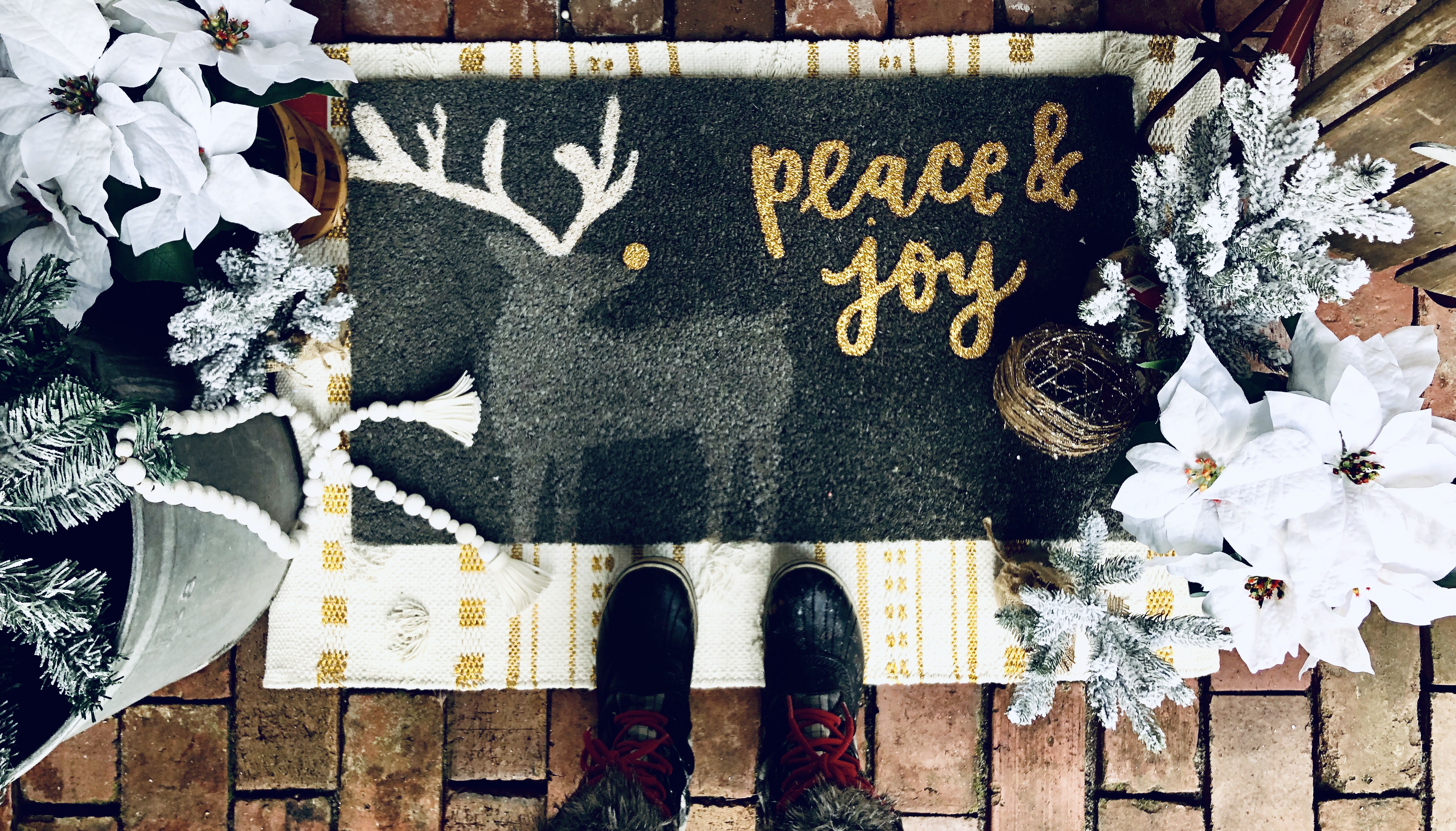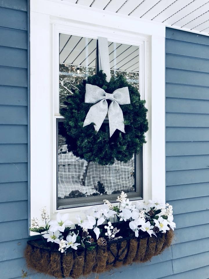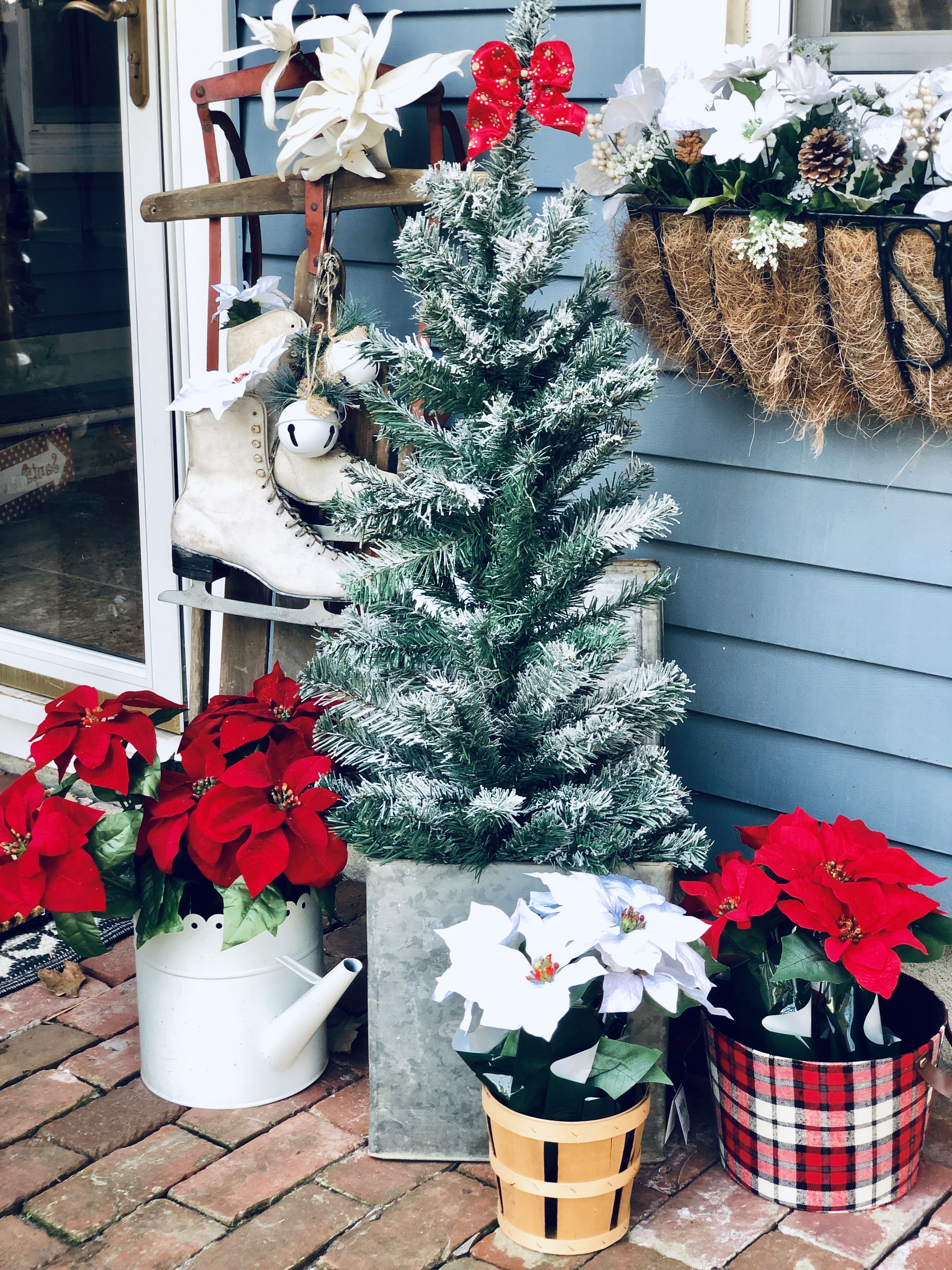 My Front Porch this year is filled with new and old, like so much of my home. I love switching out the decor for each season. Some of my favorite things are my layered mat, of course, and my wagon wheel from Germany, which weighs probably 5oo lbs, don’t let that bad boy roll over you! I added a few of my DIY Flocked Christmas Trees to the porch this year. There is even an added pop of color, which I normally never do. Switching out my florals in my flower boxes is also a great touch for every season. I try to go to the dollar store before anyone is even thinking about switching seasons and grab all the best stuff. Then I add a few really nice florals that I get from Hobby Lobby to spruce it up and look fuller and nicer. Last year, I made a wooden star out of tree branches for my chimney, which I love that you can see from the road. So unique!