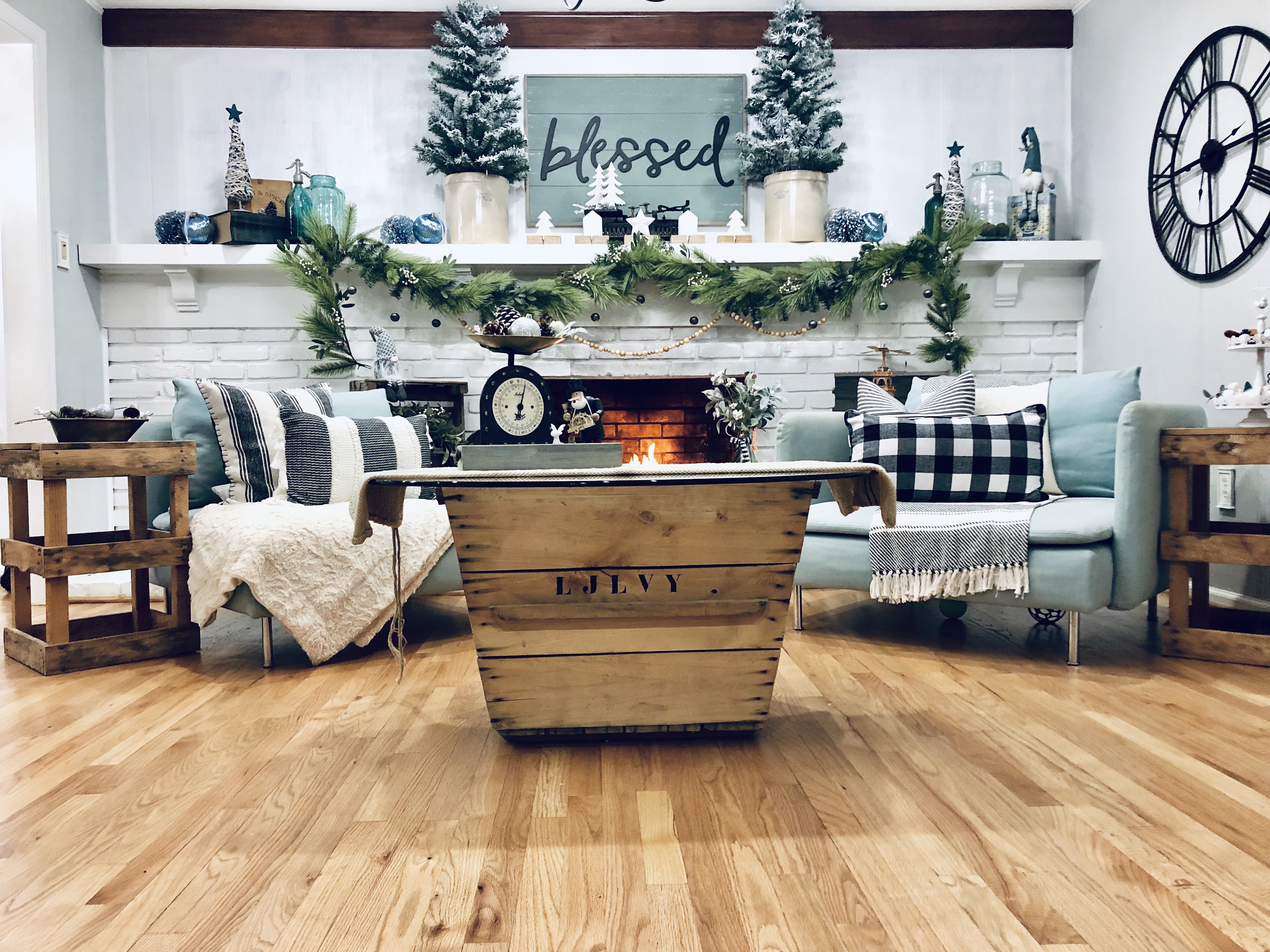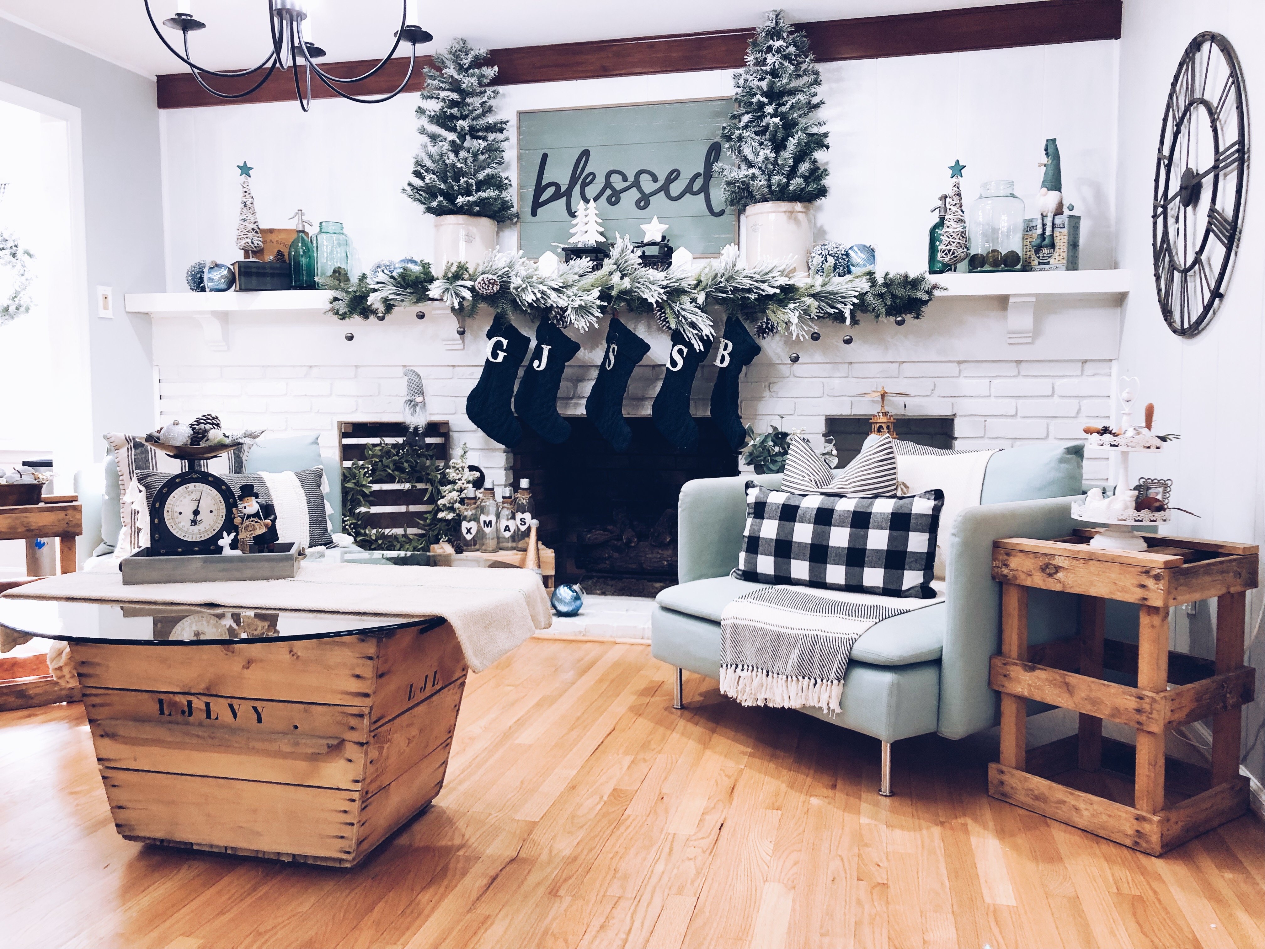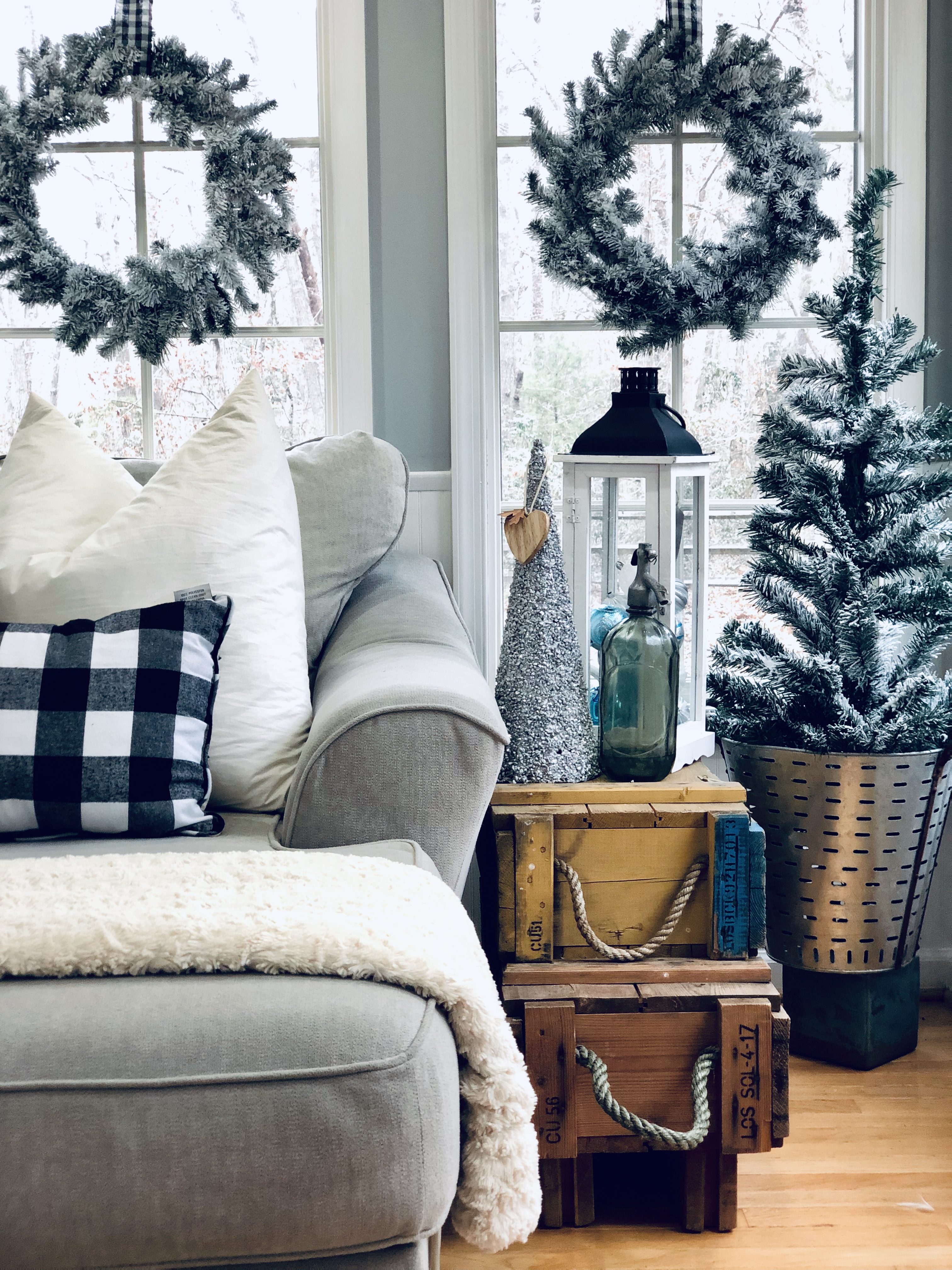In the sitting room, I reused a few items again to make something unexpected. Storage crates are flipped upside down as end tables and an old crate I found in France that is being used as the bottom of my coffee table. I just added a piece of round glass, from an old table on the top to finish it off. I added lots of Winter Florals to my garland and to my DIY Coffee Rack to tie everything together.