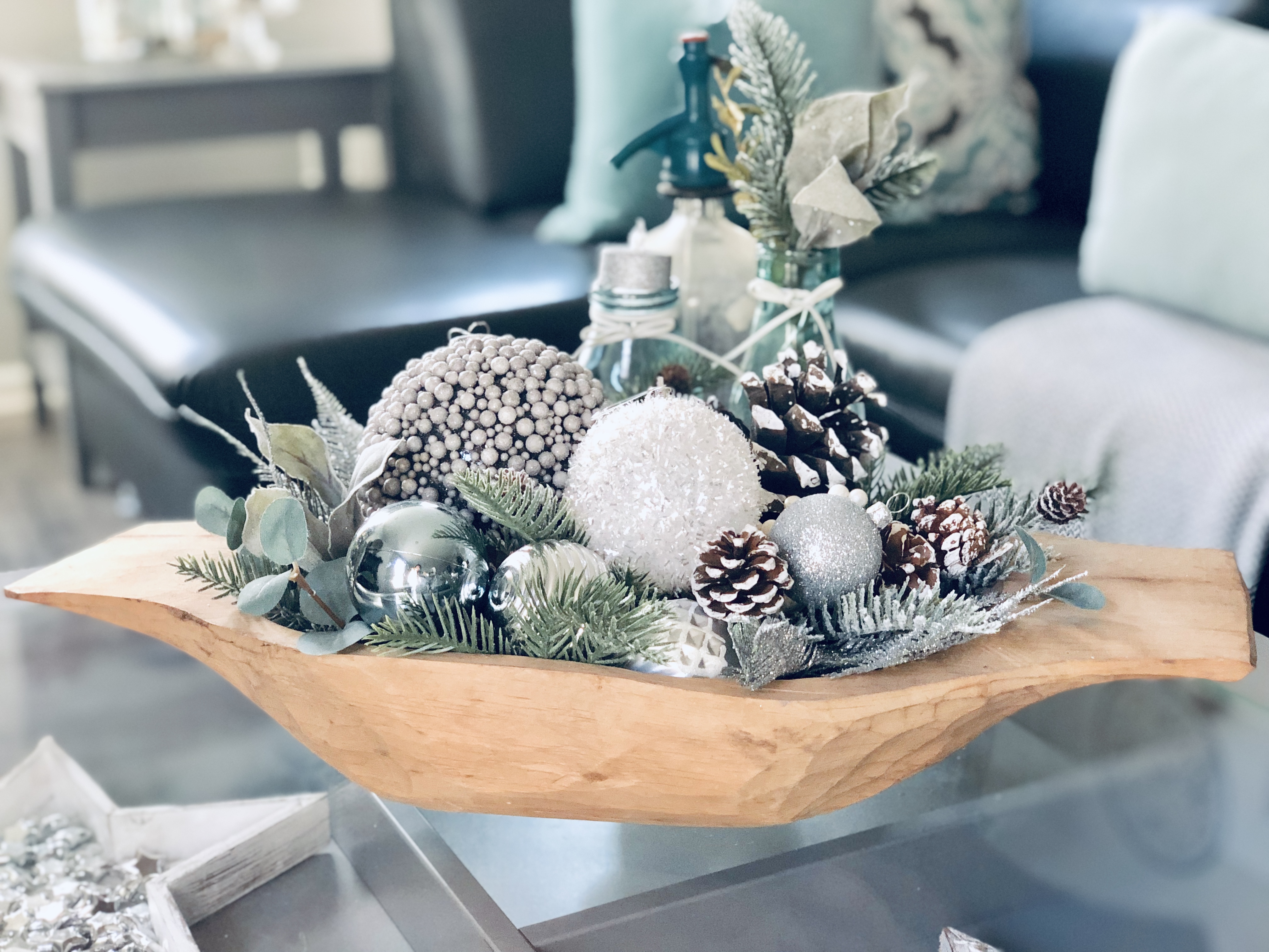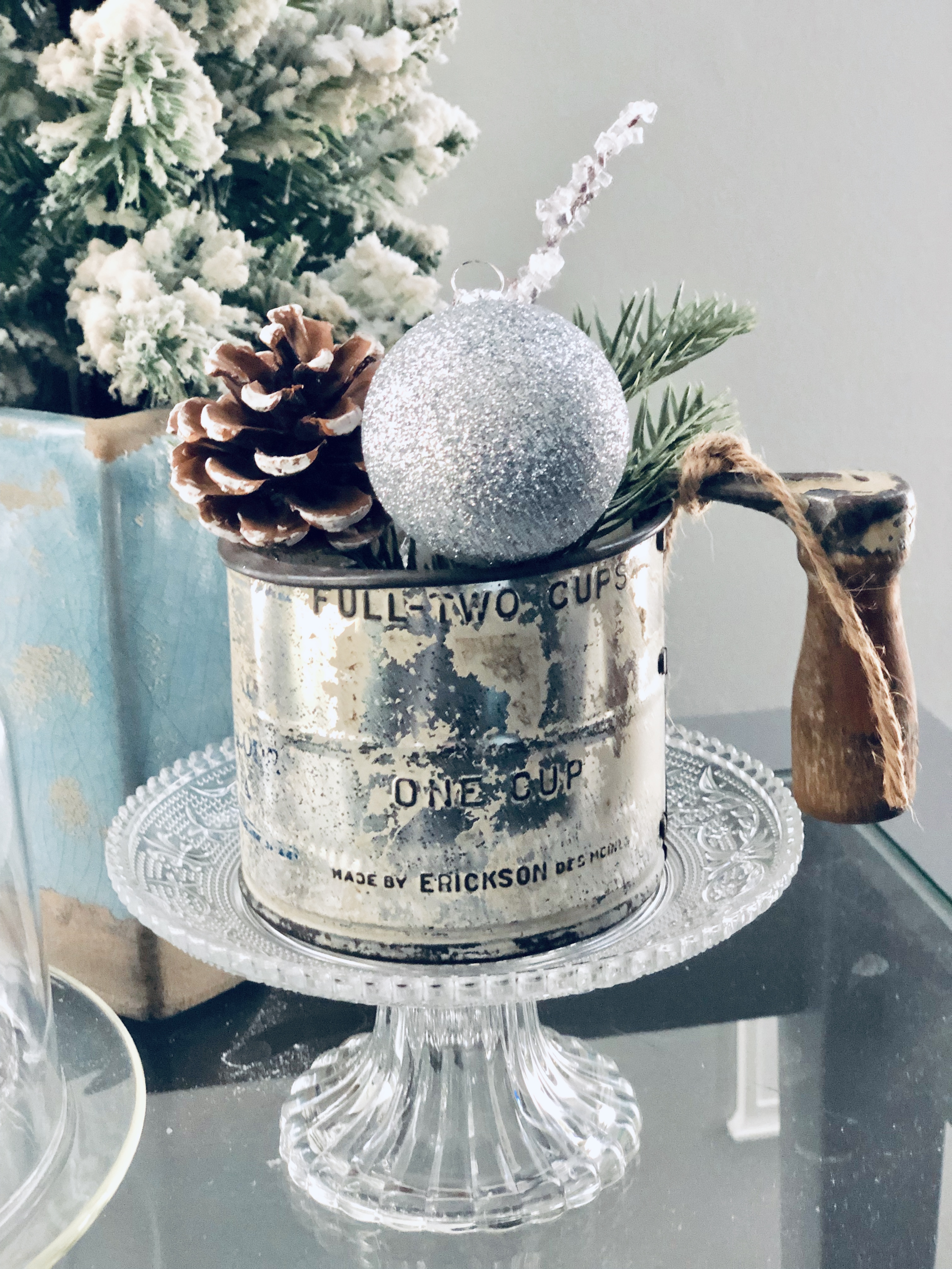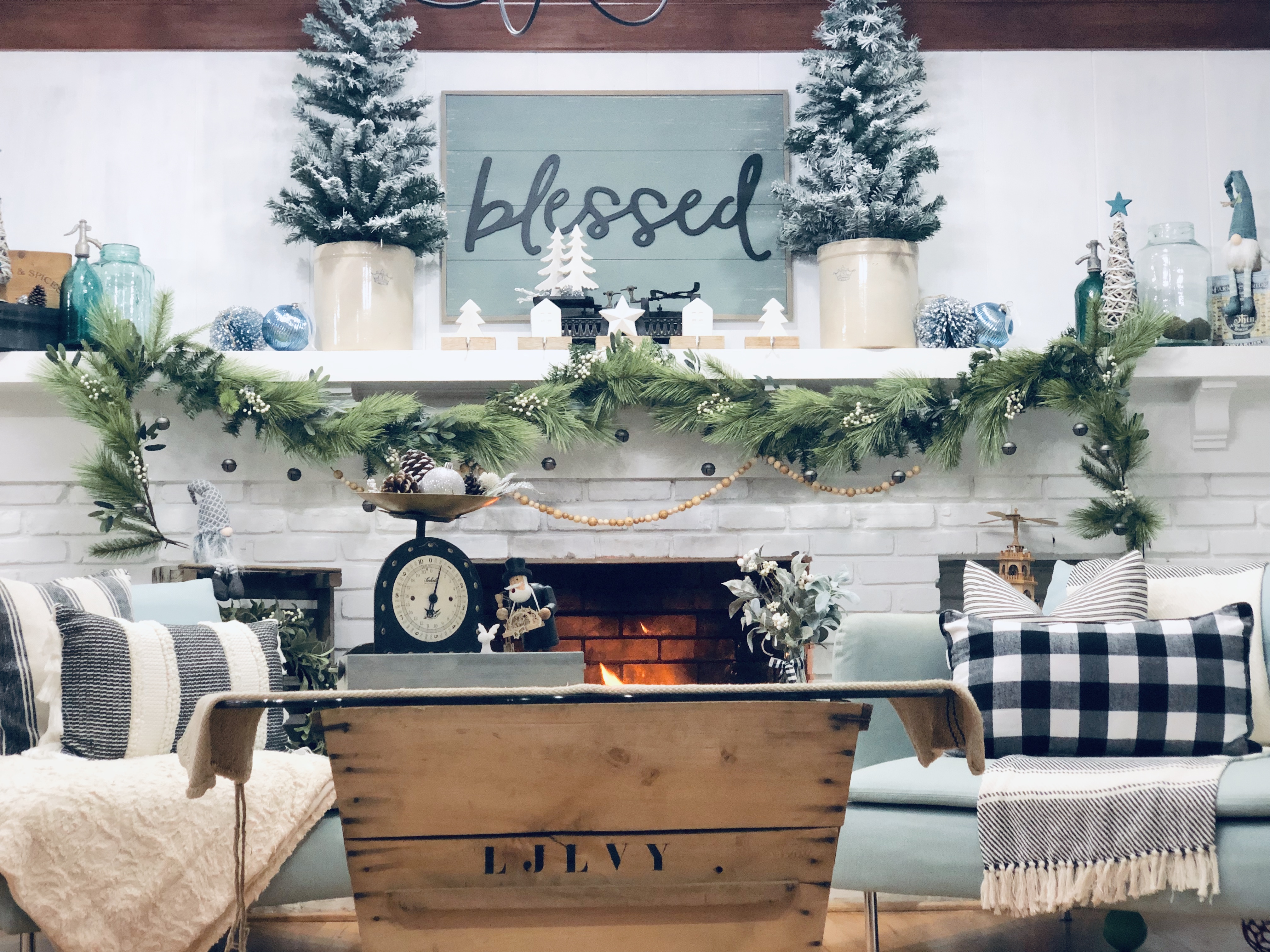 In the sitting room, I reused a few items again to make something unexpected. Storage crates are flipped upside down as end tables and an old crate I found in France that is being used as the bottom of my coffee table. I just added a piece of round glass, from an old table on the top to finish it off. I added lots of Winter Florals to my garland and to my DIY Coffee Rack to tie everything together.