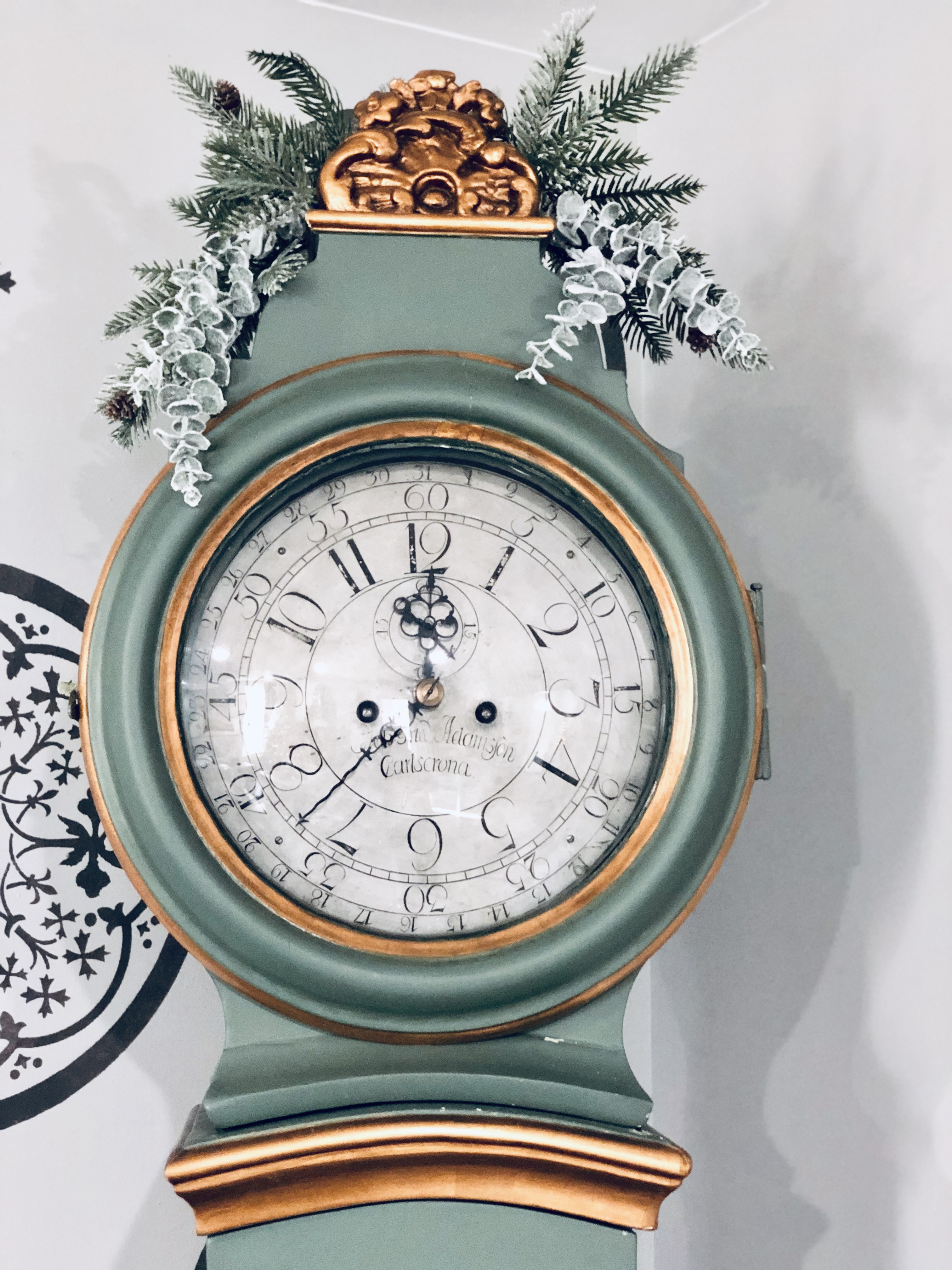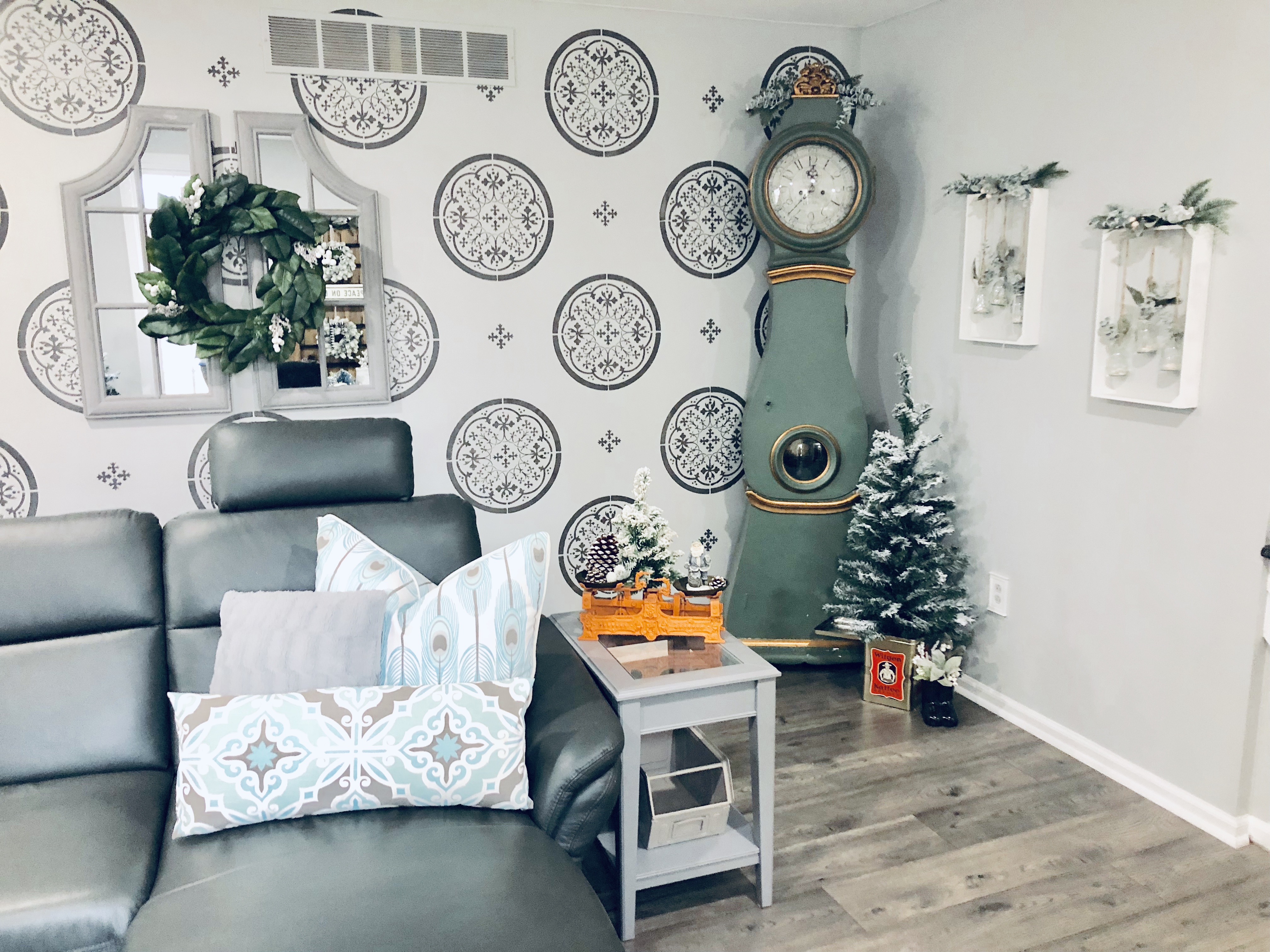 Believe or it not, this room actually always looks like this…So crazy, I know! Somehow I think I have scared every single person in my home to not sit or play in here. Oh, well…one clean room for me..Win!! It is also the first room you see in the house, so I do love that it is always put together. Just don’t look around the corner! 😉 This room also, went through so many changes since move in…new floors, lights, painted walls, trim, fireplace and celling. I added the medallion stencil for an accent wall. Fireplaces and mantels are by far my favorite and in my opinion the easiest places to decorate in the whole house. Some of my favorite things in this room are again pieces I found while living in Germany. My Mora Clock is from Sweden and it’s my prize possession. Our couch is from Italy, also love so much. Tons of little pieces are in this room, dough bowls, spritzer bottles, olive baskets, metal trays, old coffee tins, sifters, …all things I got from different countries that all have a special meaning to me. That’s probably why no one goes in this room…they are all scared for their lives…and they probably should be 🙂