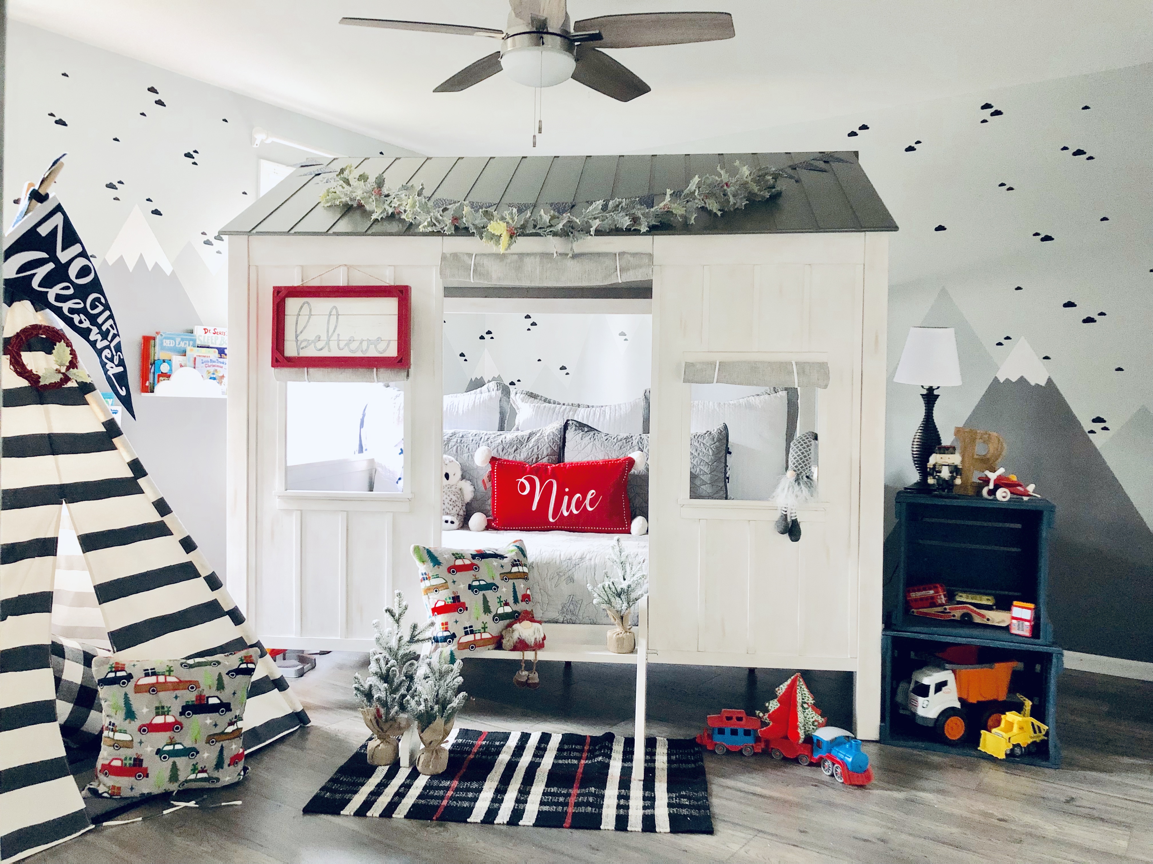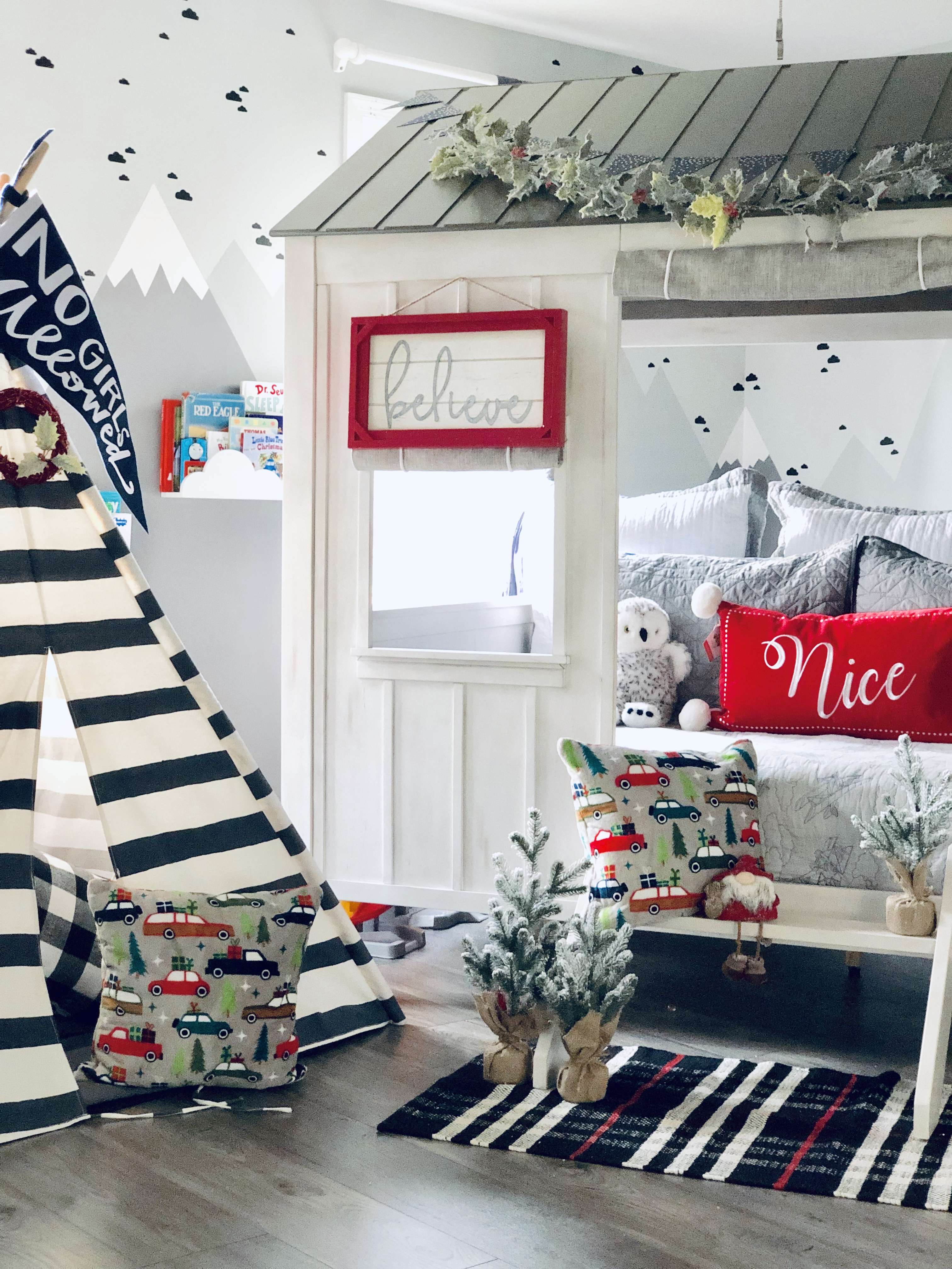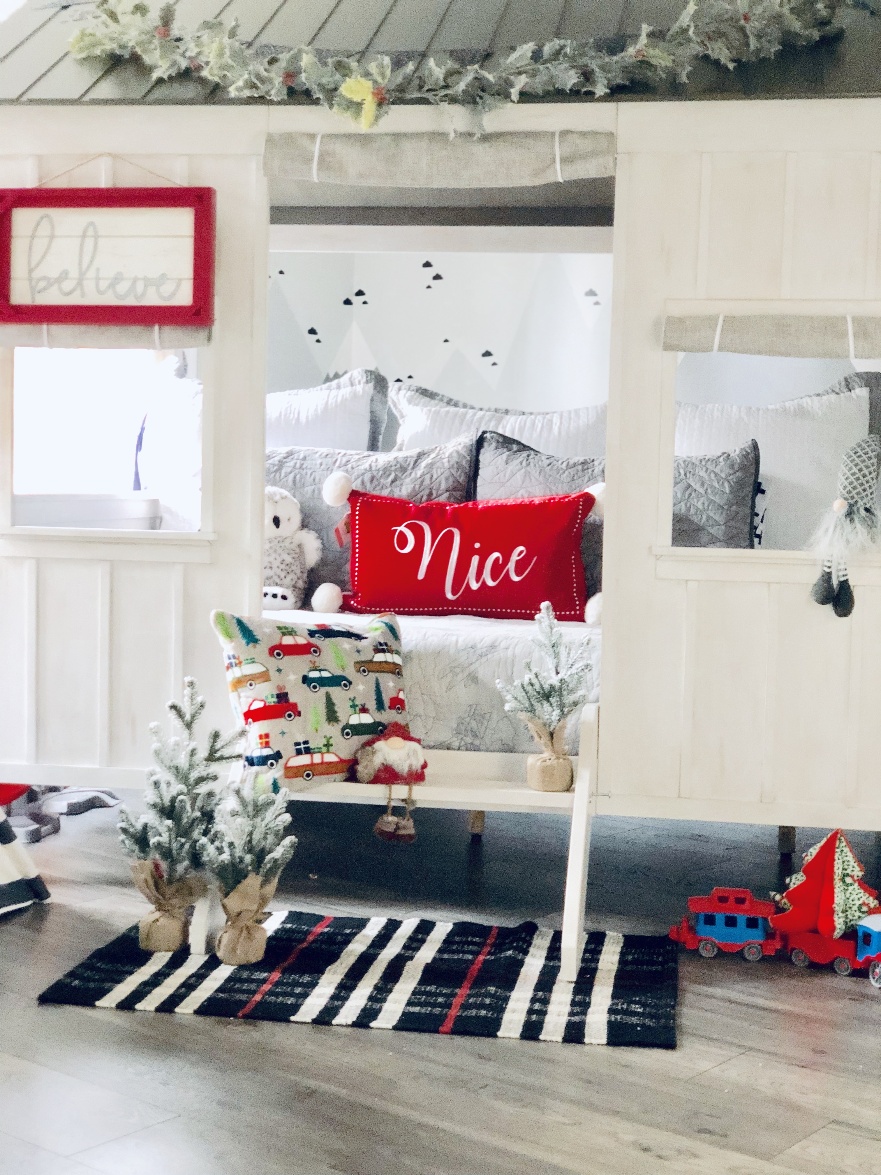 This is the first year I’ve decorated any of the bedrooms. So I only got to Brock’s room and the Master-Bedroom. Next year, I will start with the girls room, because they are so jealous their room isn’t decorated. Sorry girls, mama ran out of money!! Who thinks I won’t live that decision down? Brock’s room went through a major renovation, you can see all the details here on our Before & After Boy’s Room blog post. For Christmas, I add a pop of red to his room, which I thought really stood out will all the gray. I also added a few trees that I found a target for $3 and $5, I used those trees all over the house this year. You can’t beat that price and they are super cute!! I finished his room off with a garland. I have soooooo many garlands this year…where am I going to put all this stuff when Christmas is over???