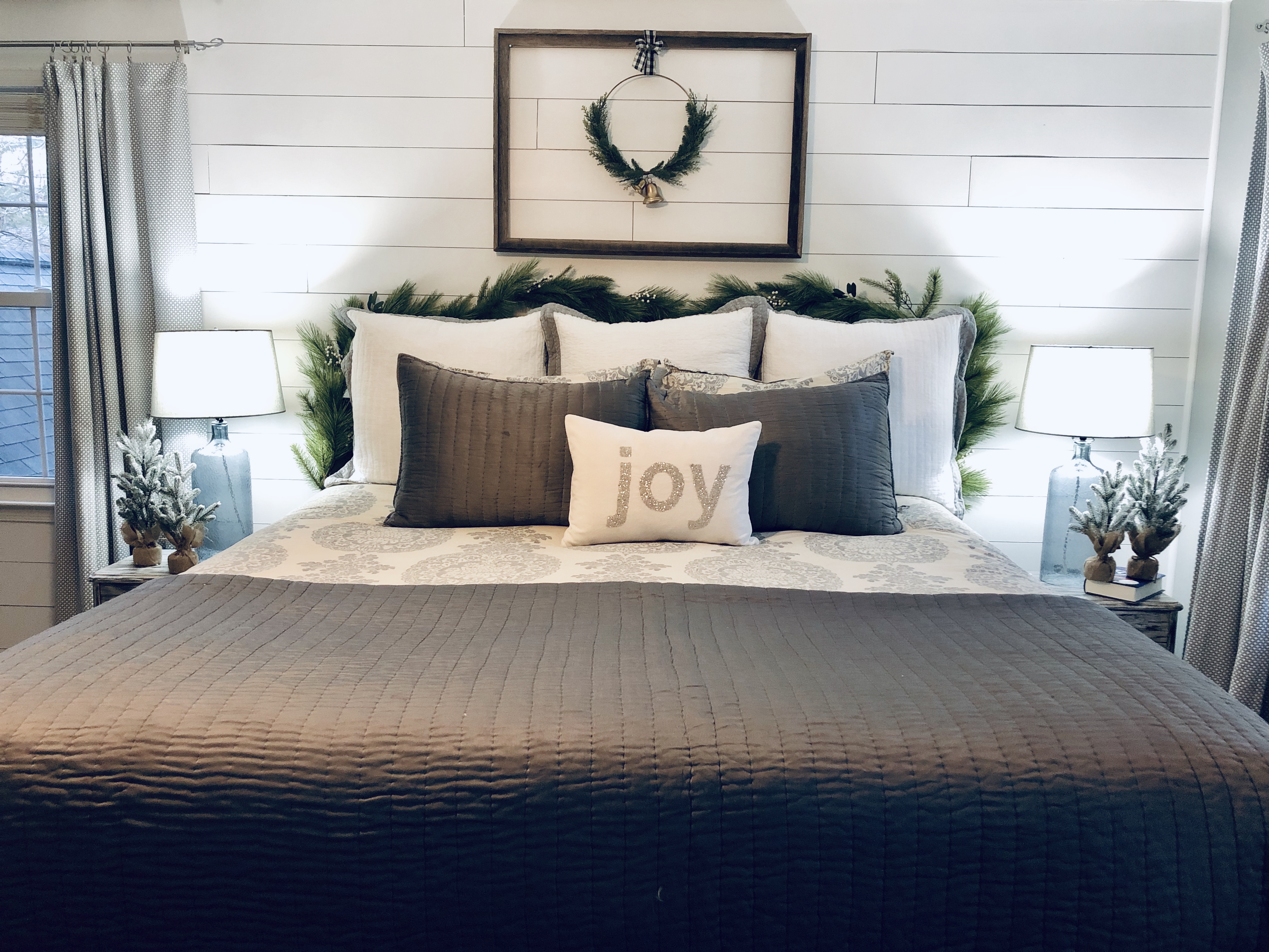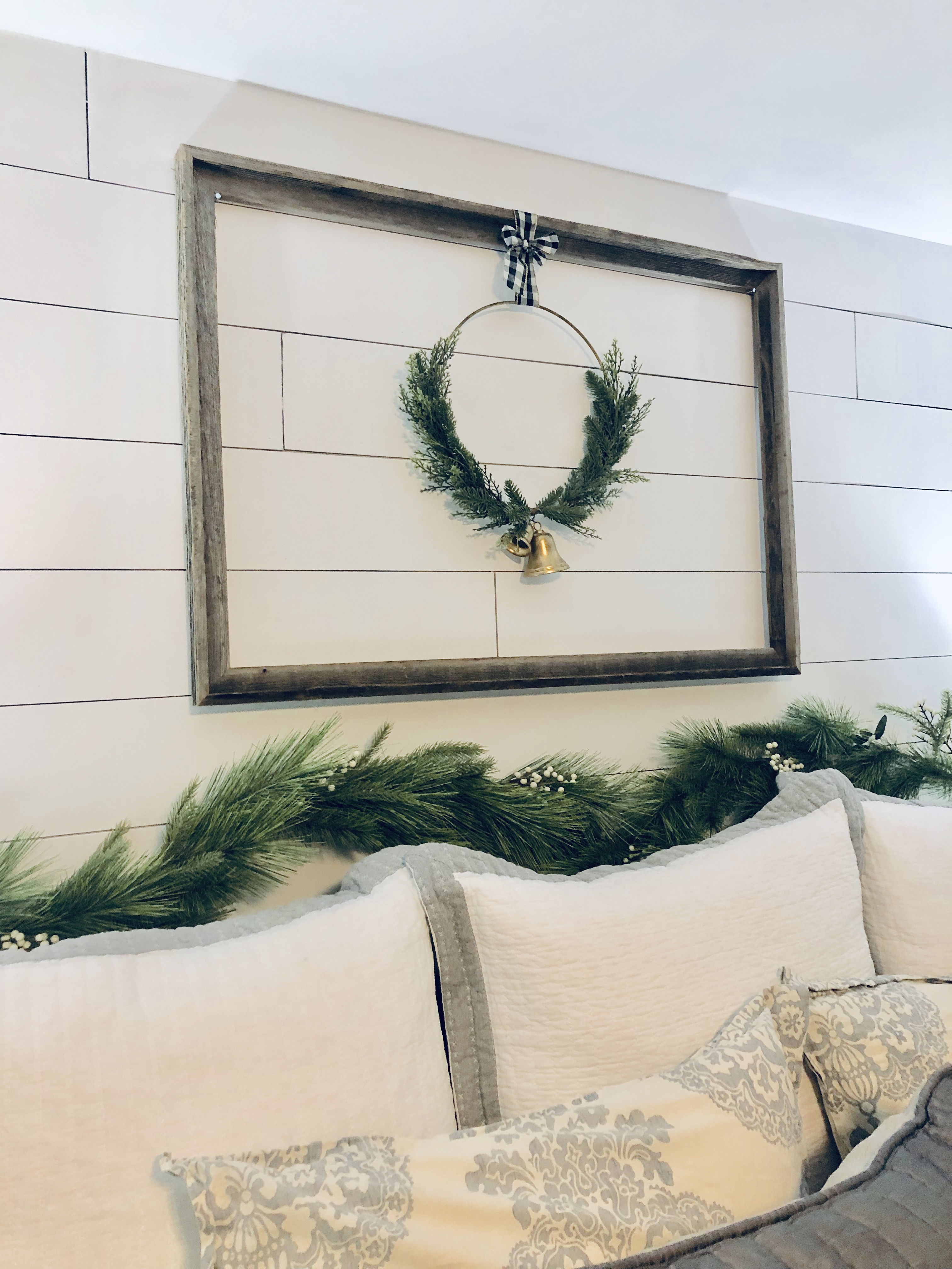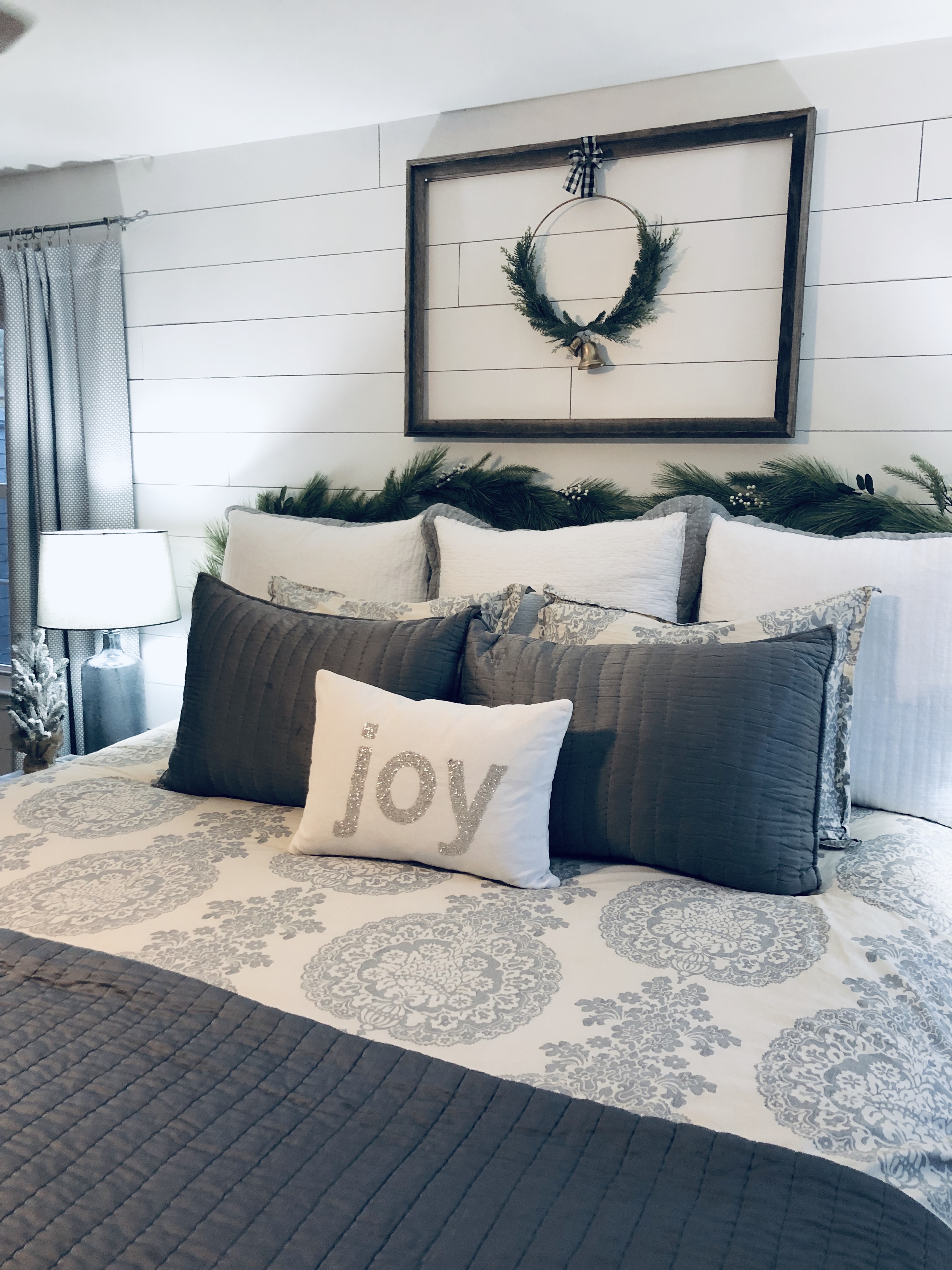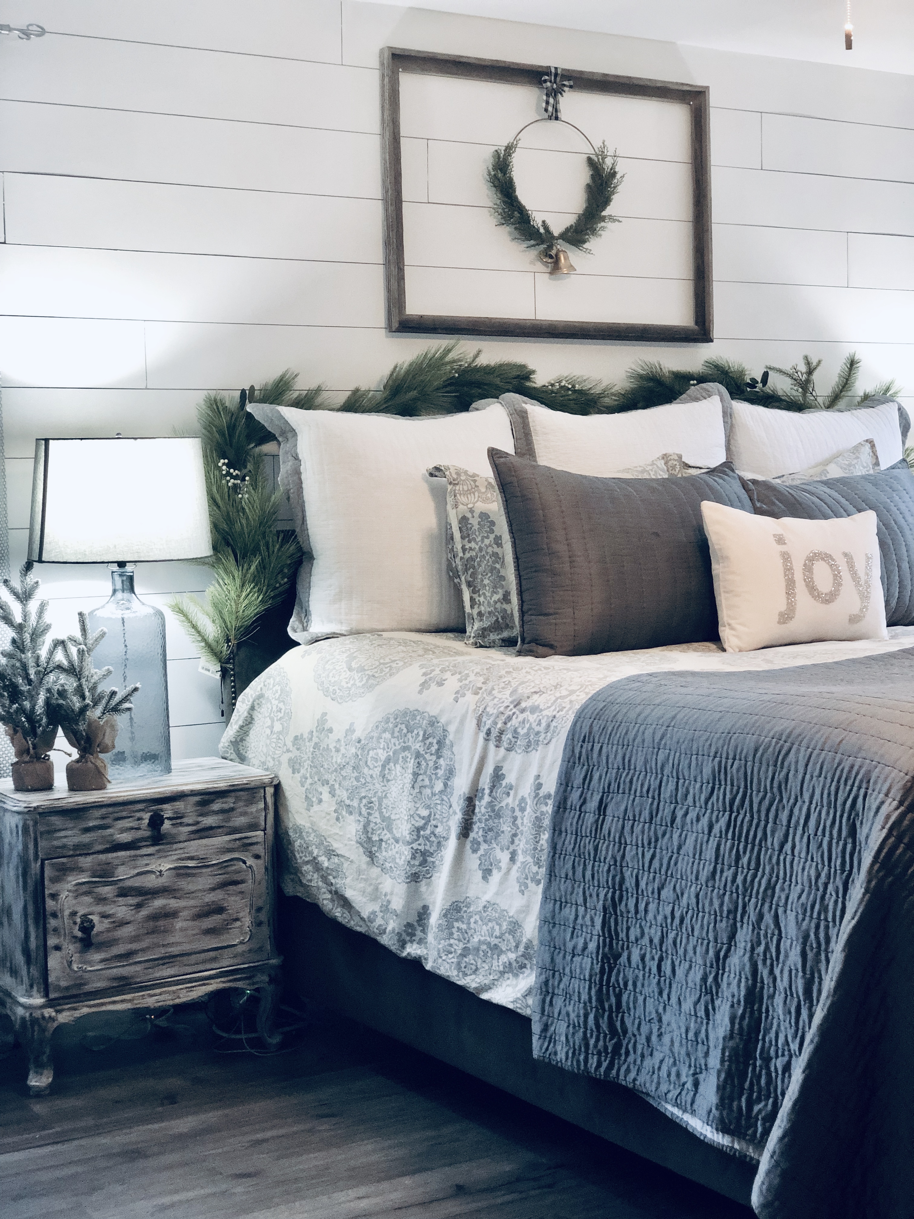 For my bedroom, I kept it pretty simple. I added a new Christmas wall decor above the bed with again a Scandinavia Wreath & frame and a garland over the bed frame. I also added my favorite mini Christmas trees from Target. My dresser is decorated with my giant doughbowl from Germany, it is filled with ornaments and Christmas florals. I shiplapped the main wall as an accent wall in the room as well, the blog post tutorial for DIY Shiplap is here.