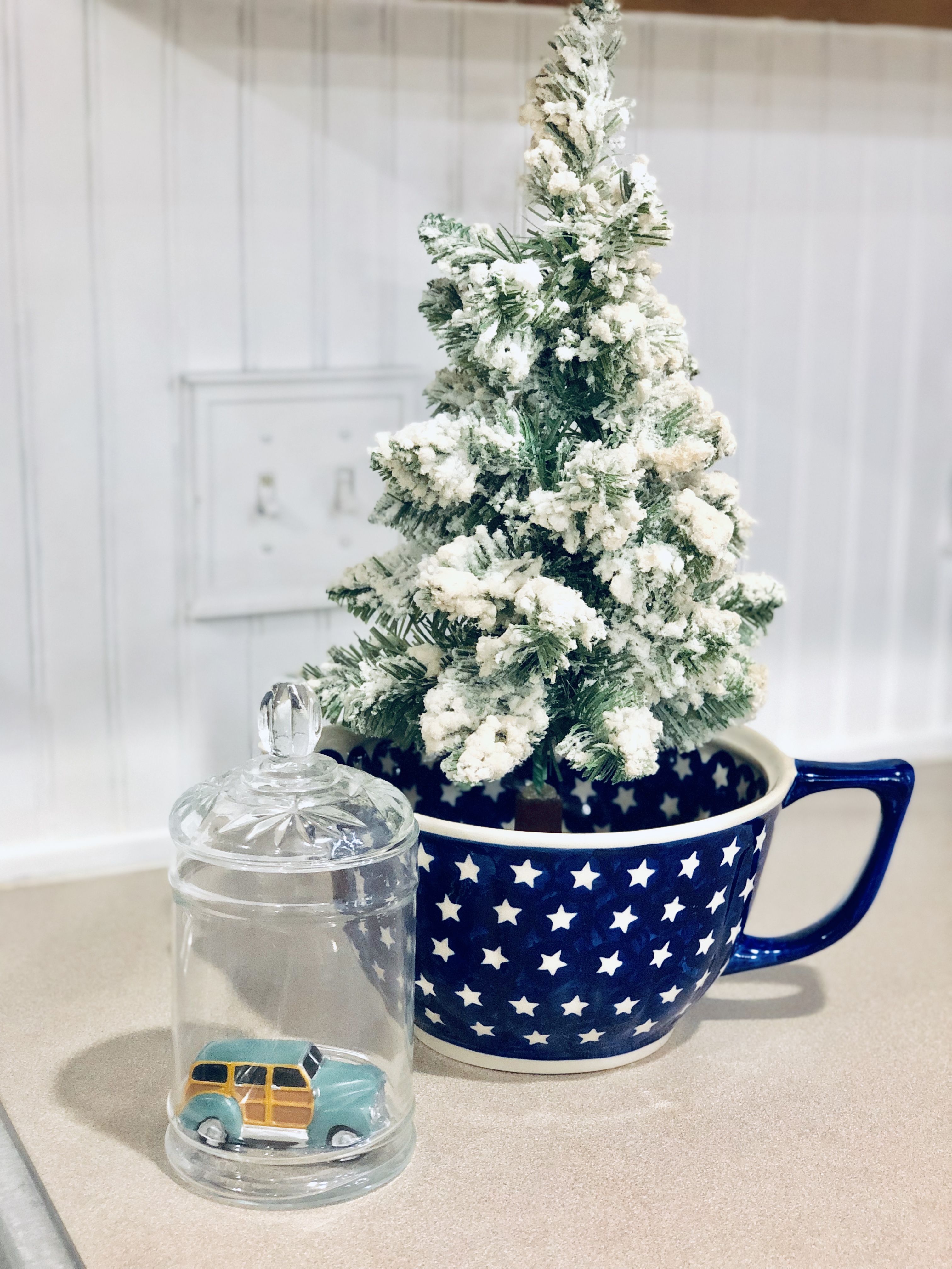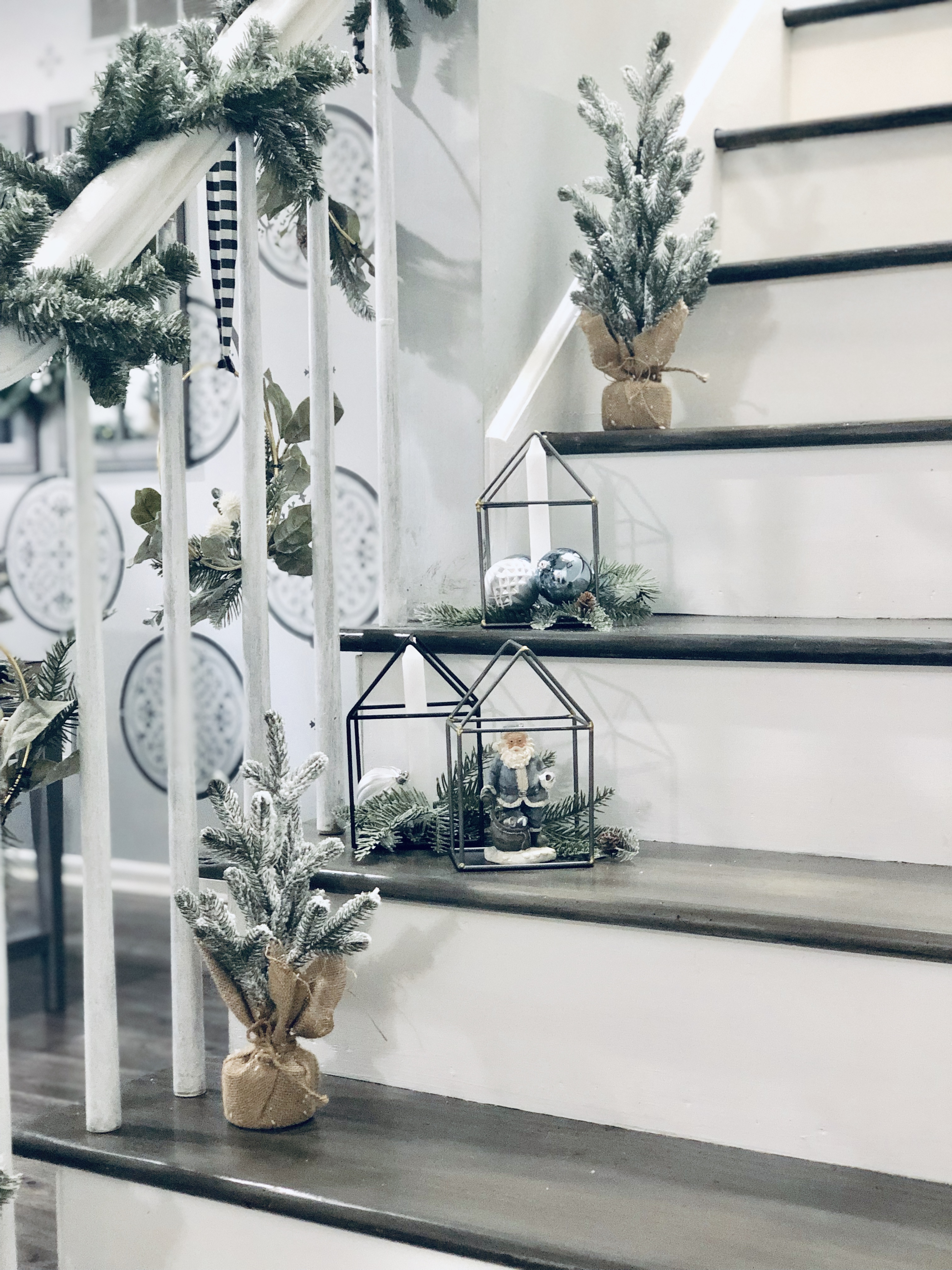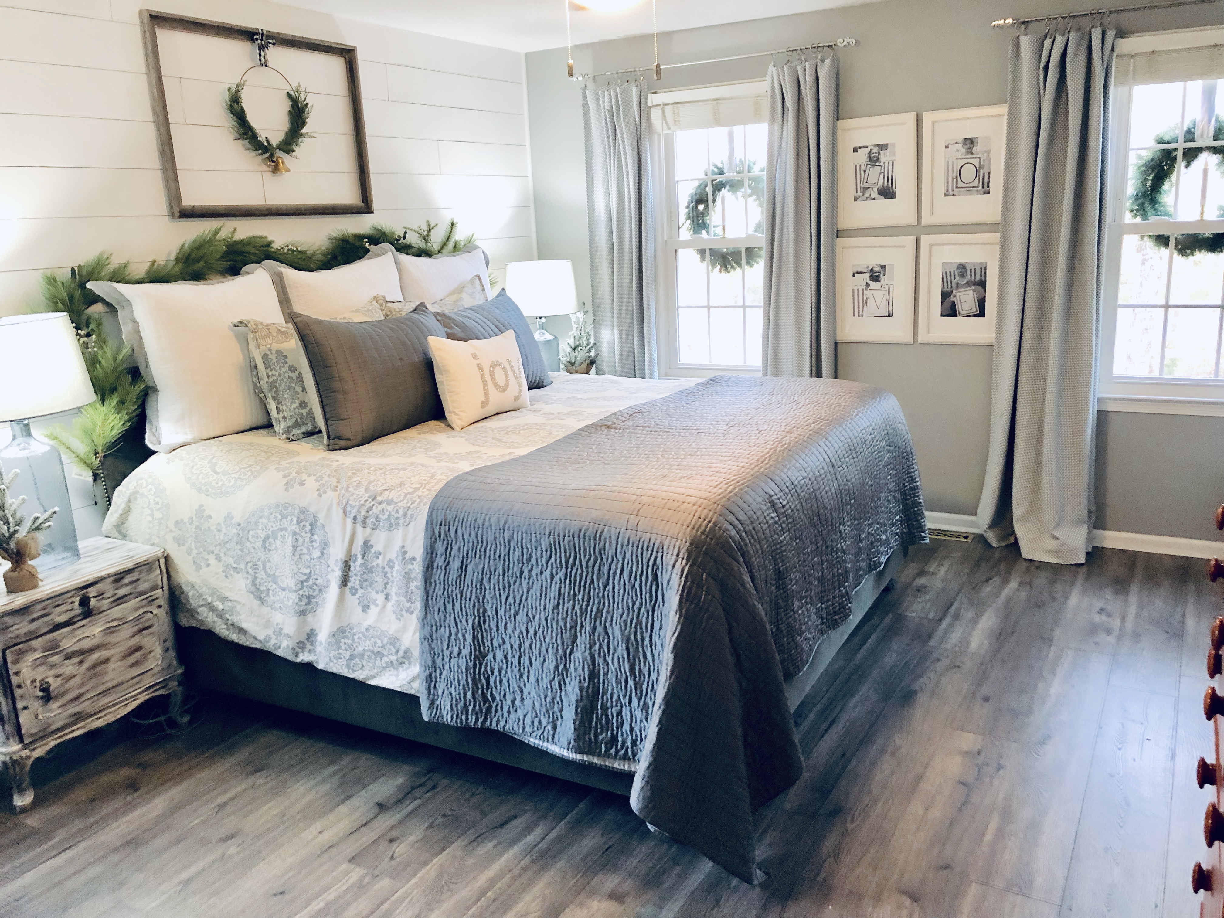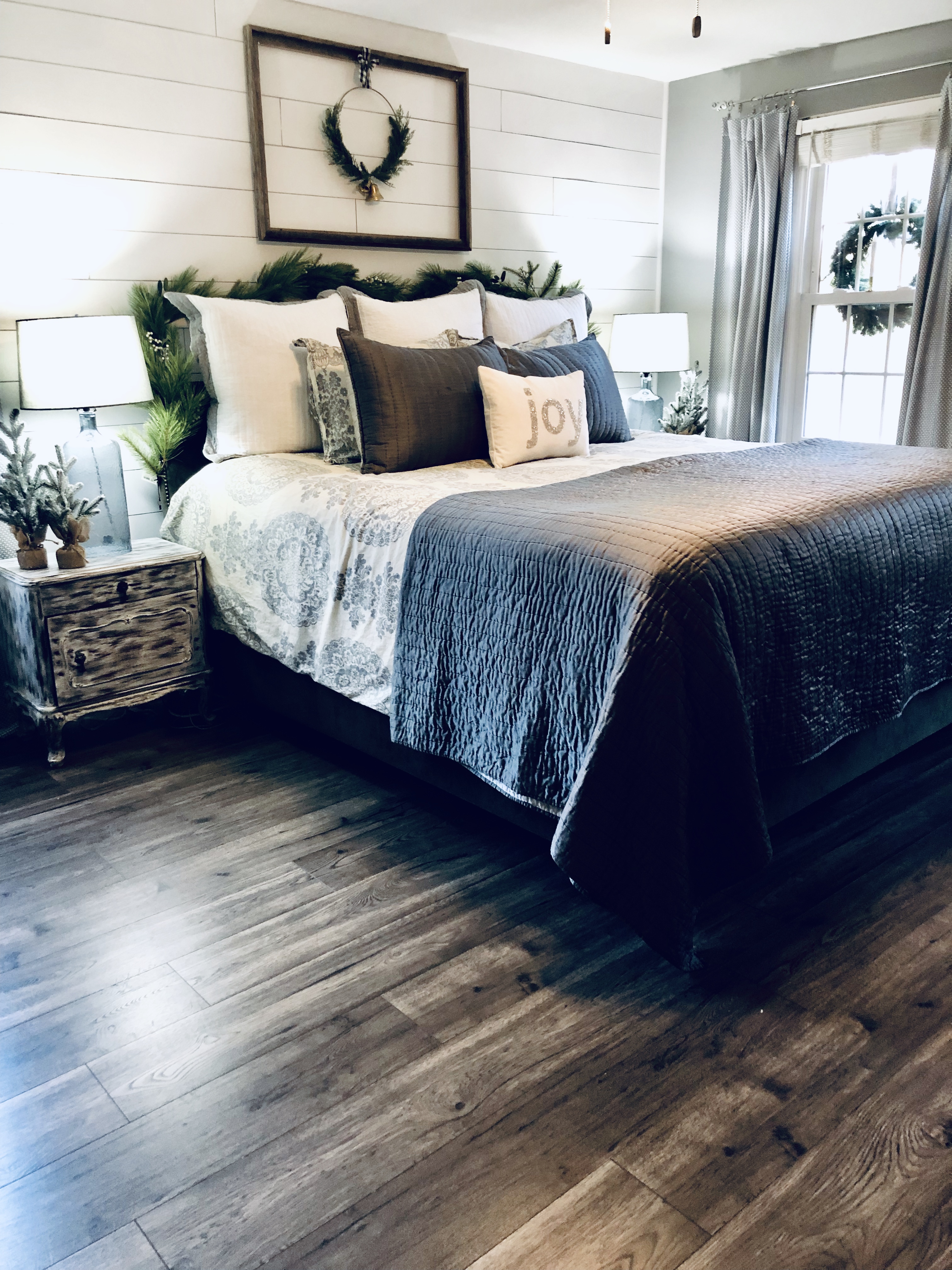 For my bedroom, I kept it pretty simple. I added a new Christmas wall decor above the bed with again a Scandinavia Wreath & frame and a garland over the bed frame. I also added my favorite mini Christmas trees from Target. My dresser is decorated with my giant doughbowl from Germany, it is filled with ornaments and Christmas florals. I shiplapped the main wall as an accent wall in the room as well, the blog post tutorial for DIY Shiplap is here.