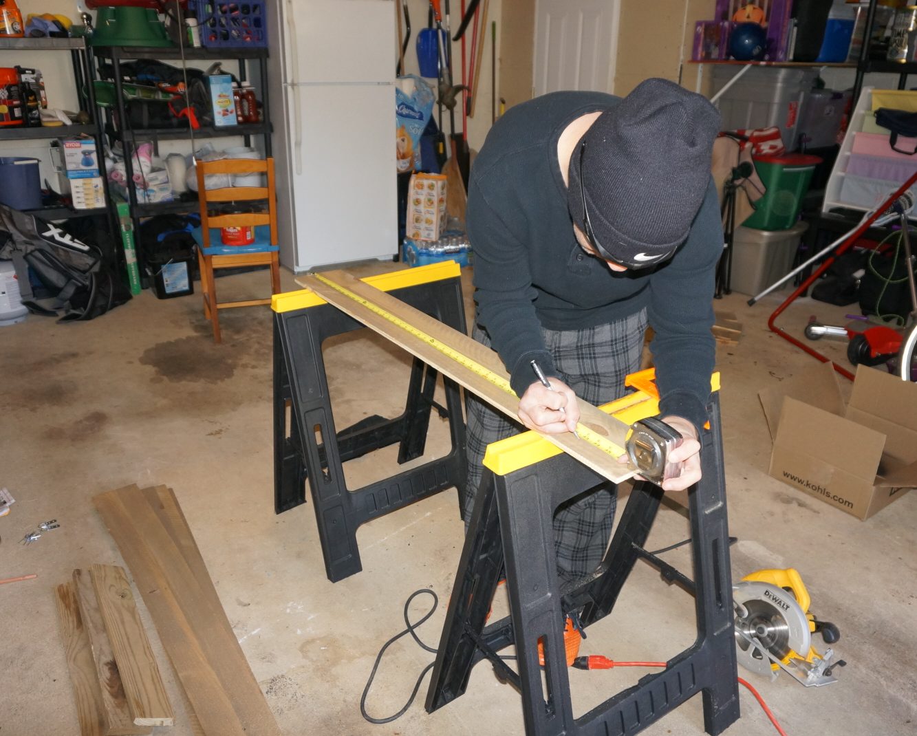 Next, we cut the wood using a circular saw for the back of the pallets to hold them all together. We used a piece of wood left over from another project. It was a large piece of 1×4. You can really use whatever you want for this step, as long as you feel it is sturdy. Cary cut the wood into 3, 24 inch pieces.