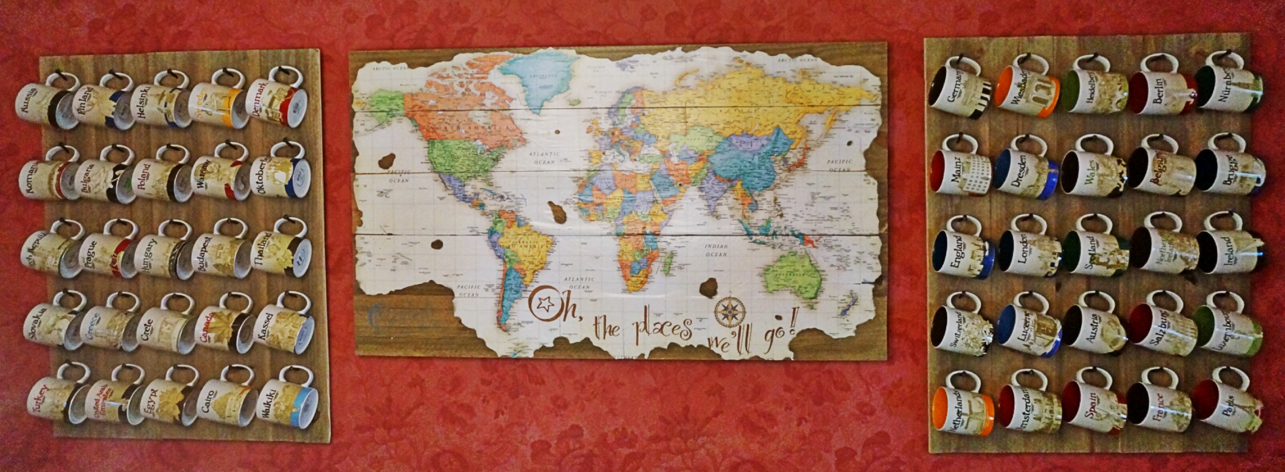 Once it is up on the wall add all the mugs. So awesome…I love looking at all my mugs and remembering the amazing trips we took over the years!!
