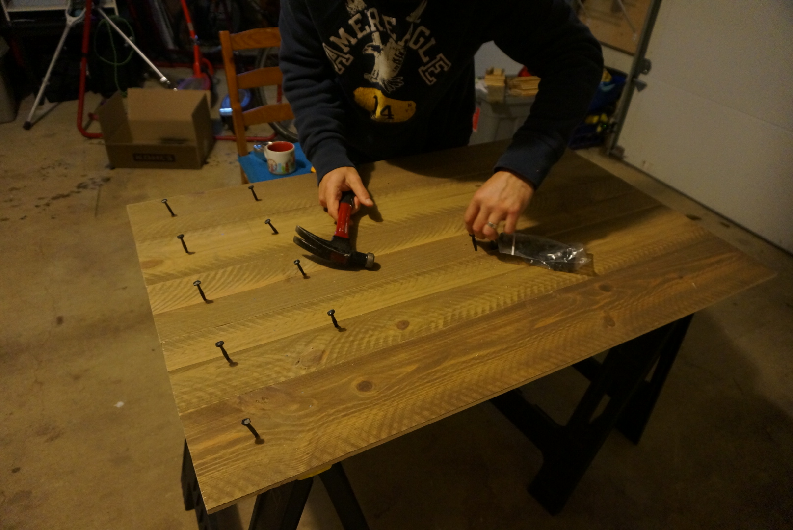 and put wood glue in the backs of the nails. Ours show through the back and on some of them the wood is cracked a little. This is fine as long as you wood glue and double check it is sturdy. Let the glue dry and do another double