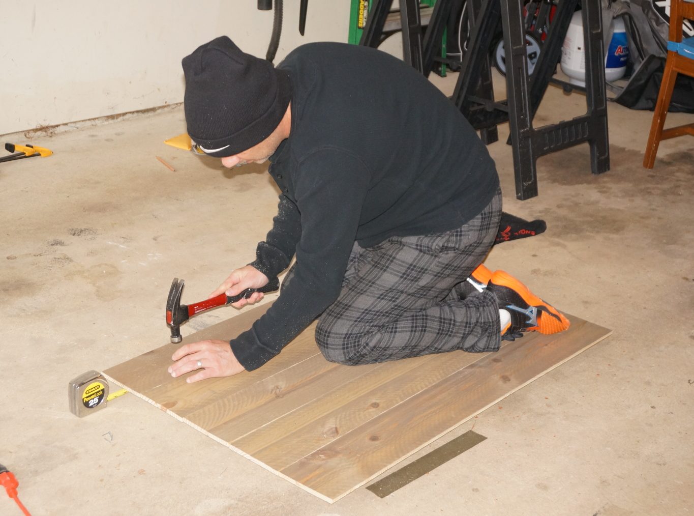 Now to connect the wood to the pallets. This step looked super weird to me at first but after listening to Cary’s reasoning it made sense. The nails we used were a little short, so he felt like the boards would be sturdier with the nail going through the front of the pallet instead of the back. Either way will work…it is a