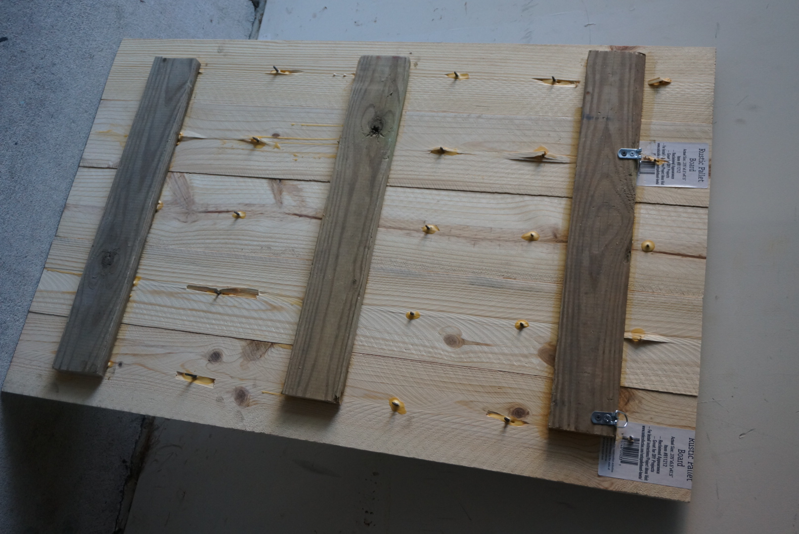 personal preference. He nailed in two nails per pallet in each piece of wood, so that would be 30 nails total. This also took a lot of measuring to make sure the back piece of wood stayed straight. After it was all put together, we added wood glue around the edges of the wood in the back and let if dry for a while.