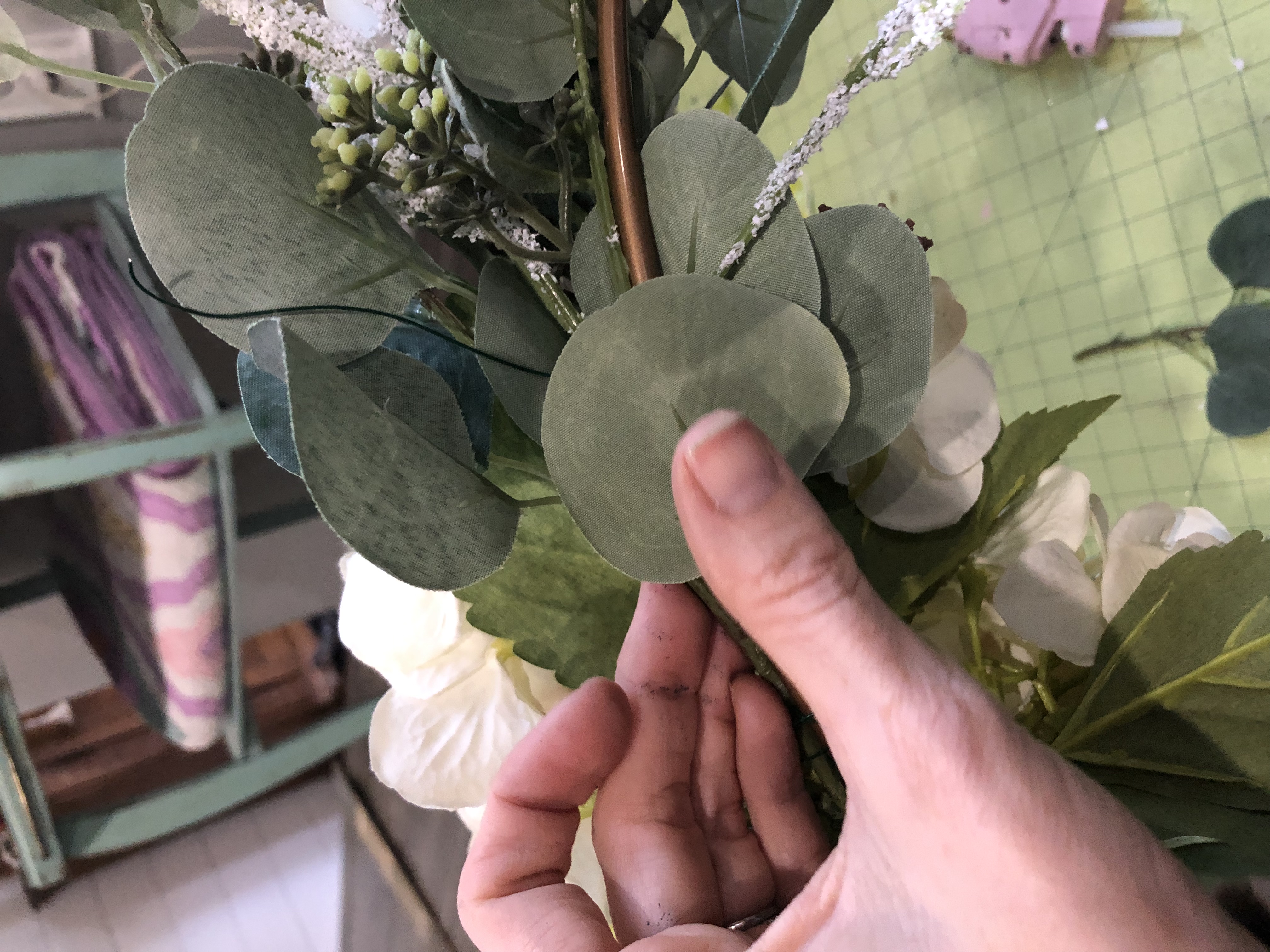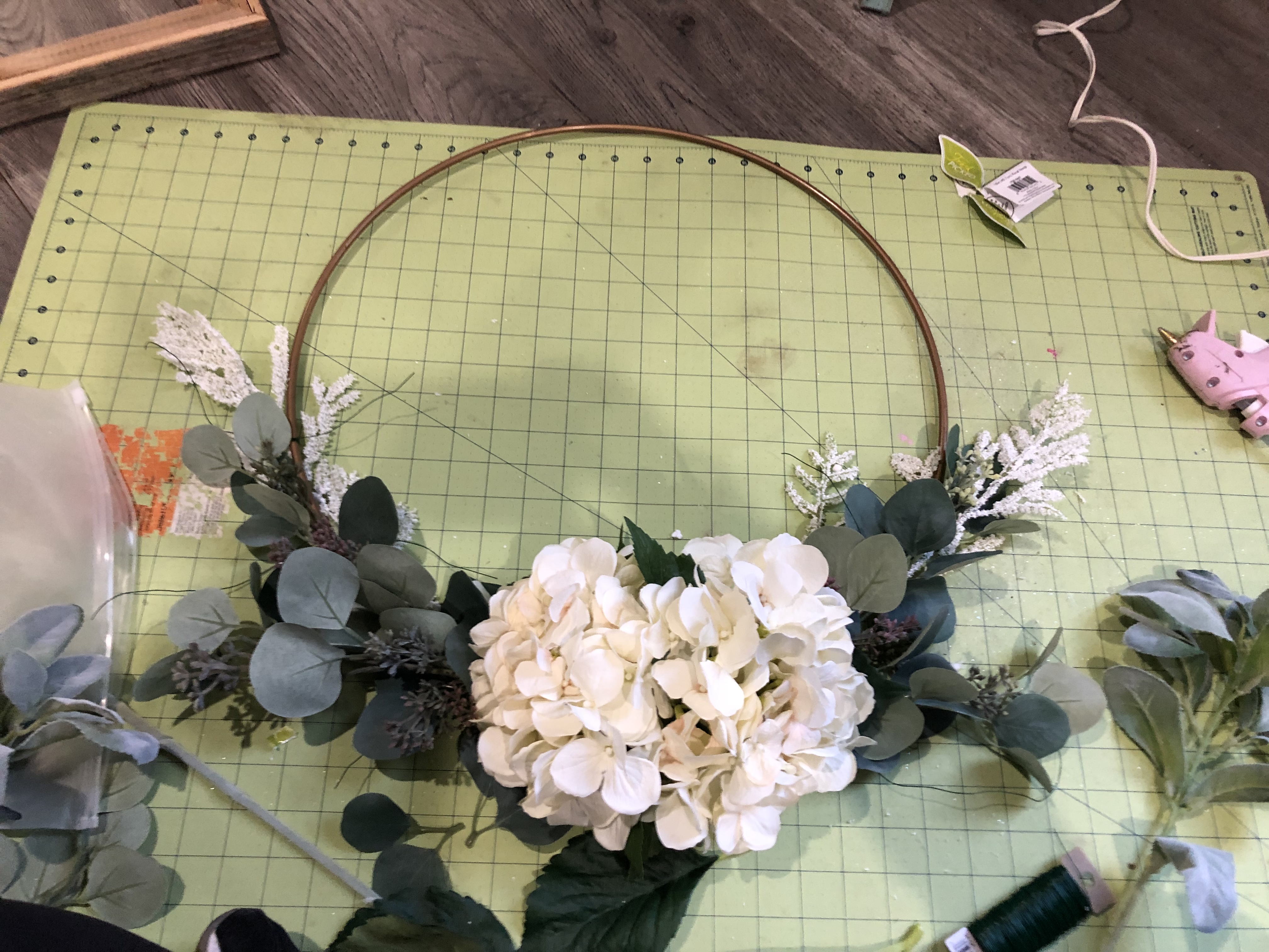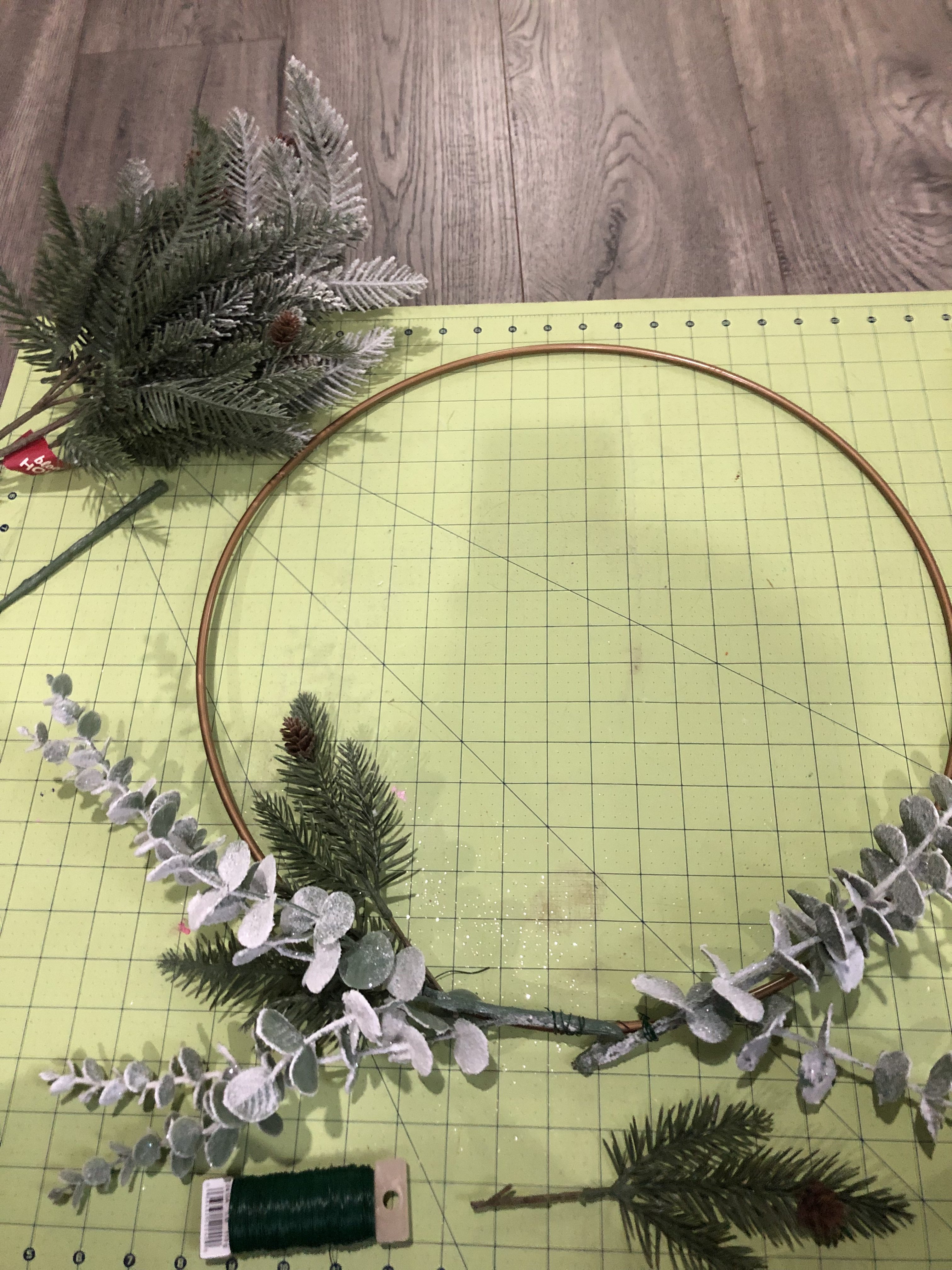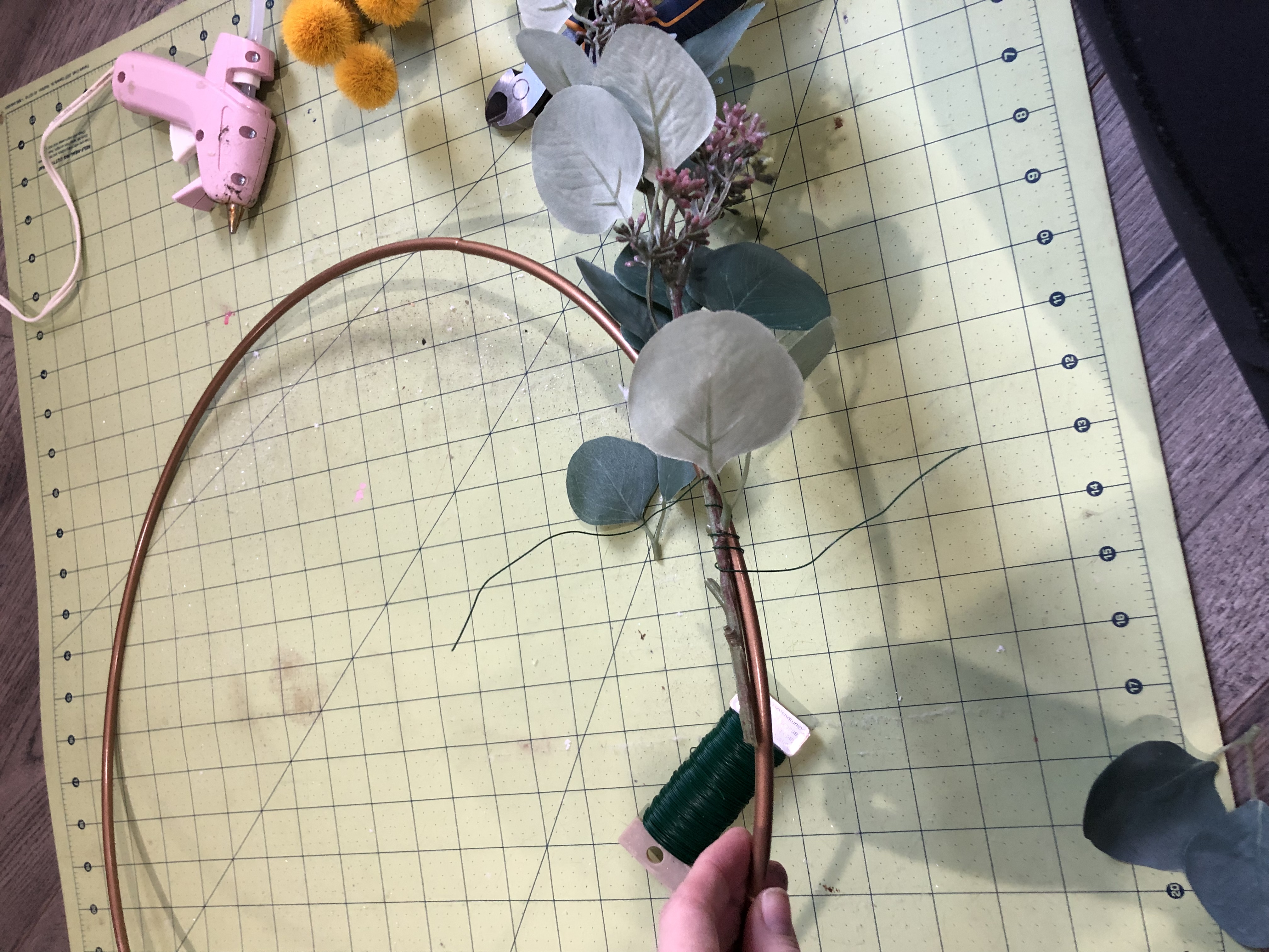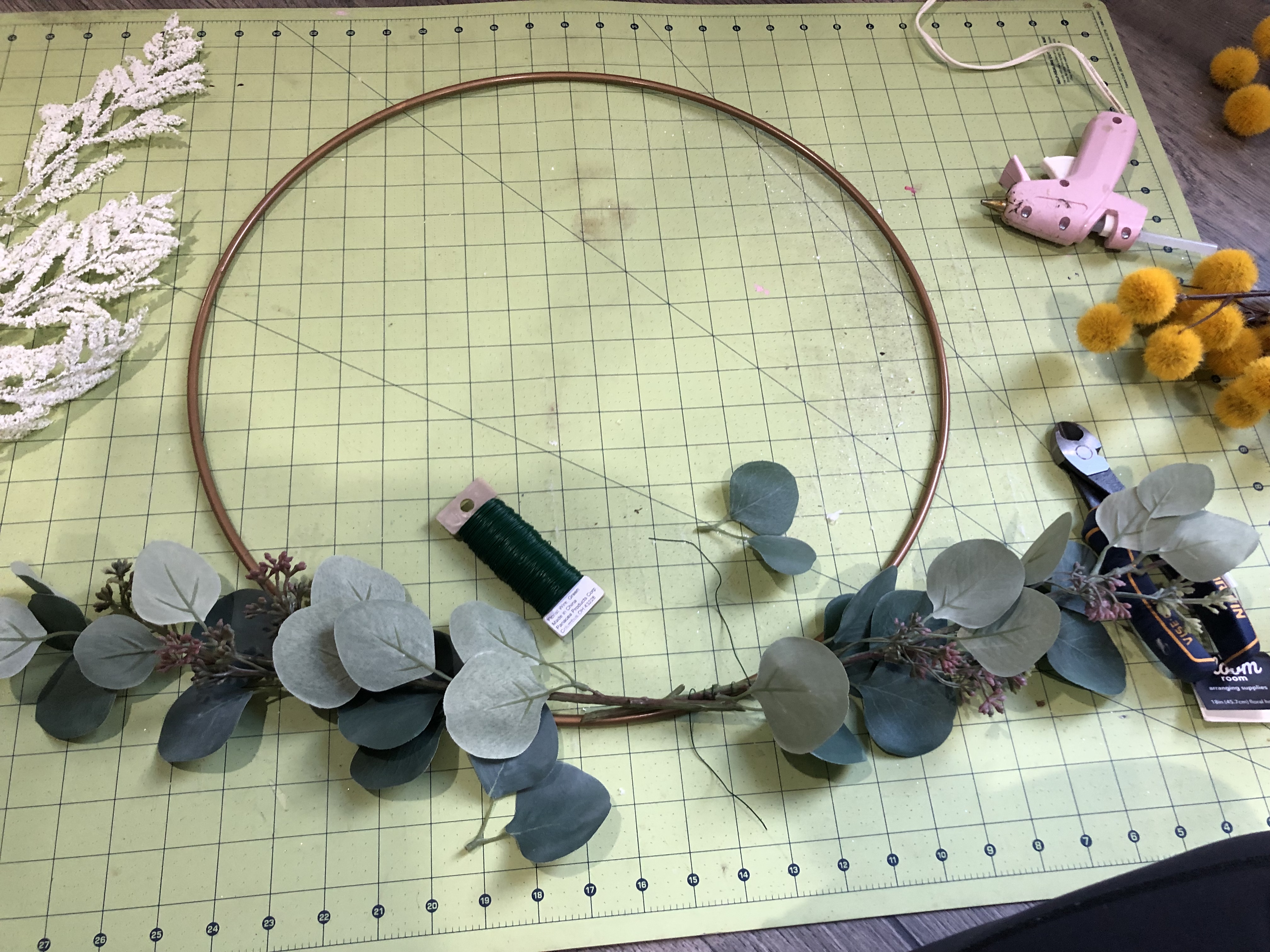 Once, the stems are all in place in the middle of the hoop, work your way up the hoop adding small amounts of floral wire around the greenery stem.