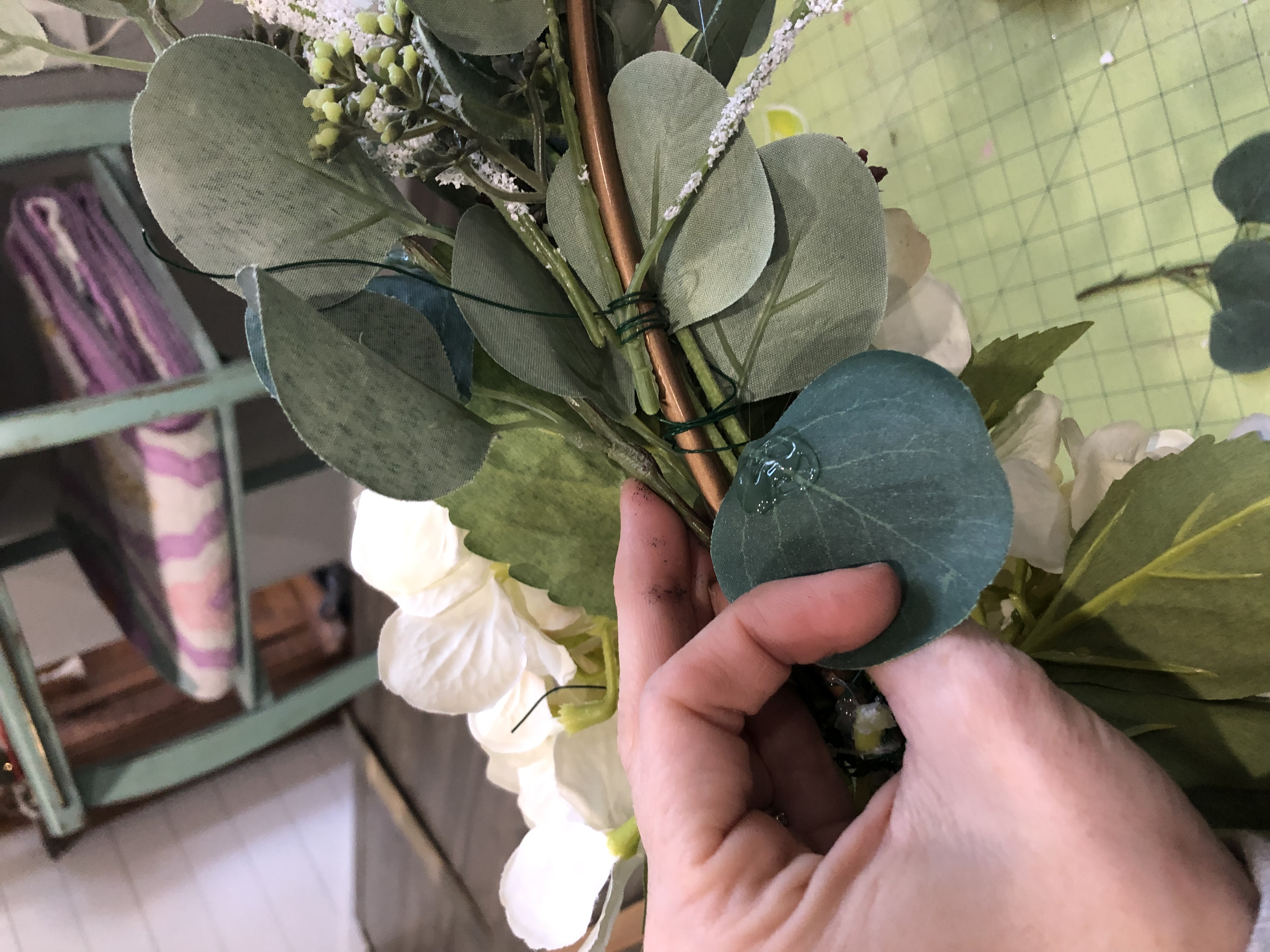 I hot glue gun this piece in, making sure to cover them middle stems that are wrapped in the floral wire.