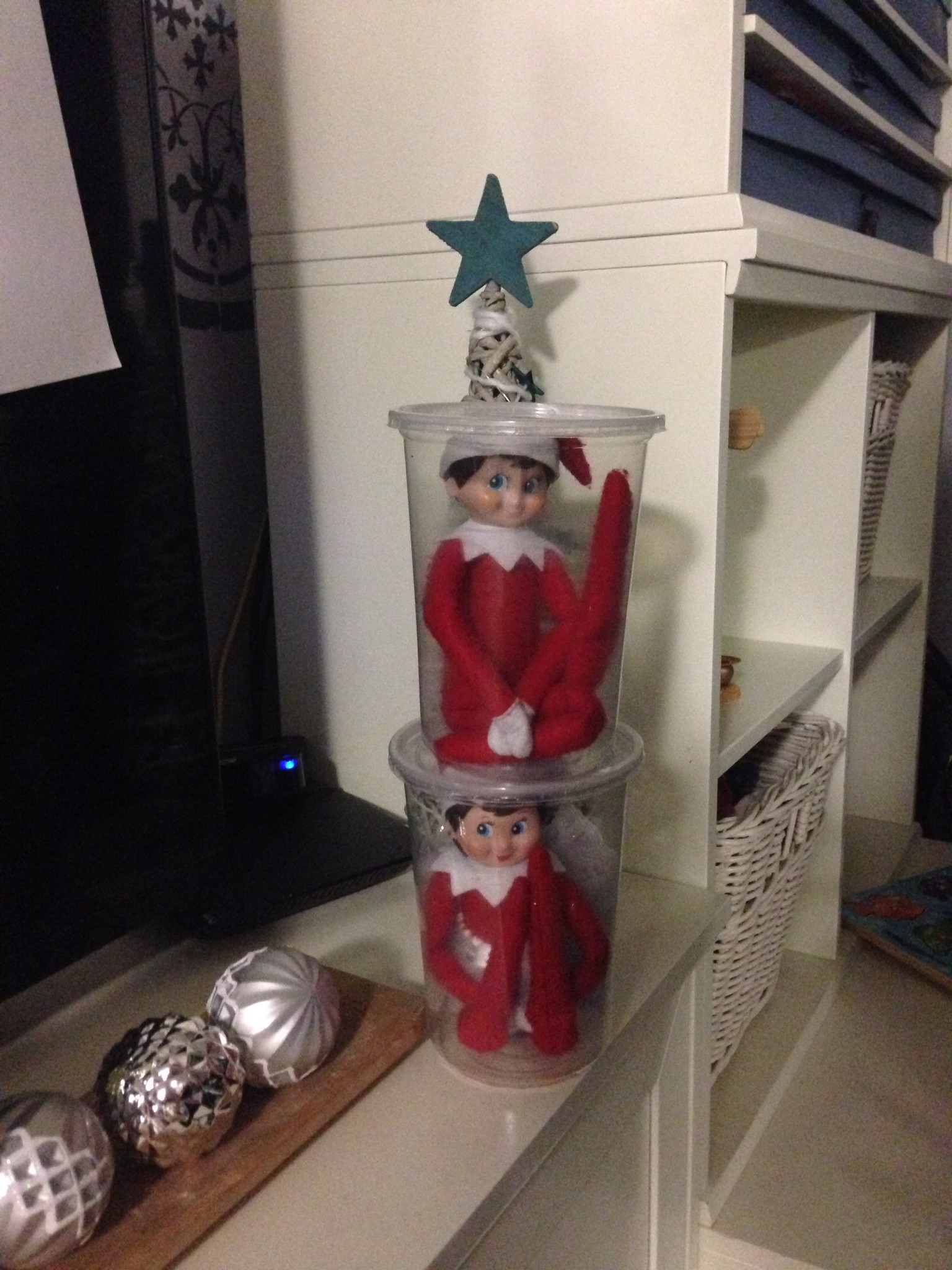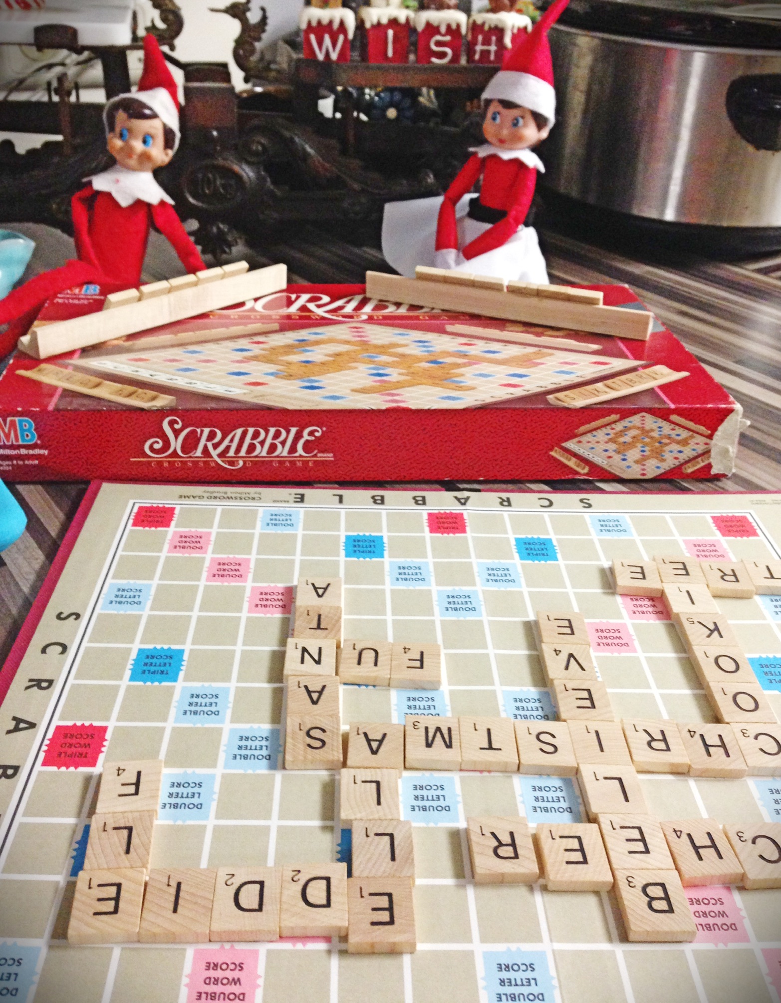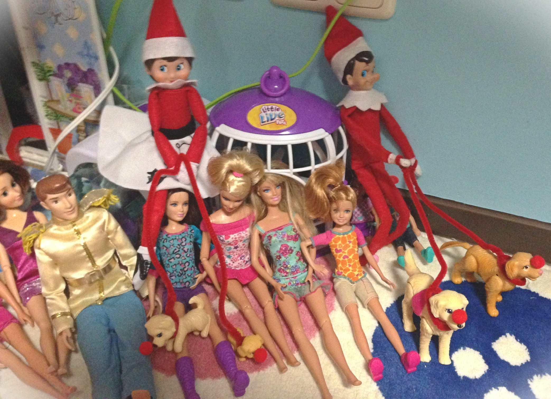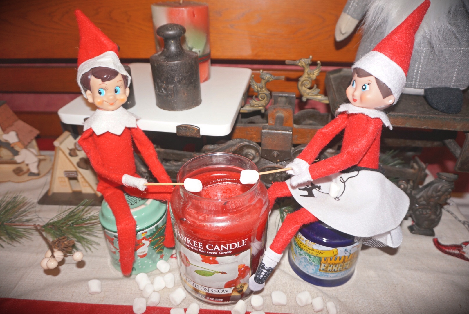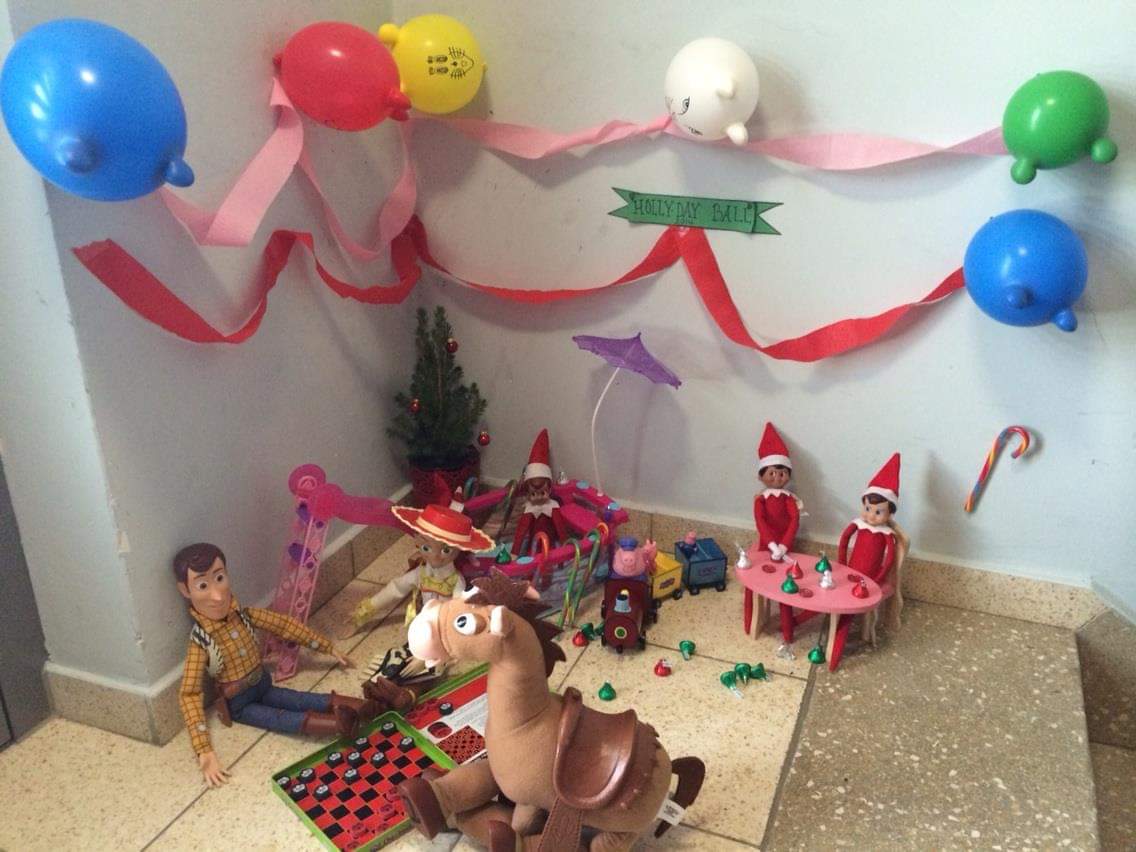 The Elf on the Shelf is back or in our case the elves are back for more fun adventures this Christmas season. Eddie has been with our family for many years now and Ella joined in the fun a couple of years ago while we were in Germany. Cookie, the reindeer and Buddy, the Saint Bernard are now in on the action, as well. It is just one big Elf party!!