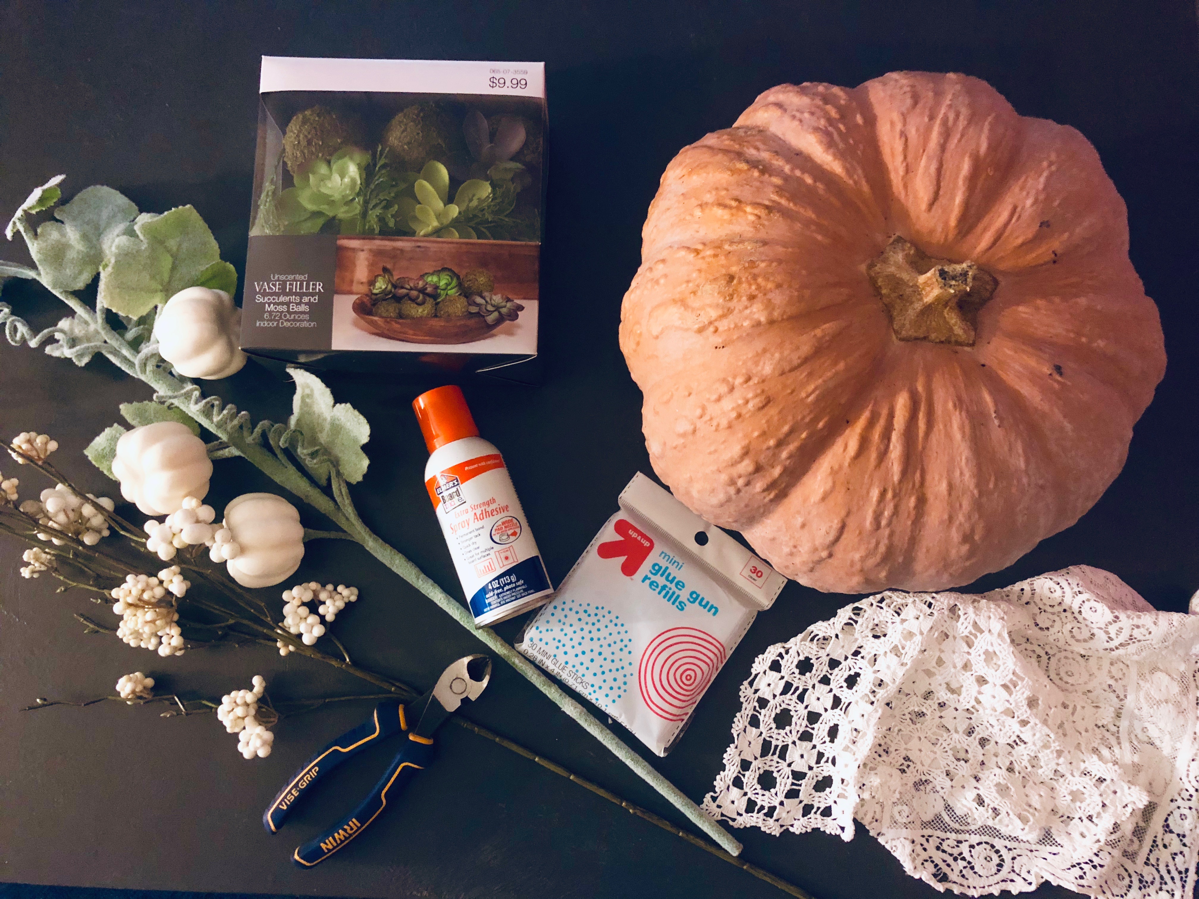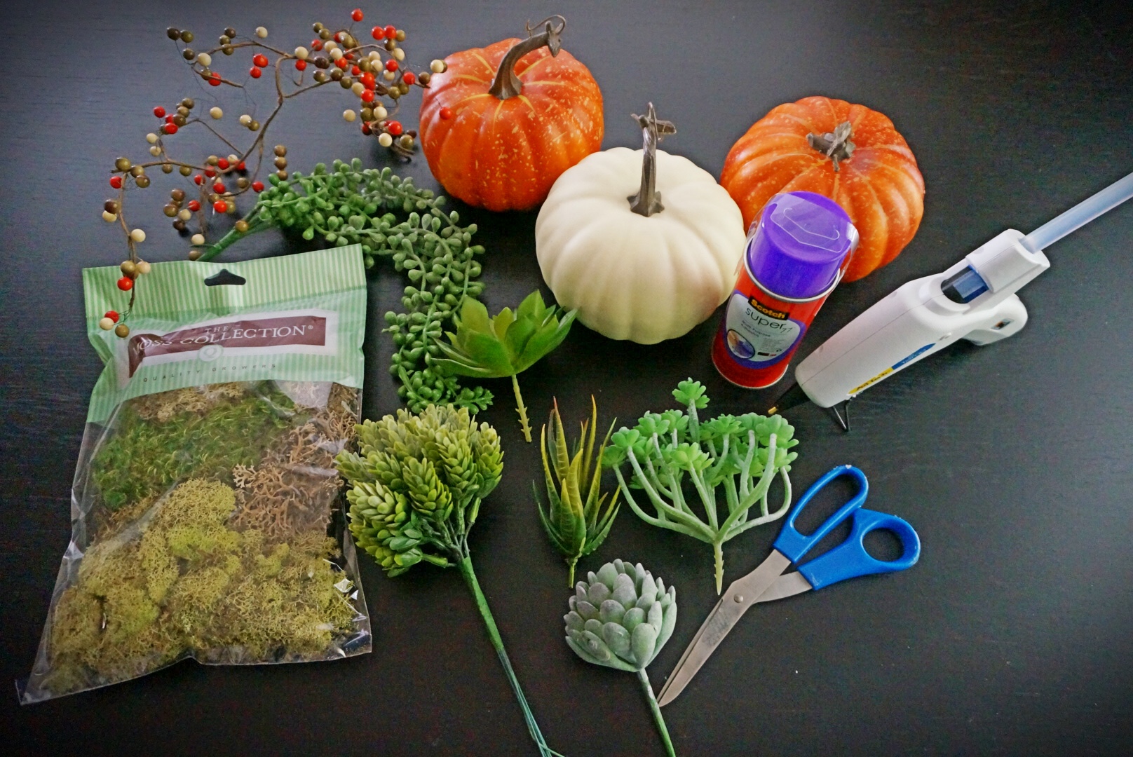 The first step is to spray the adhesive on top of the pumpkin and start placing the moss around the stem, this can get a little messy and sticky. If you are using a real pumpkin and real succulents some tutorials show opening the pumpkin and placing the succulents inside using a green planting block. Jessie and I both used fake succulents for our projects, since we both are lacking a green thumb!!