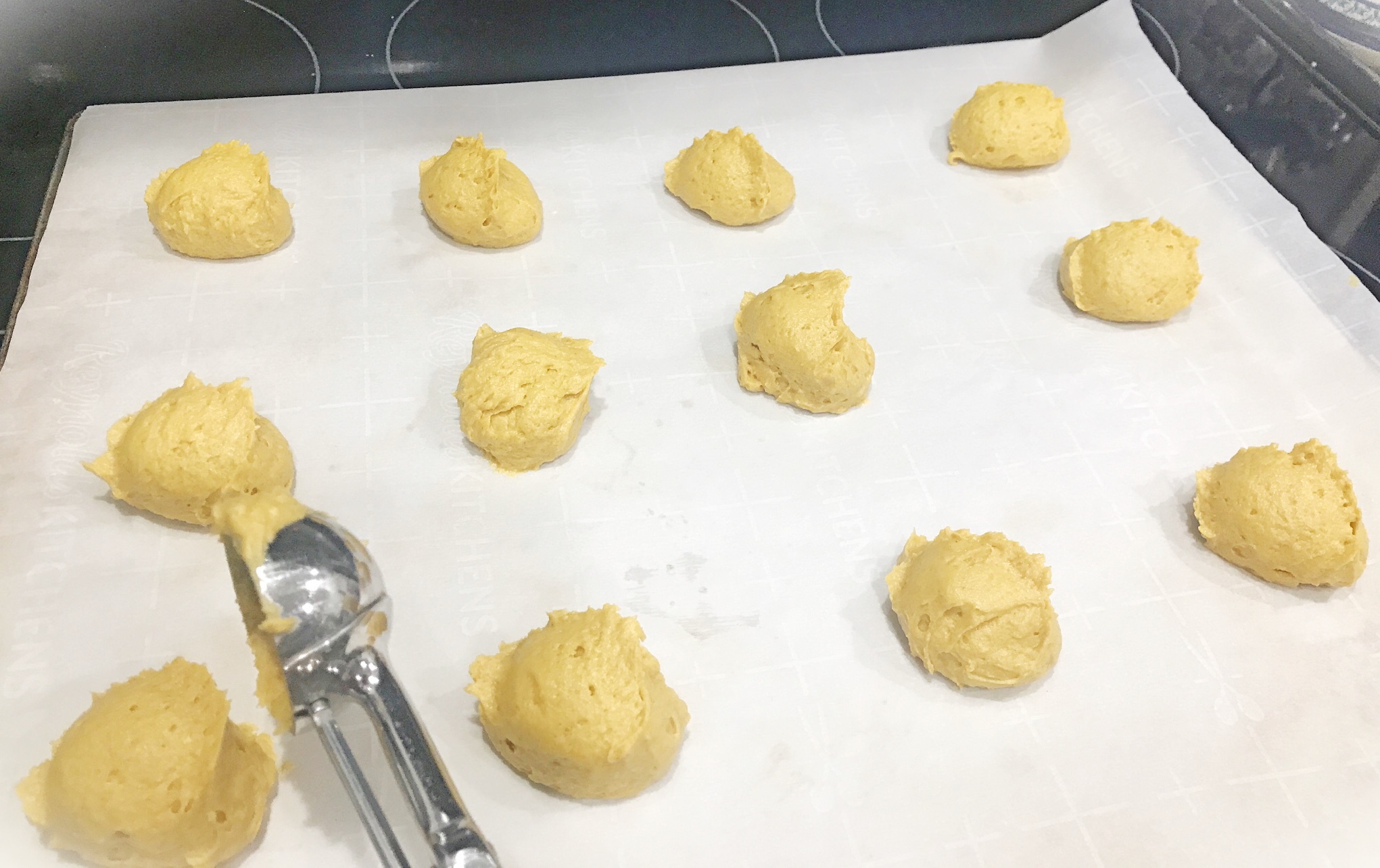 Preheat oven to 350 degrees. In a large mixing bowl, cream together the sugars and butter until light and fluffy. Add pumpkin, vanilla, and egg, beating well. In another bowl, mix together the rest of the dry ingredients (except the nuts). Gradually add the dry mixture to the wet pumpkin mixture, mixing until well blended. Drop the dough by rounded teaspoonfuls onto a parchment paper lined cookie sheet. (I use a cookie scoop because the dough is very wet and sticky). Leave about 2 inches between each cookie so they don’t run into each other.