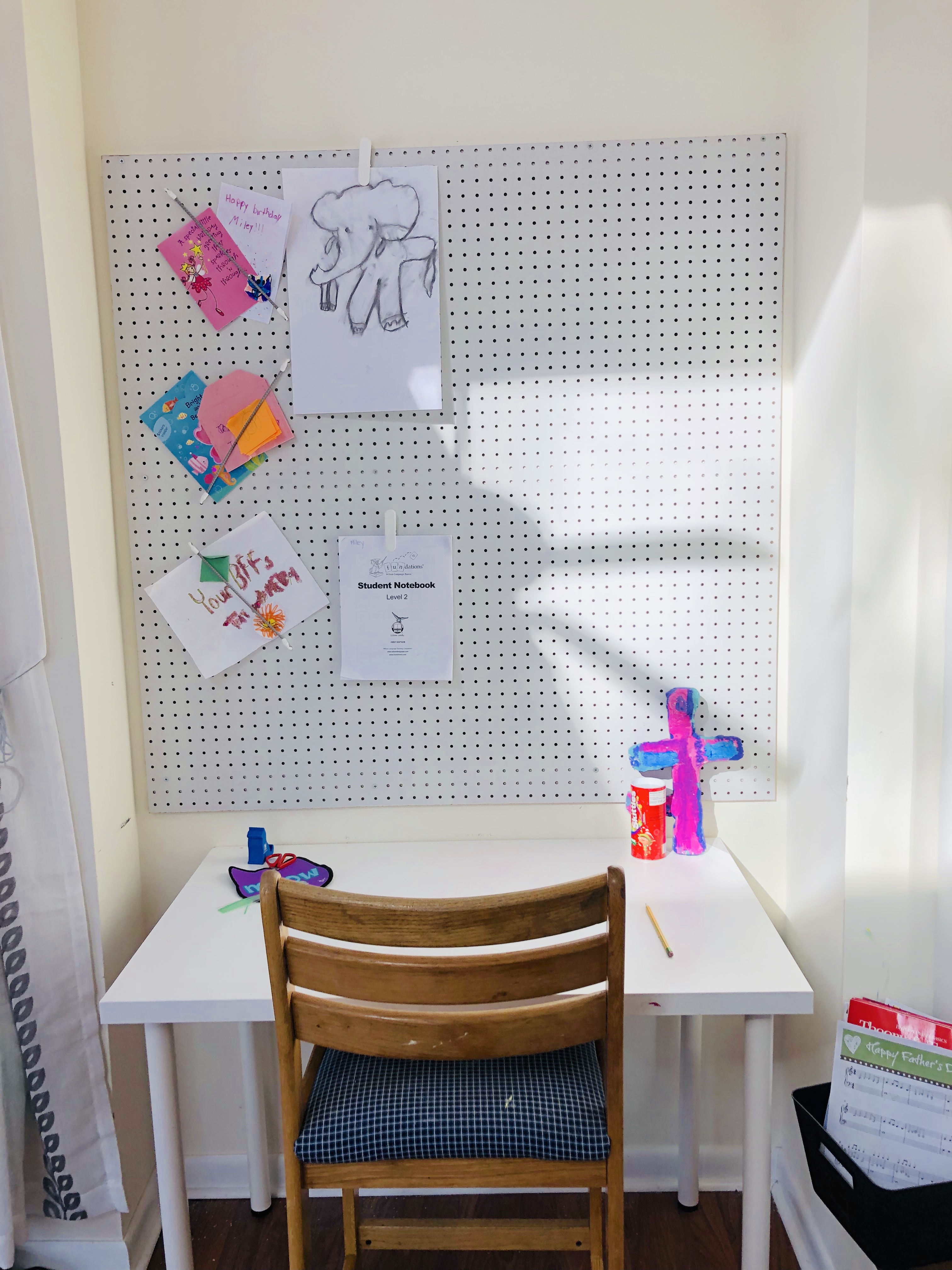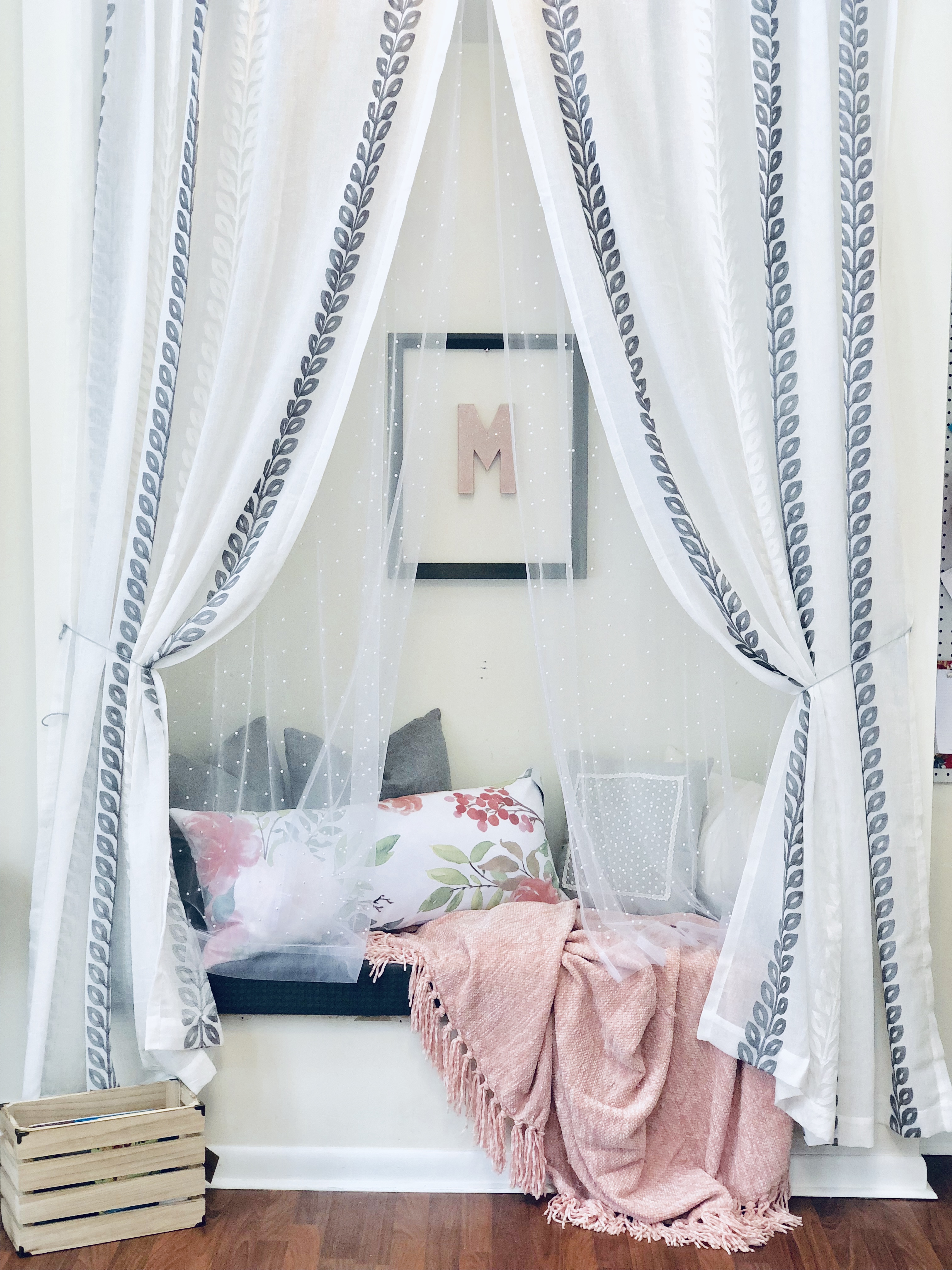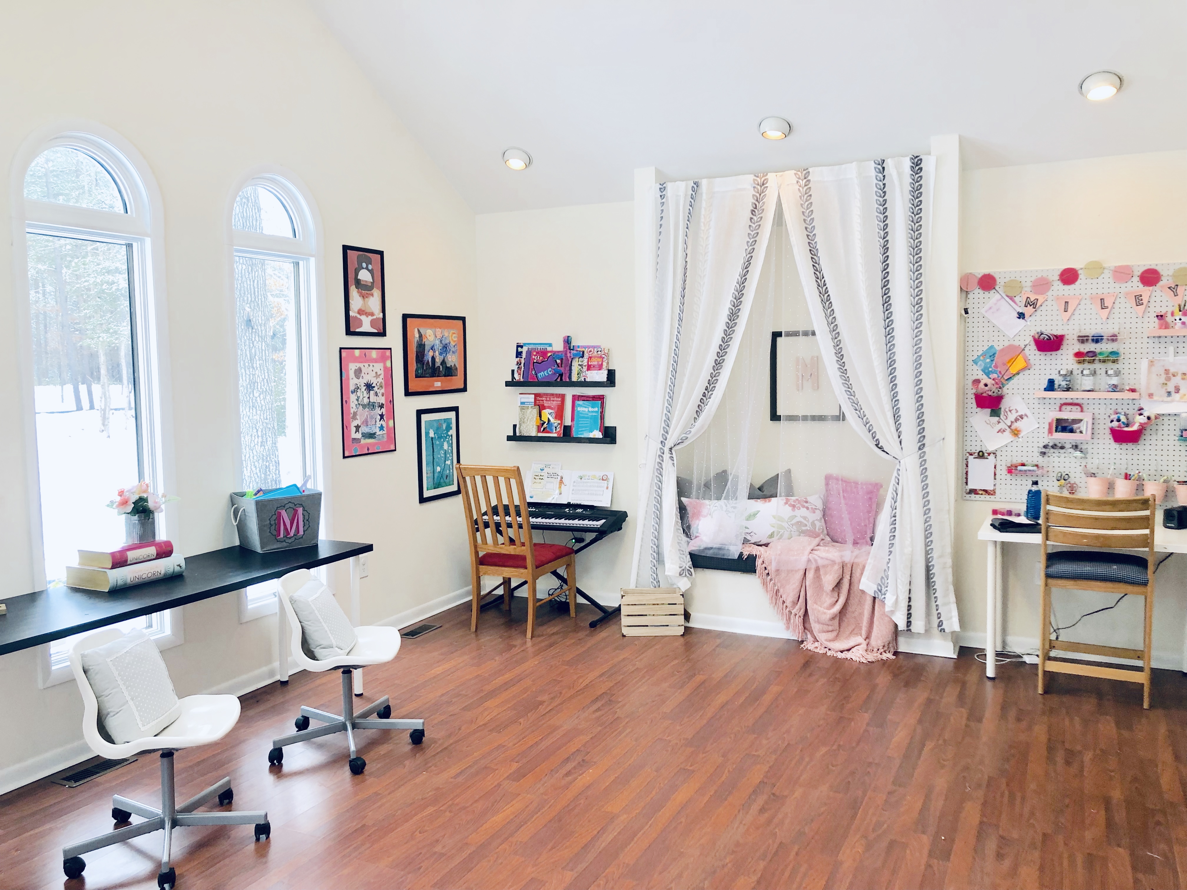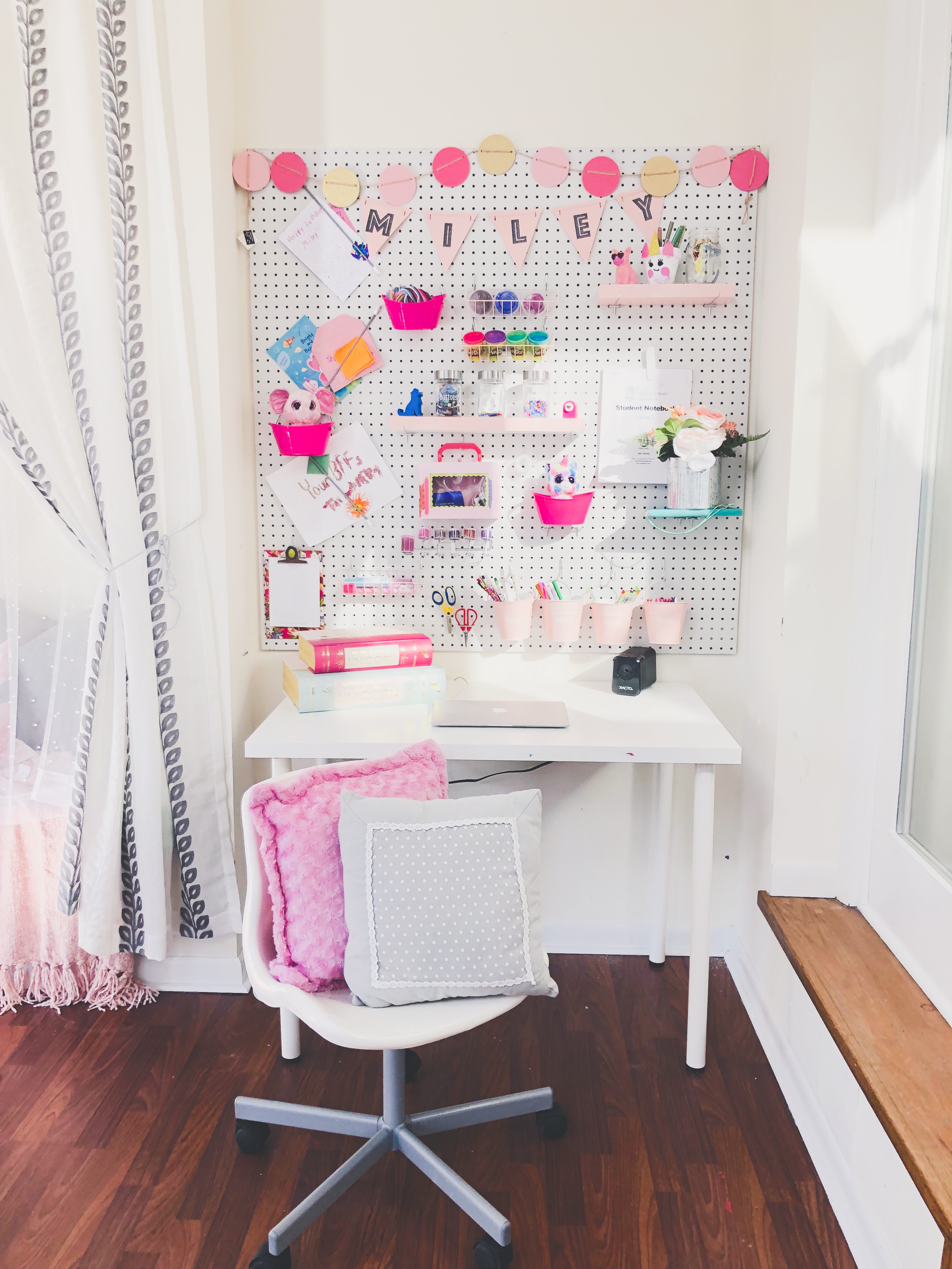 Here is the finished look! I love this room so much…I wanna play in it too!!! This room had so much potential, it is an amazing space with so many windows and natural light. It’s closed off and separate from the rest of the home, so it really is the perfect space for the perfect Playroom. I added lots of little touches to really make this space magical. She now has a music station with added book ledges that I made. A cozy reading nook with curtains, pillow, DIY cushion bench and a custom made frame for a cute focal point. This little peanut is super into crafts and being creative so I wanted an extra special spot for all her creativity. So, I decided on a DIY Pegboard to store all her supplies. Check out the DIY tutorial for the Pegboard at the bottom of the post.