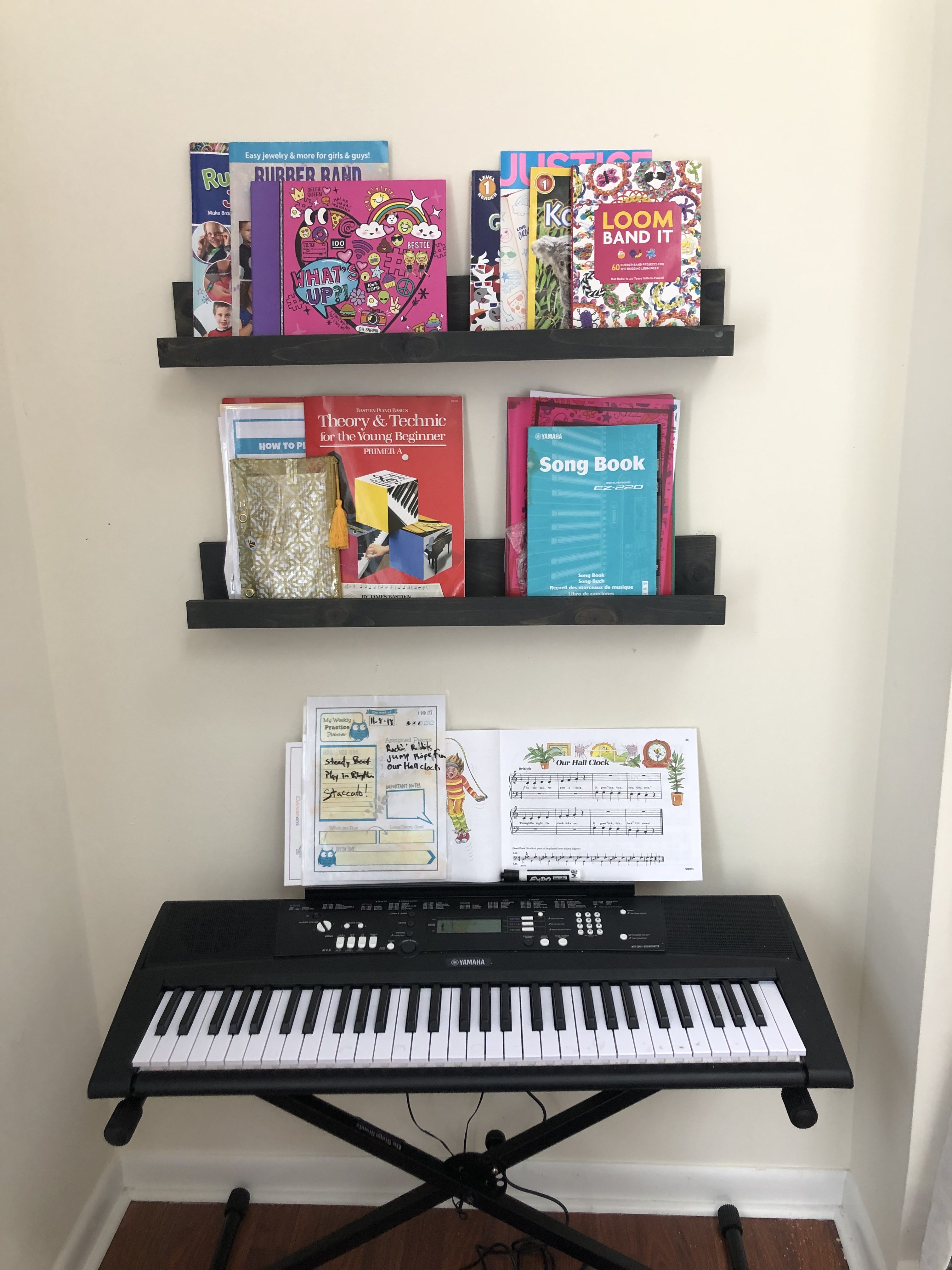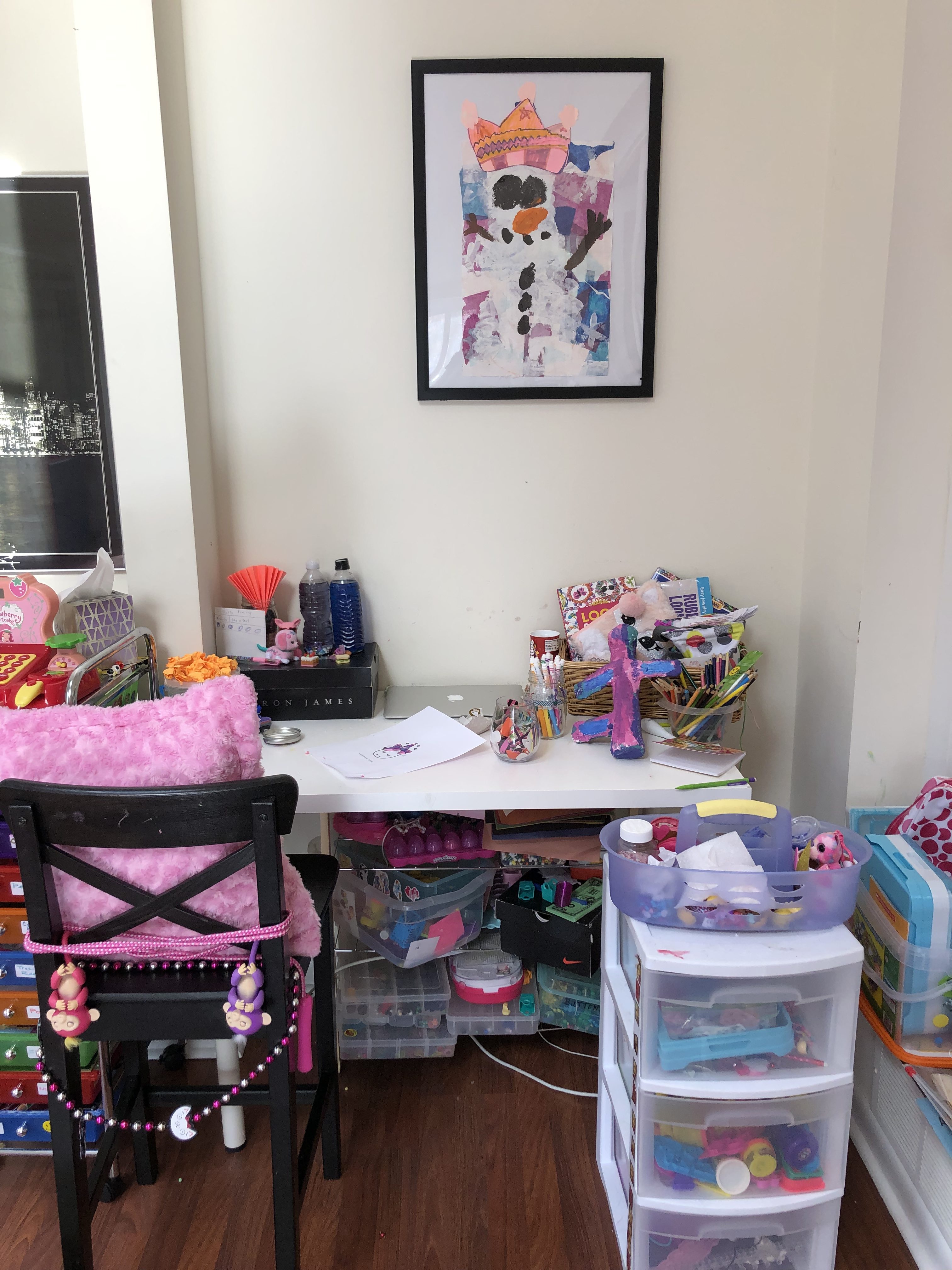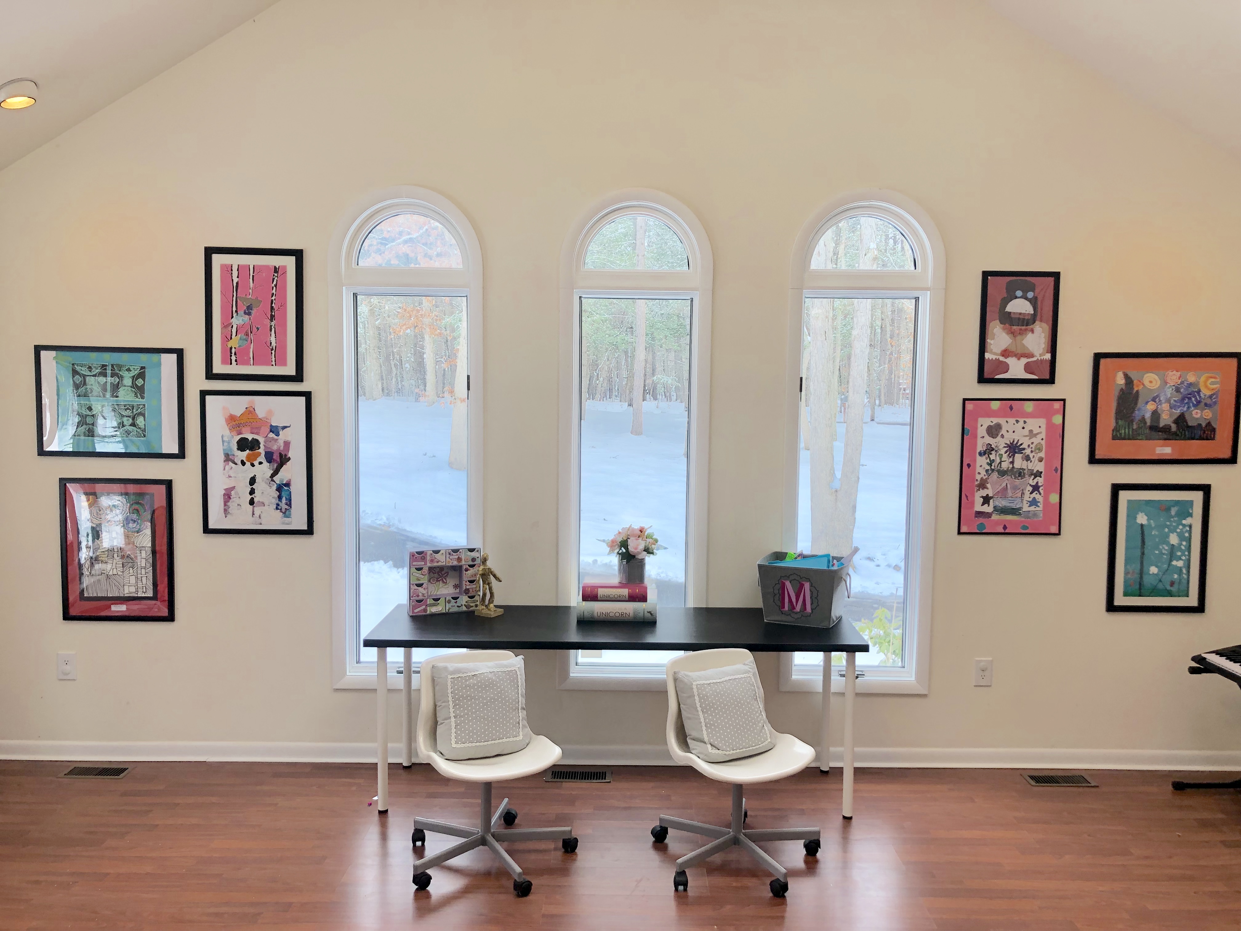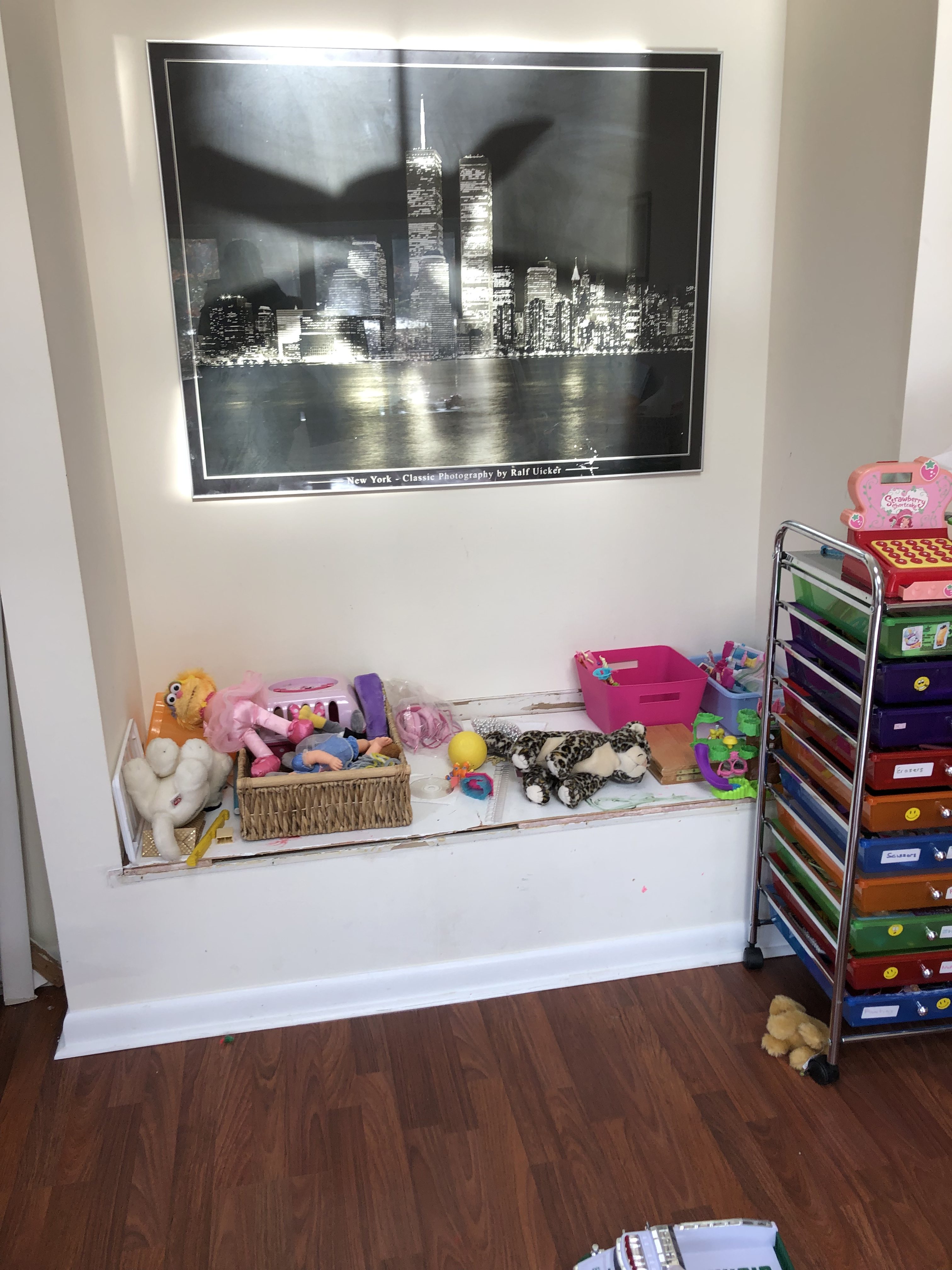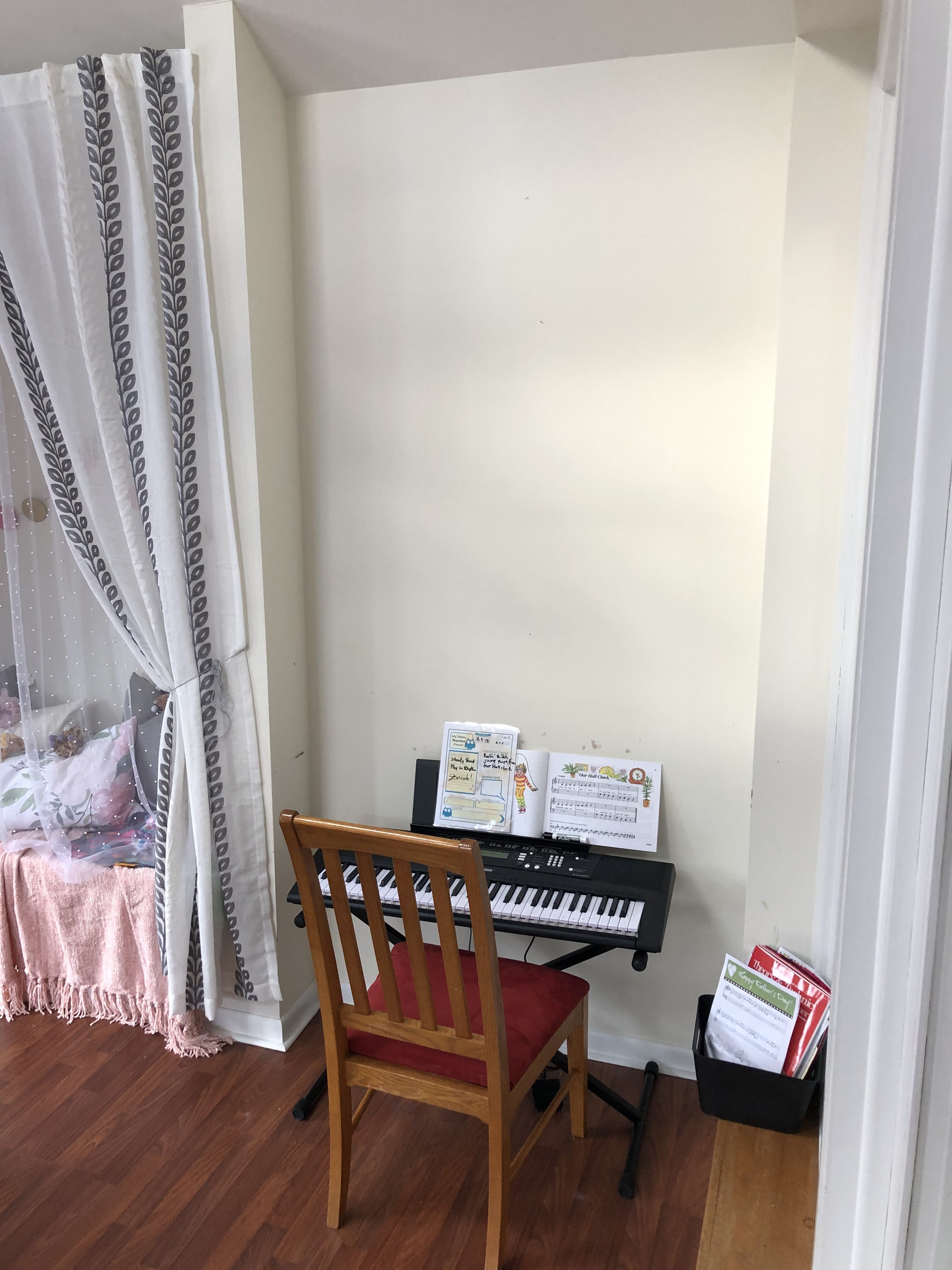 Here is the finished look! I love this room so much…I wanna play in it too!!! This room had so much potential, it is an amazing space with so many windows and natural light. It’s closed off and separate from the rest of the home, so it really is the perfect space for the perfect Playroom. I added lots of little touches to really make this space magical. She now has a music station with added book ledges that I made. A cozy reading nook with curtains, pillow, DIY cushion bench and a custom made frame for a cute focal point. This little peanut is super into crafts and being creative so I wanted an extra special spot for all her creativity. So, I decided on a DIY Pegboard to store all her supplies. Check out the DIY tutorial for the Pegboard at the bottom of the post.