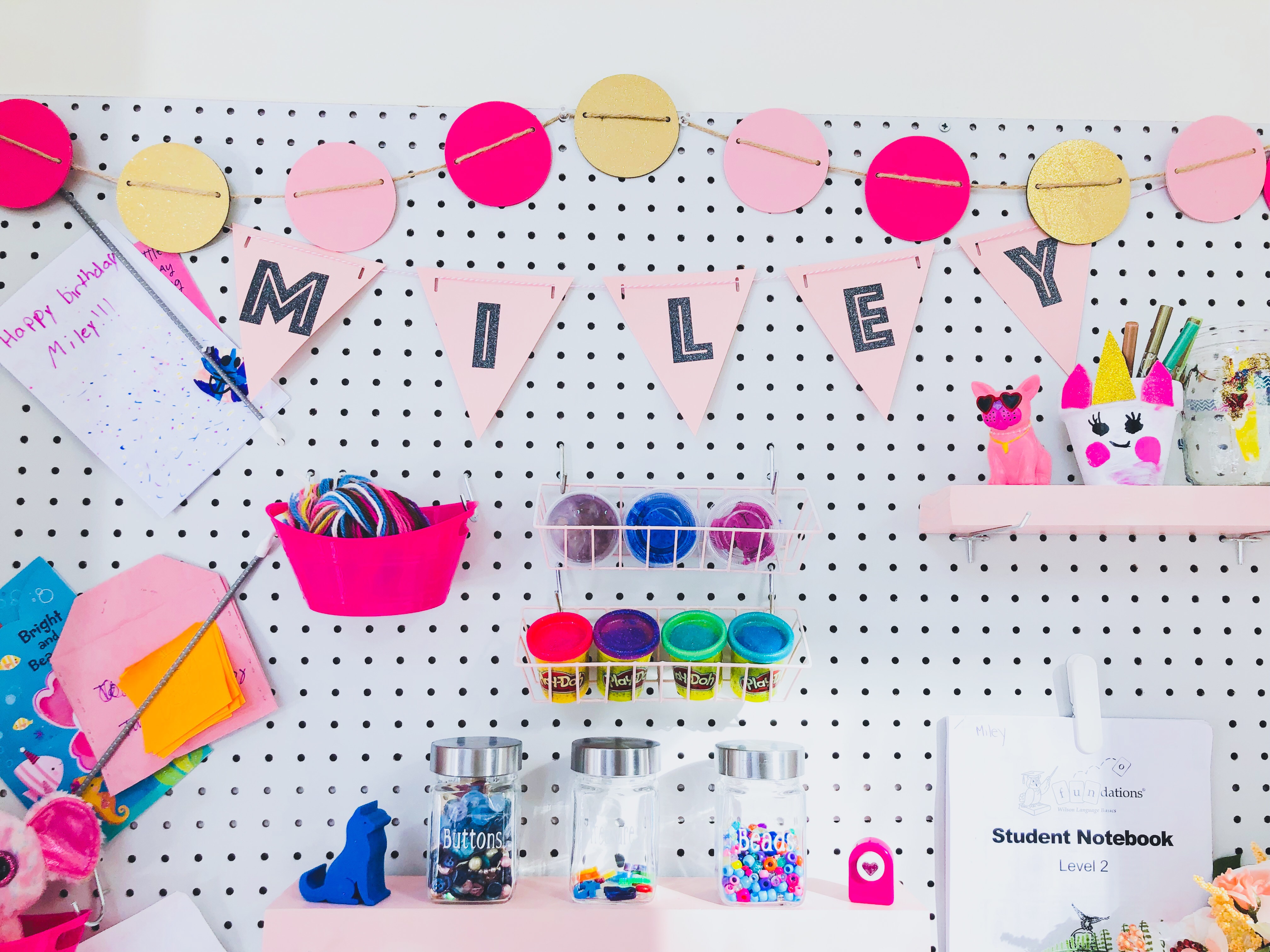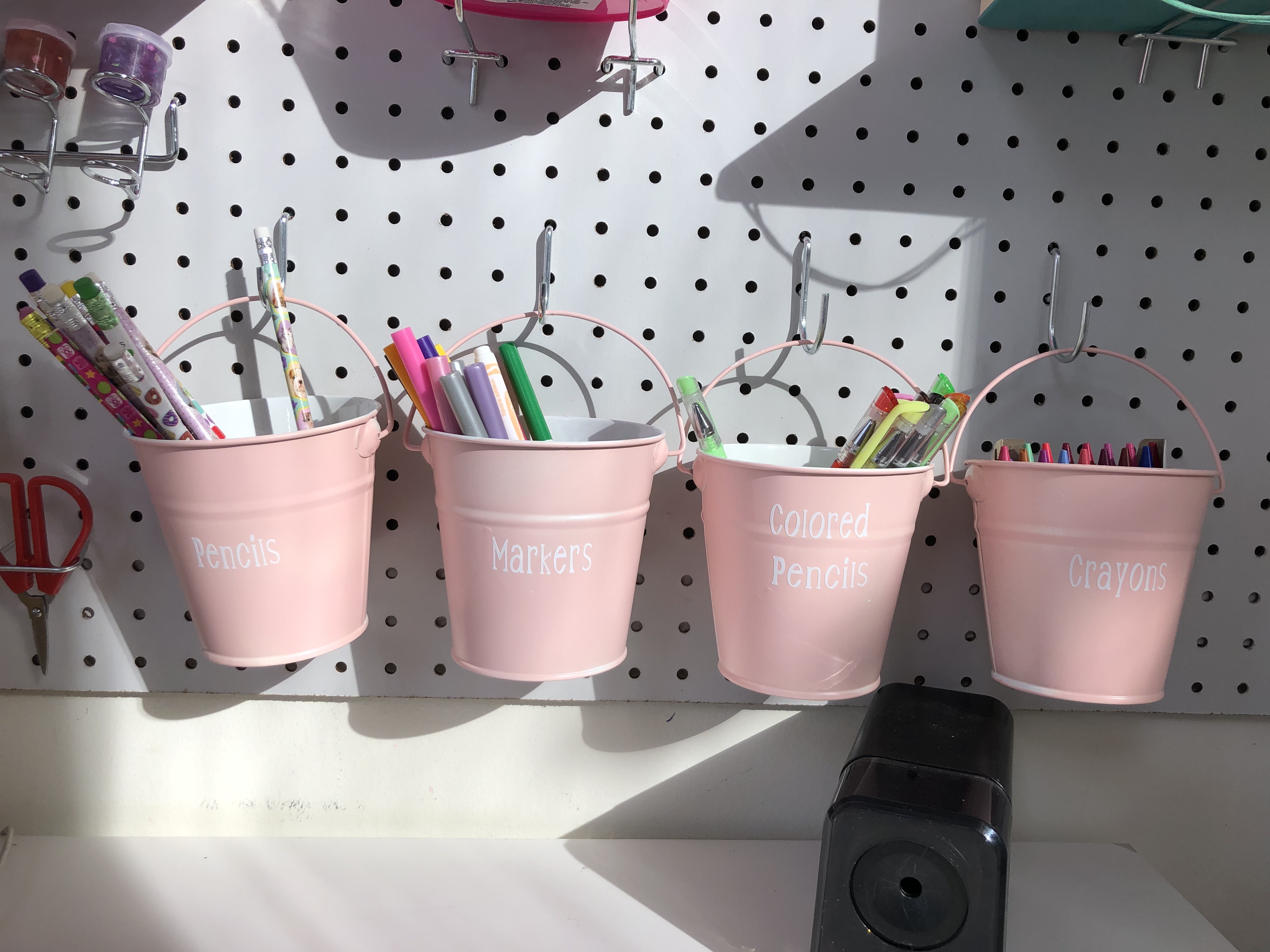 Step 4: Once the Pegboard is hung and secure, now comes the fun part Organizing and Decorating. I ordered a pegboard organizing kit from amazon that came with all the pegs. I made a few little shelves with scrap wood I had, it was 1 X 4 and spray-painted them pink. Then I also, added buckets I found at Hobby Lobby and spray-painted them as well. I found a few little wire baskets and plastic baskets at the dollar store and of course spray painted them as well. Then I used my Cricut to add labels to all the craft supplies. Once everything started going up on the board it really started to come alive!!