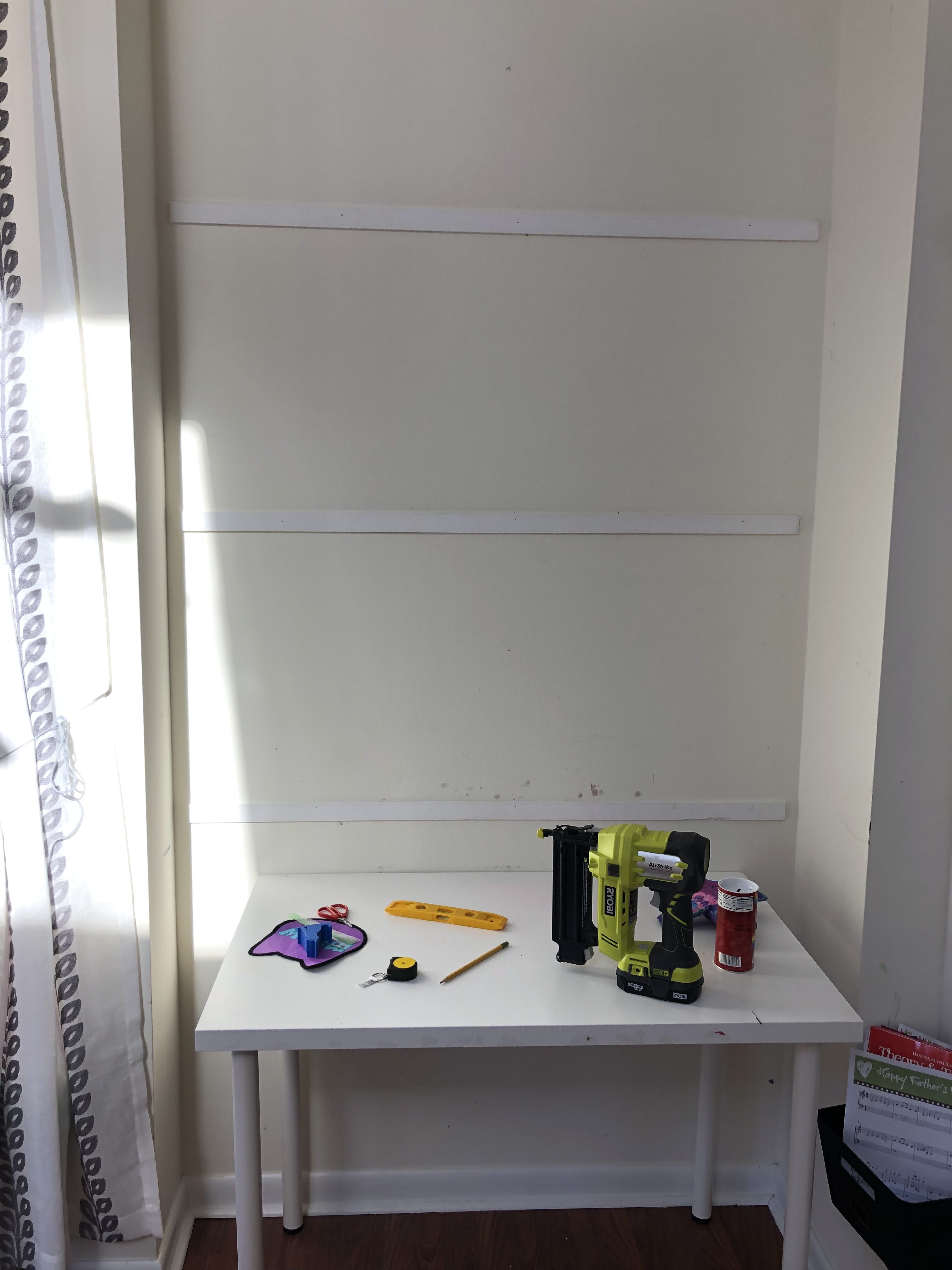 Step 1: Let’s find our studs. Realistically they should be every 16″, but you never really know what’s going on behind those walls! Mark all your studs on the wall.