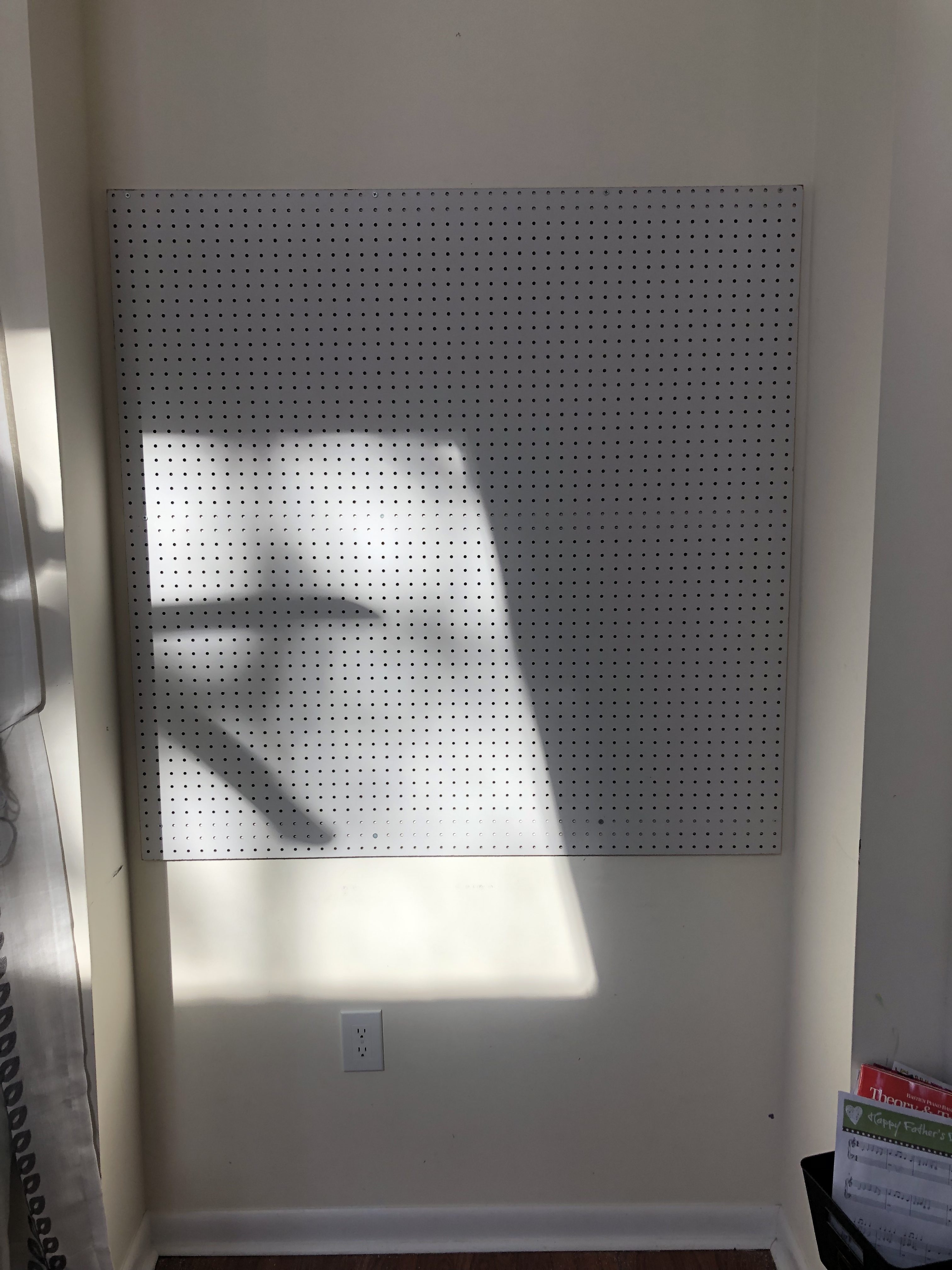 Step 3: Hanging the Pegboard. Ideally you would have two people for this part, these boards are pretty big and awkward. I only have two hands, so if anyone ever watched me doing all these parts by myself I’m sure they would die of laughter, I use anything I can my head, legs… so ridiculous!
