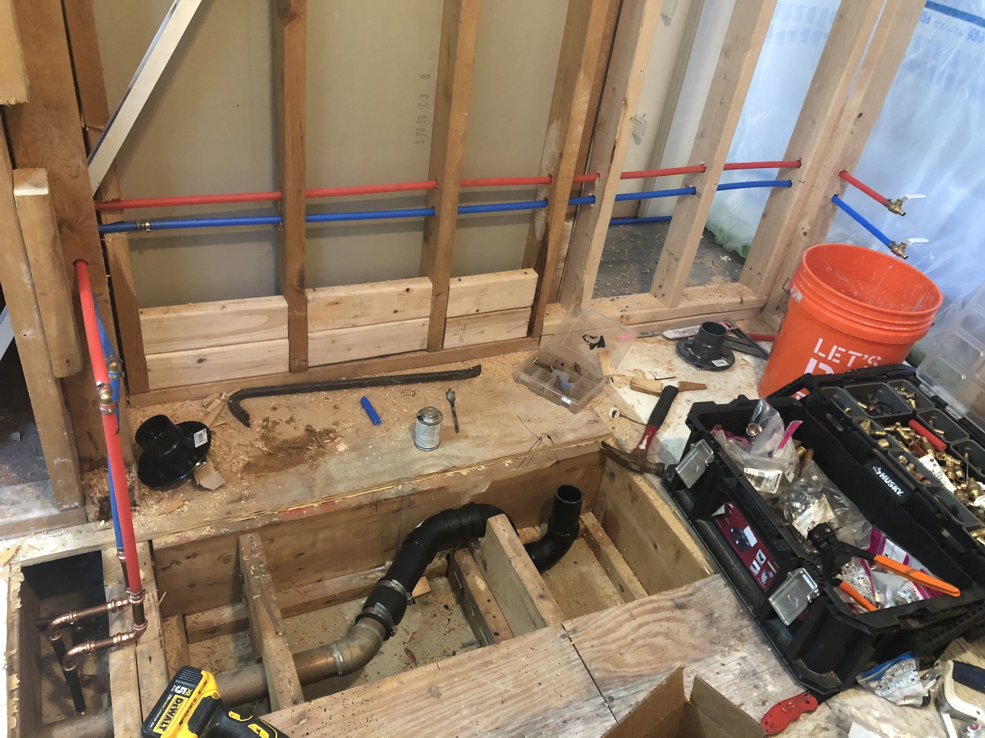 The plumbers rerouted all of my plumbing from one side of the room to the new wall I framed out from my daughters’ bedroom closet. The pipes were located in the center of the room and were free-standing once I took out the wall. They ran the new shower pipes across the side wall through the framing and up the new back wall. I am going to install a rain head shower system, along with a handheld and regular shower head. Just wait till you see the finish I chose, it’s beyond amazing!!