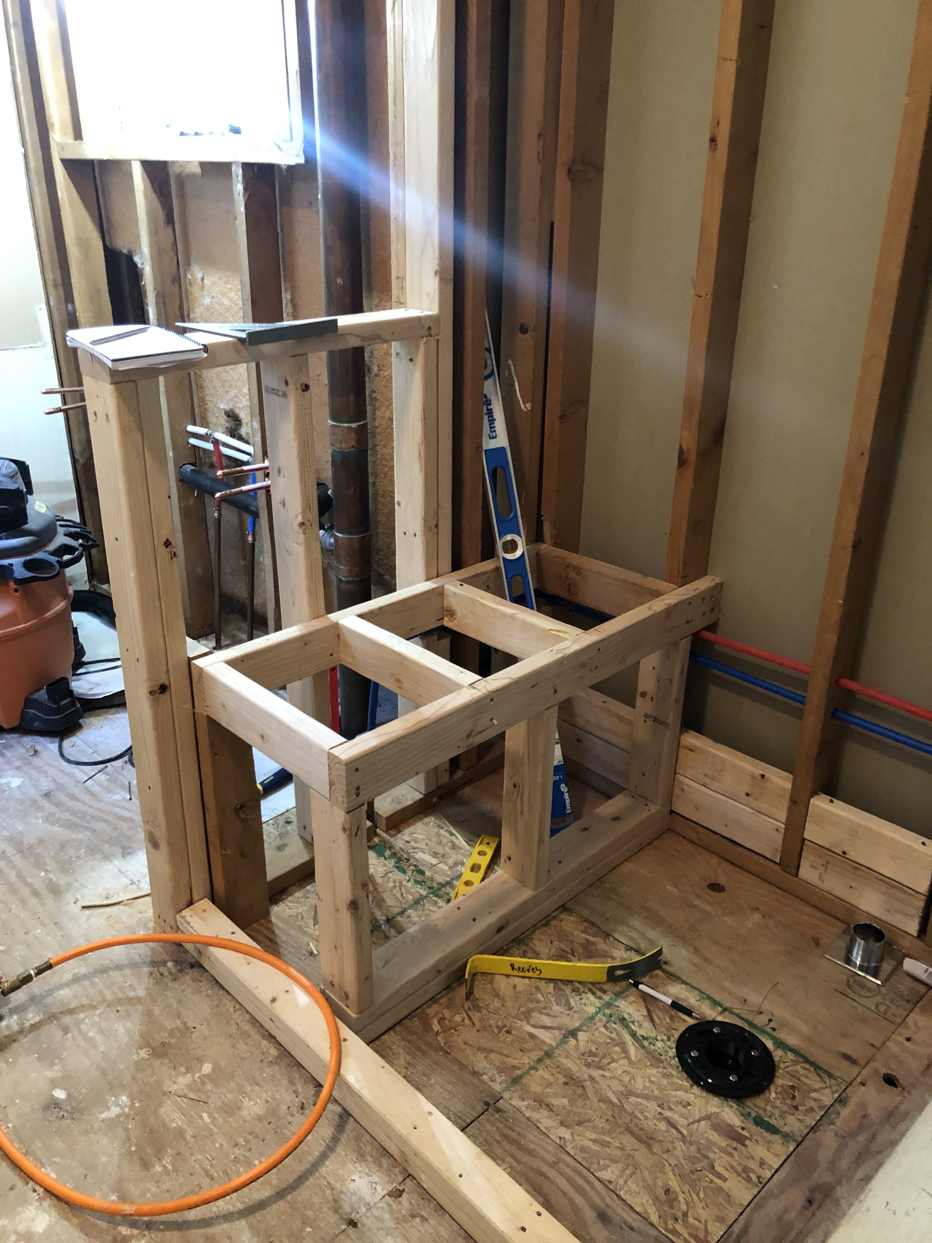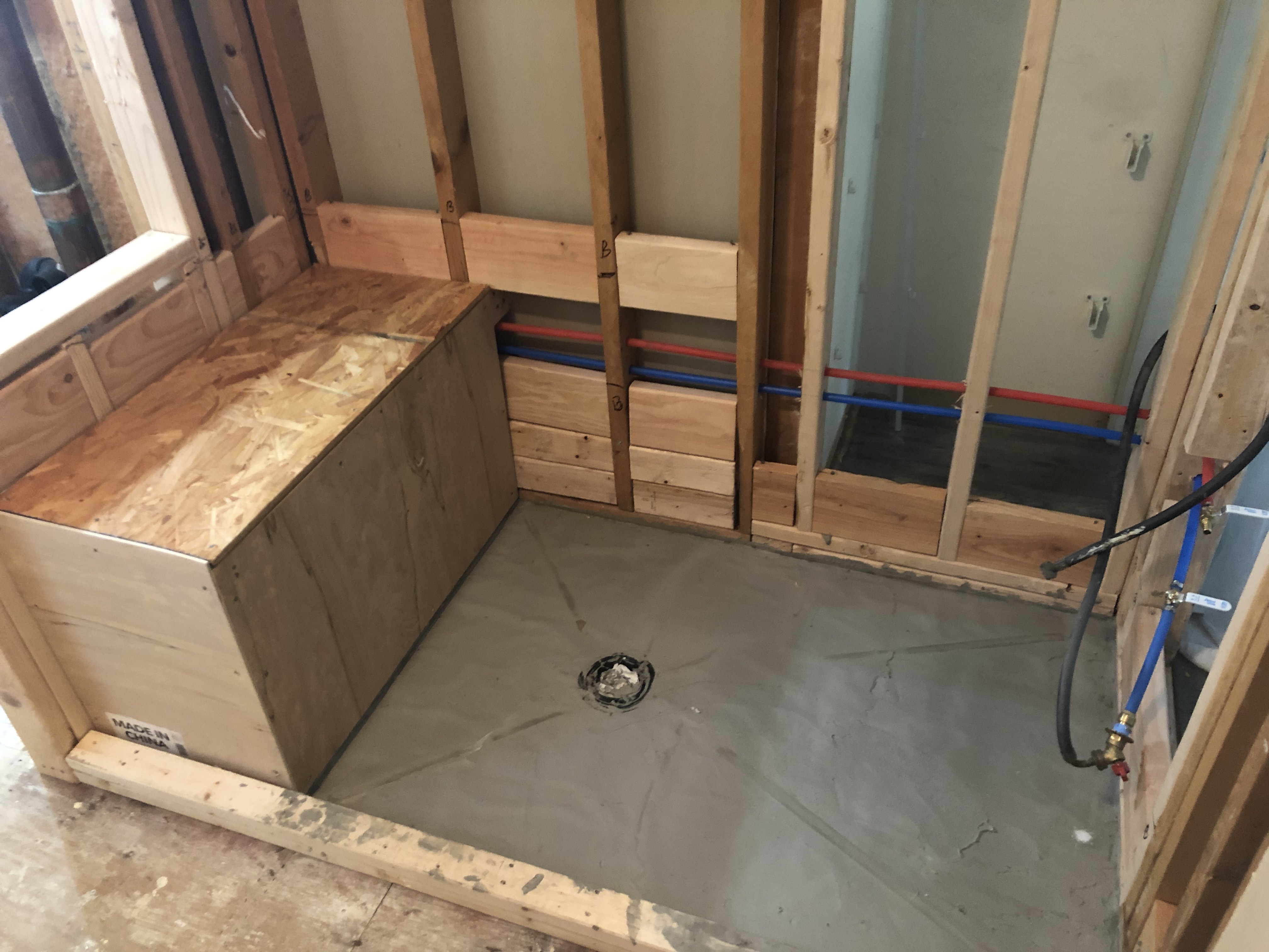 I also had the plumbers install a custom wet-bed for the shower floor. They needed to reposition the drain location and figure out the pitch so that the water would drain properly. This is where I bowed out gracefully…Pitch…1/8″ every foot…might as well have been speaking a foreign language. So, I left that to the real professionals. I did however frame out the shower and a make a custom bench for the space with the help of my amazing friend and contractor, who has become an incredible teacher to me through my journey of becoming a DIY-er.