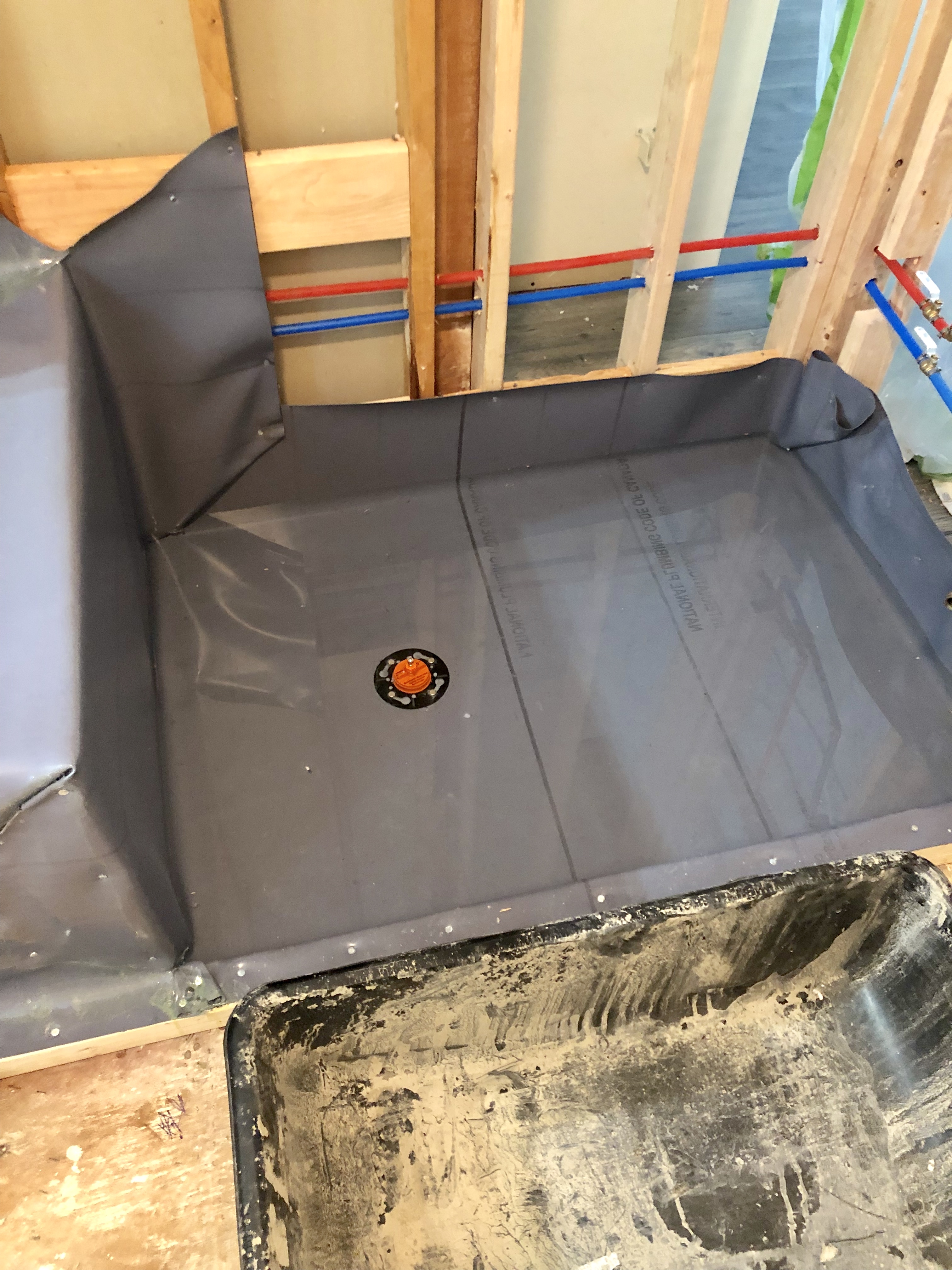 It was very cool to watch the plumbers make the wet-bed. First, they laid the thin set, then they added concrete and plastic vinyl. Then, they plugged the drain and filled the shower base with water over night to make sure there weren’t any leaks. Just so we are clear, no one ever went over what I should do if there was a leak. Yikes! Don’t worry, no issues. The plumbers finish up in the next day or two.