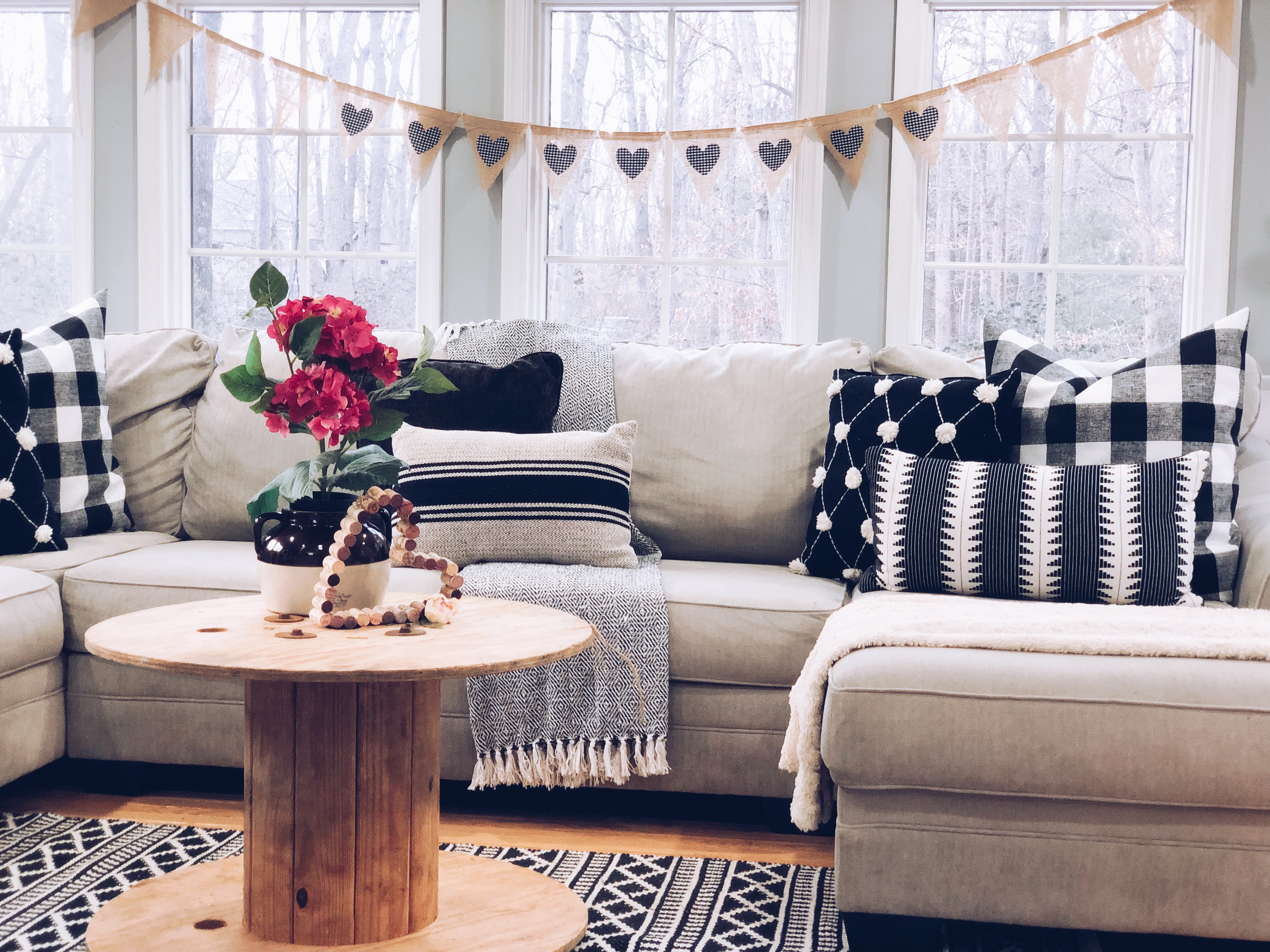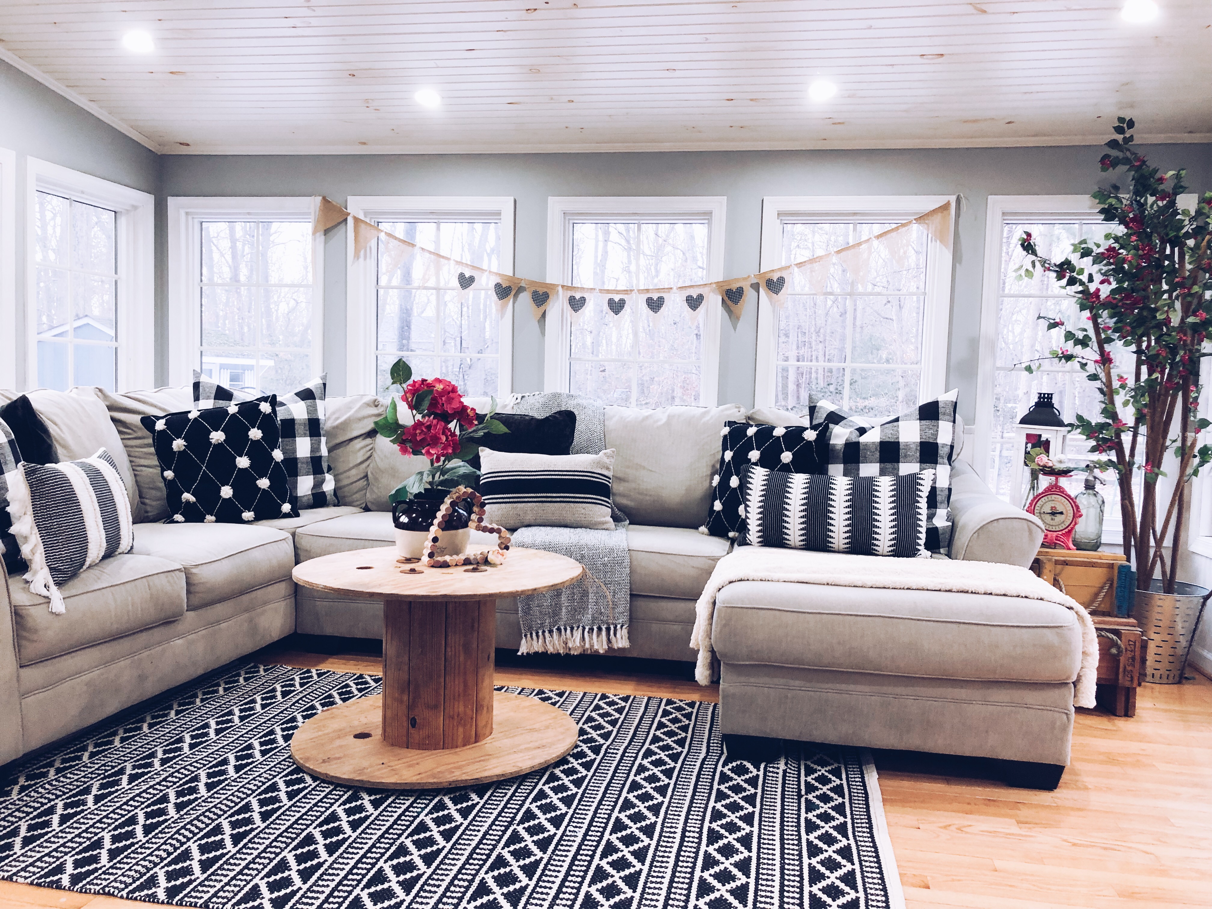 Sunroom styled for Valentine’s Day