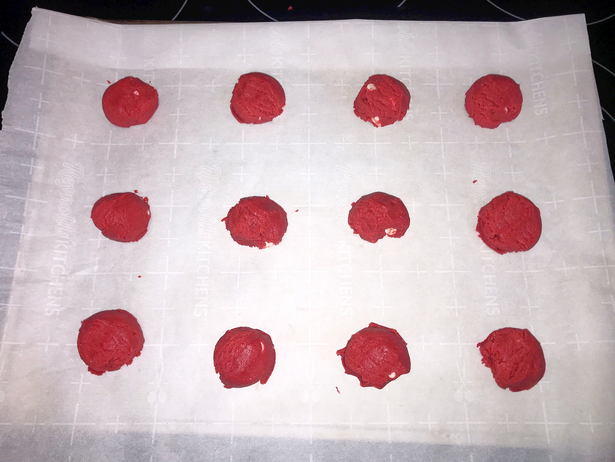 Slowly add dry ingredients and mix until just combined. Stir in ½ cup white chocolate chips. Scoop cookies onto parchment-lined baking sheet. Bake cookies for 11 minutes. Allow to cool for a few minutes before moving to wire rack.
