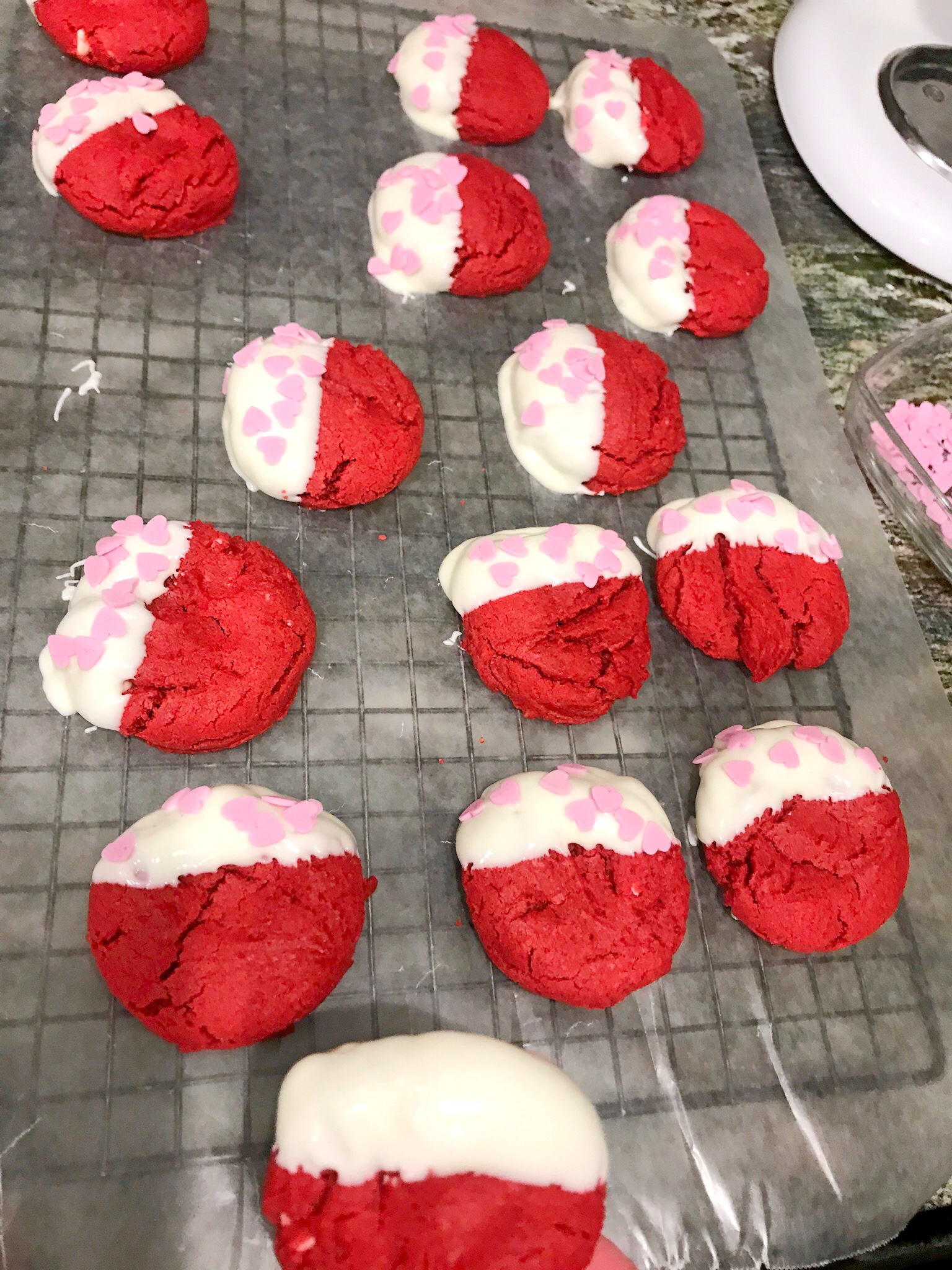Every place I have been to this week is filled with hearts, candy, treats, and all things red and pink. I figured I better get into the Valentine’s spirit a little bit and bake some of my kids favorite cookies. A few years ago I went to a Valentine’s cookie exchange and this Red Velvet Cookie recipe was the cookie the kids requested be made again. The cookies are so yummy and actually very versatile…these also work well for Christmas, just use different color sprinkles!