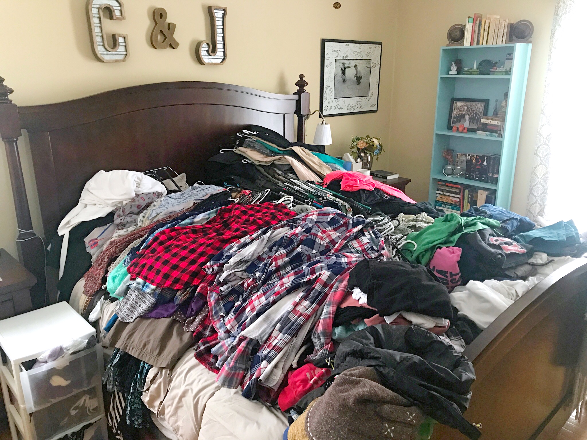 The clothes were first up and it took almost the whole weekend. It is pretty eye-opening to see it all laid out in front of you.I knew I had a lot but was still shocked. Four bags of clothes, two bags of shoes for donation and one bag of trash later I started to fold and put away. My closet feels lighter and I got rid of all the under-bed storage we had and a mysterious bin filled with clothes in the back of the closet. All my clothes fit into my closet now and I discovered so many things I