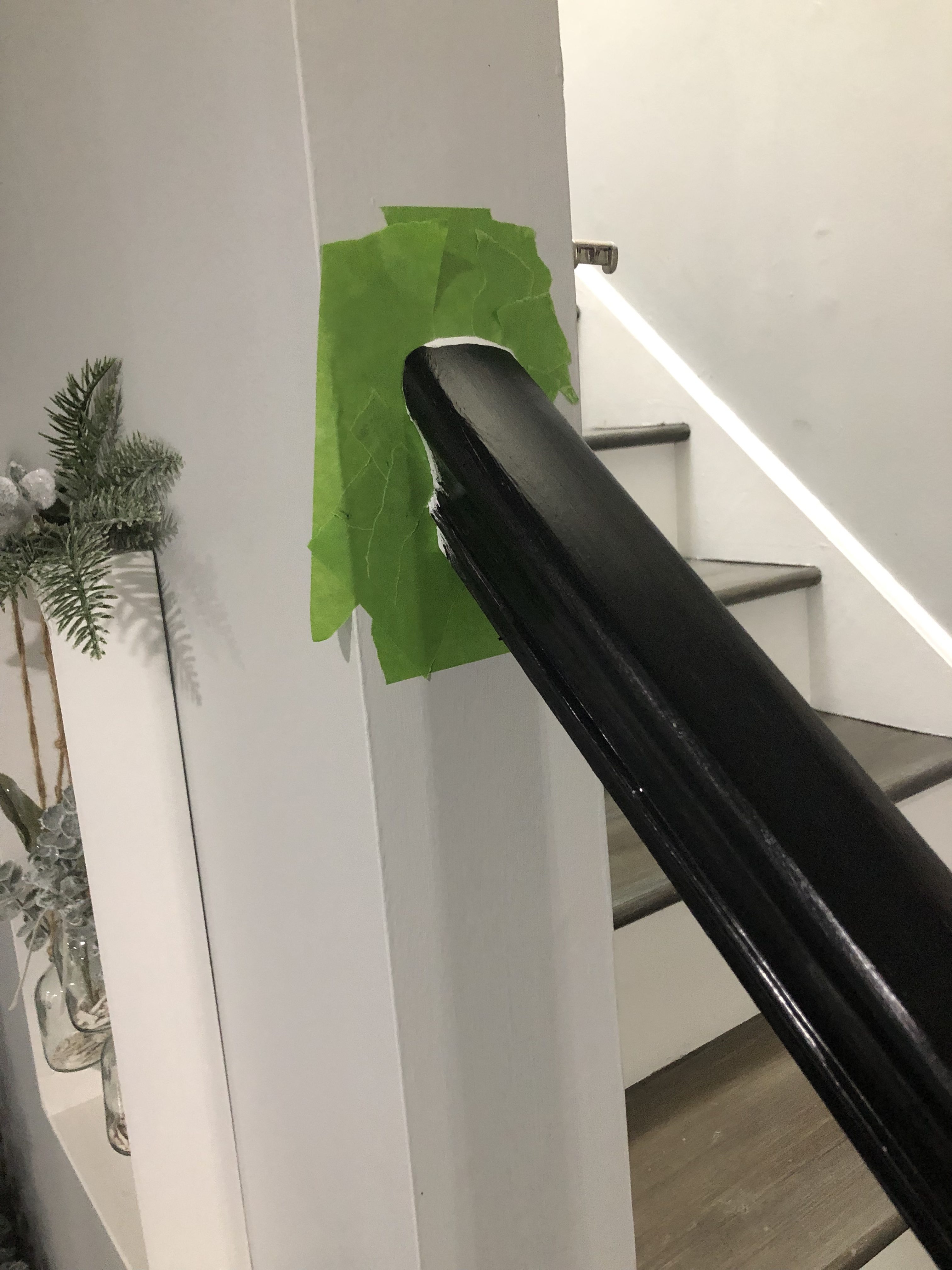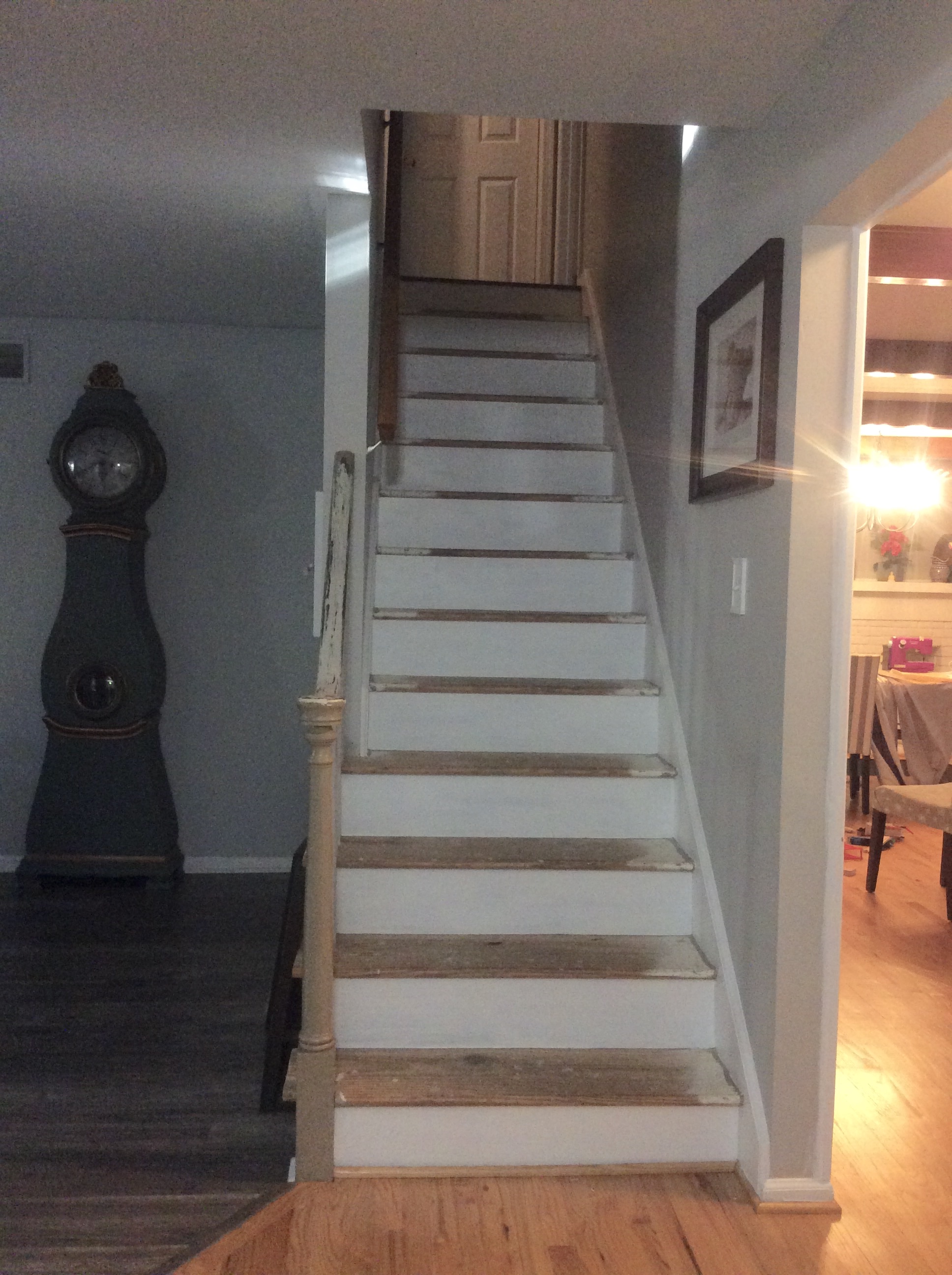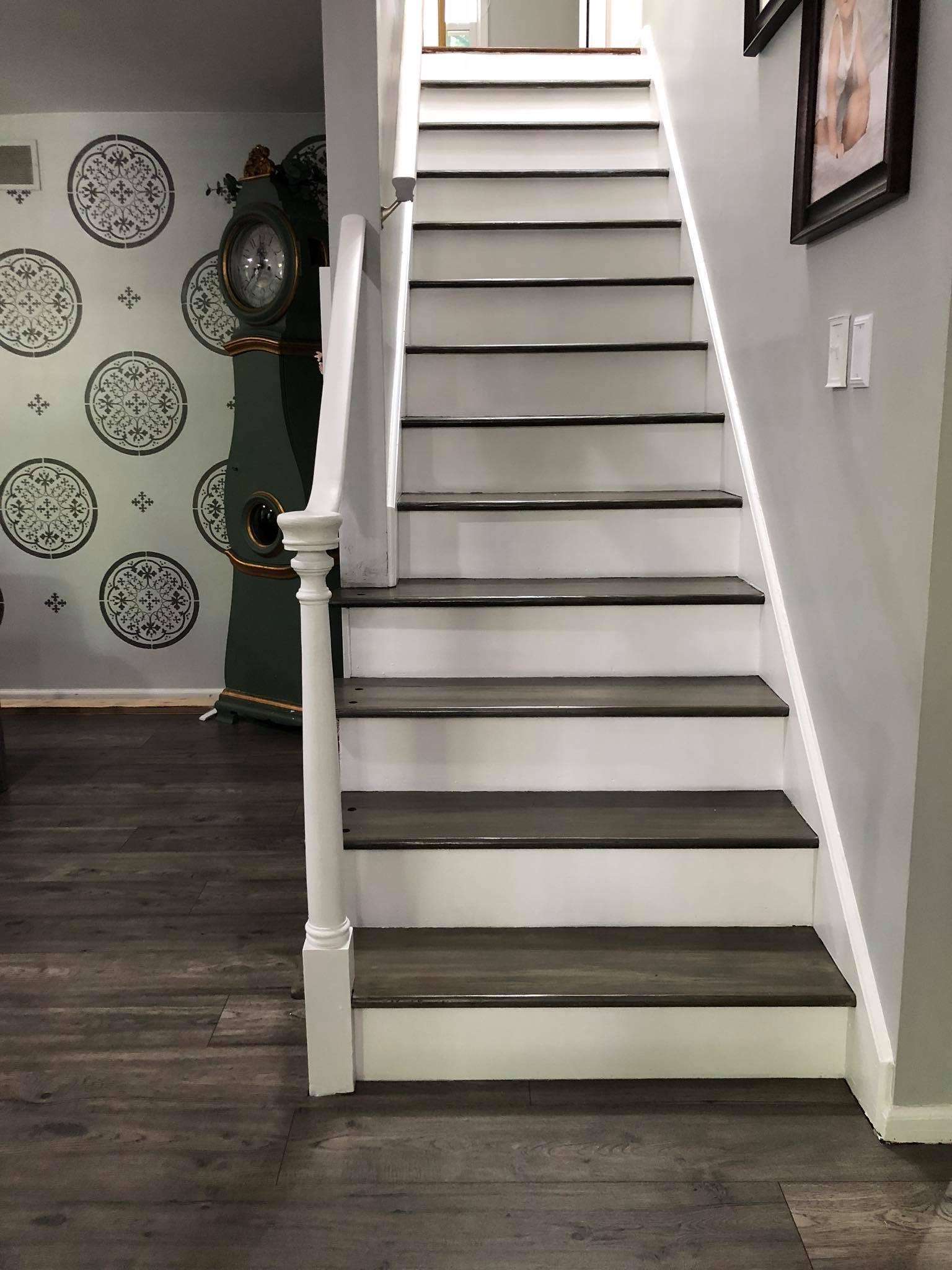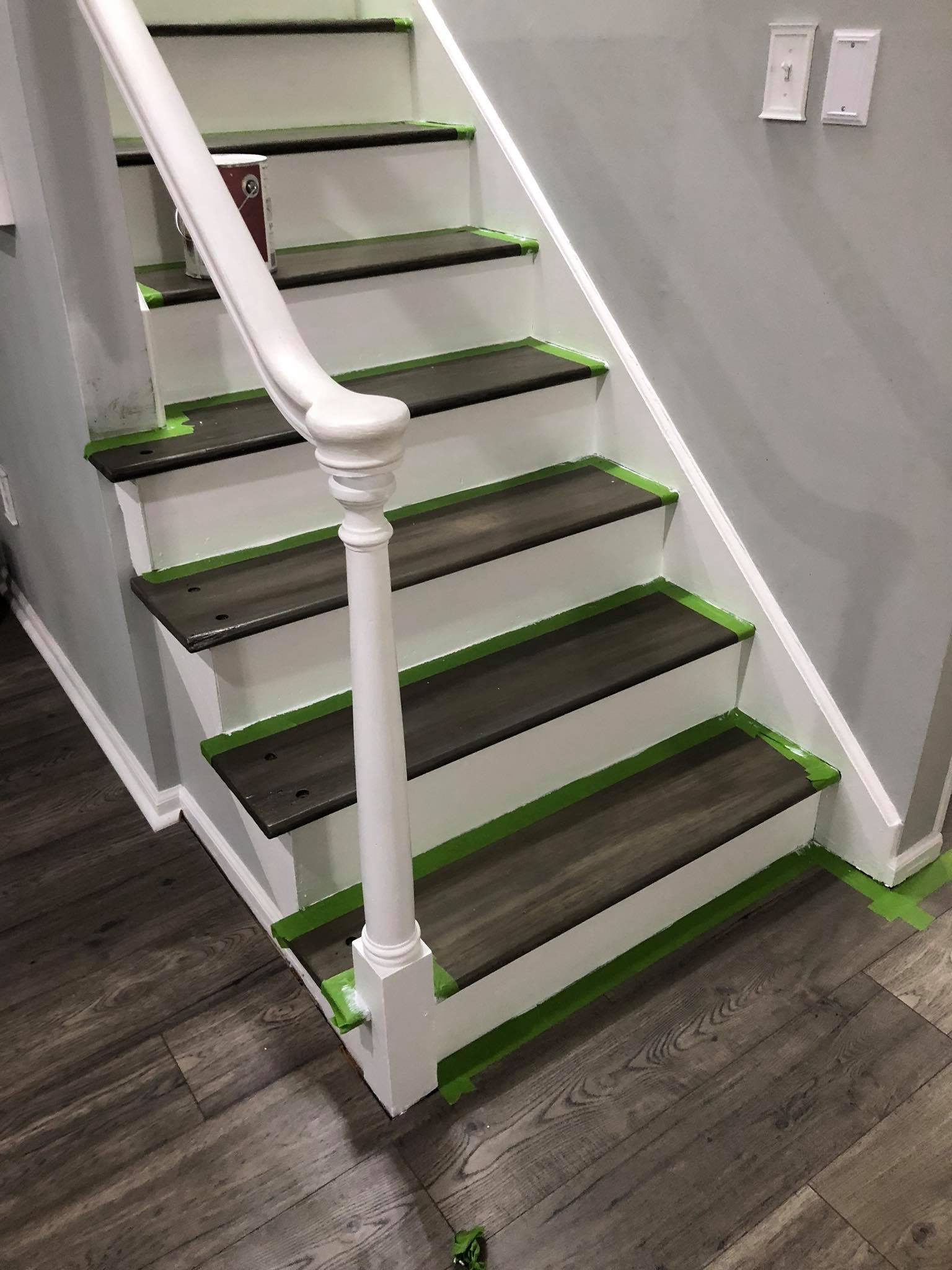 I made sure to tape off each step carefully! Remember make sure your steps are completely dry before adding tape to them. You don’t want to rip off all your handiwork. I waited over two weeks before I started to paint the risers, one because I need a break and so did everyones leg muscles, and two there was no way I was going to rip up that stain. FrogTape is my favorite painters tape, I seem to get a much better straight line using it. There were a few spots that the paint had bled through. I used a small paint brush and brushed over the area with my darkest stain. BOOM…Steps finished!! Whew, Can you see why I never finished the banister? I was exhausted. LOL!