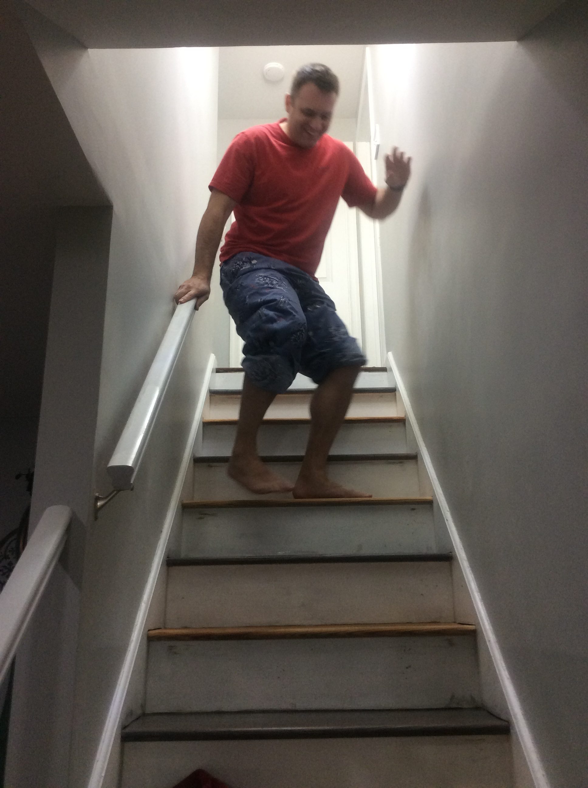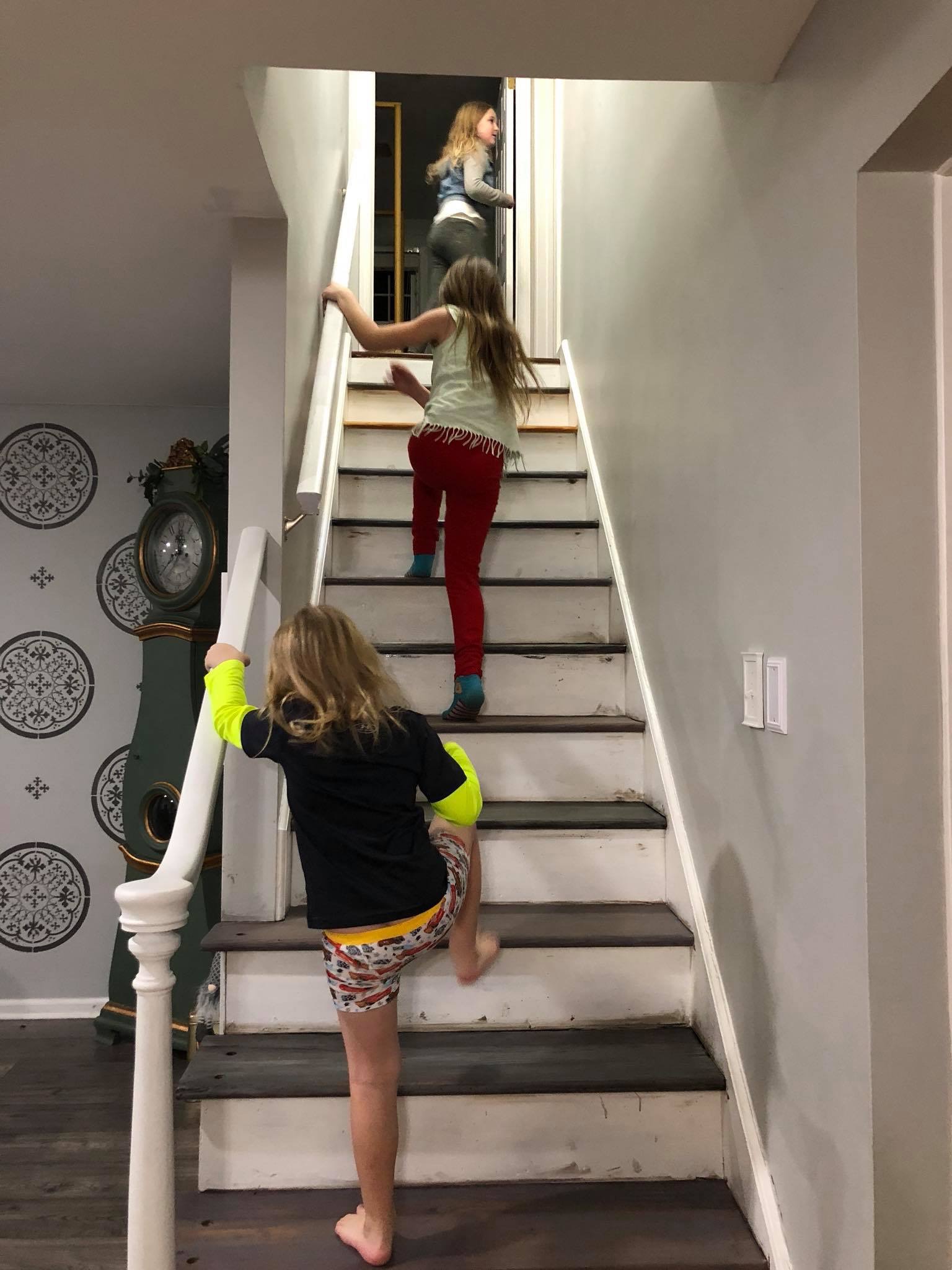 During this time, I did every other step so that the steps were still somewhat useable. After all I still had 3 little kids and 1 very large kid who were going up and down the stairs constantly. I even color coded them at one point with post it notes because it started to get difficult to tell which steps had just been stained. This was a great workout for everyone involved. Going up was way easier the going down!! Your welcome everyone, who came to visit during this time as well.