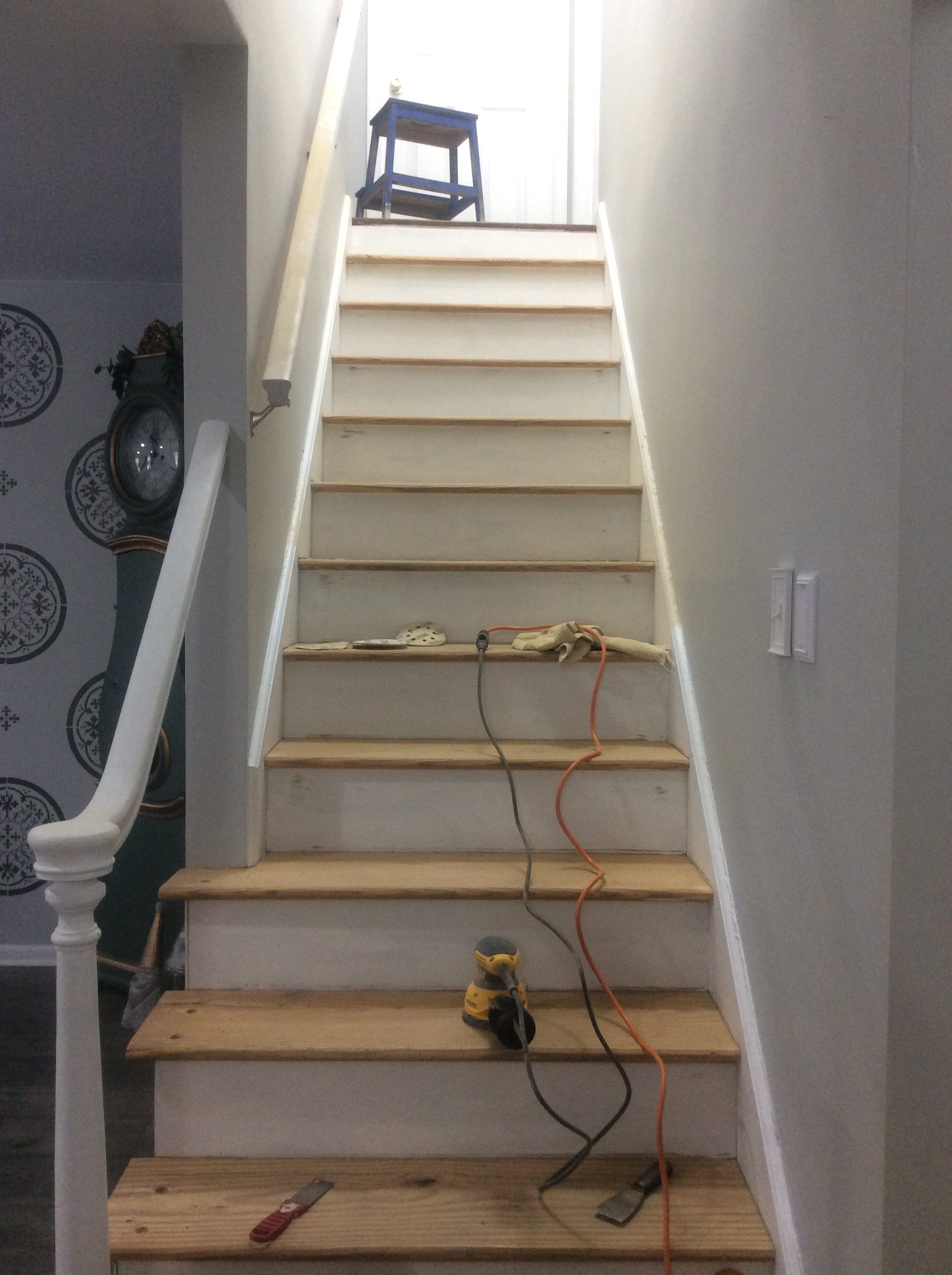 The first step was remove all of the carpet, nails and tack boards. I have never seen so many nails, this is by far the worst part of removing carpet. The nails are so tedious, but it is absolutely necessary for them to be ALL gone. After the carpet was removed and disposed of it was time to get sanding. Also, another tedious job!!! As you can already tell this was a pure labor of love. These steps had tons of paint on them, from someone painting the molding and not caring that they were painting the stair tread because it was going to be covered by carpet. Awesome for them…not so much for me!!
