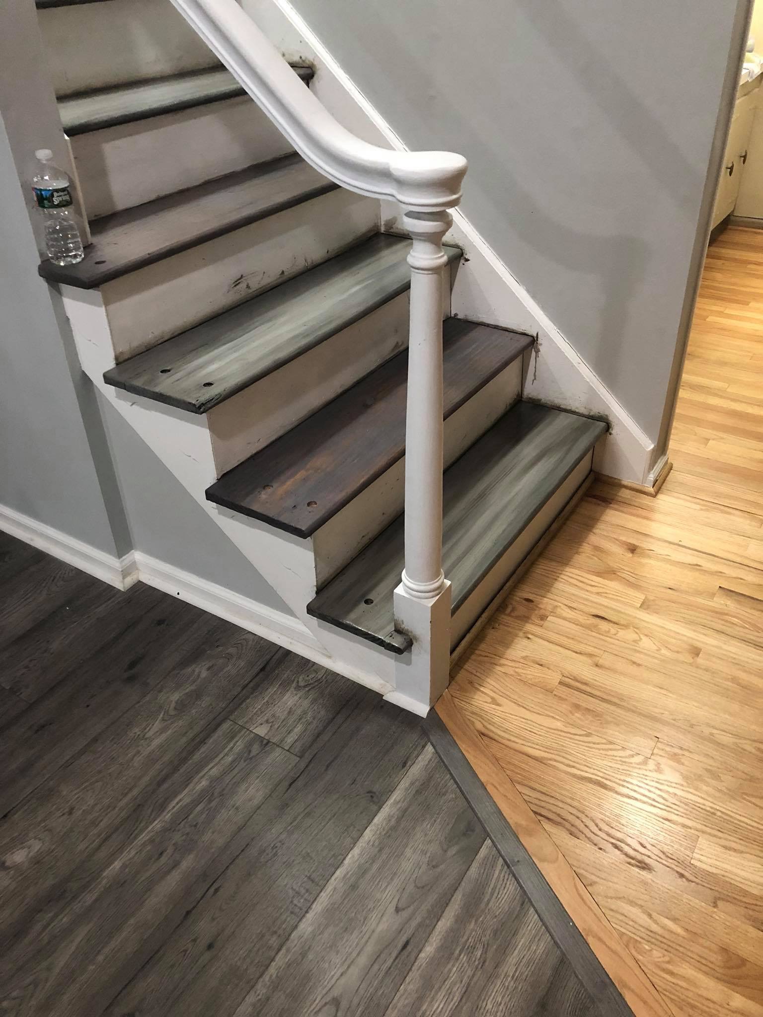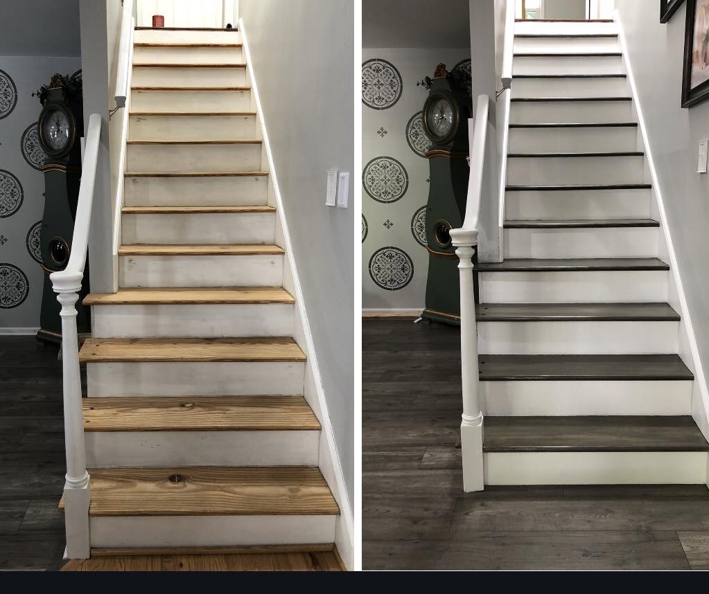 After all the sanding is done, it was time for the fun part…Staining!! I chose to stain my steps gray to match the flooring on the top floor and in the living room. Getting that color was a little tricky. I had a contractor come in and tell me how hard and impossible it would be to match because I had Pergo flooring which means they design the floor color and lines which on natural wood would never look the same. Ha…challenge accepted…Never ever tell me I can’t do something! 😉