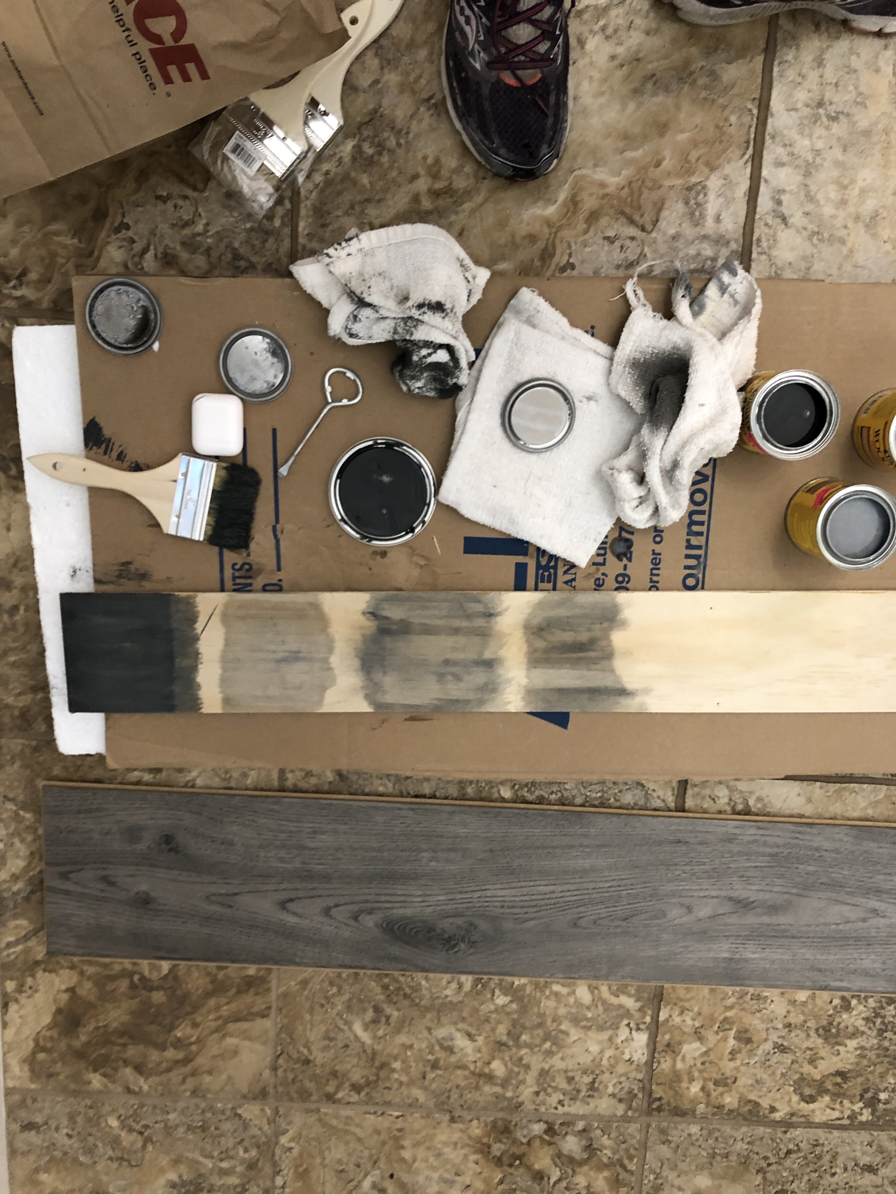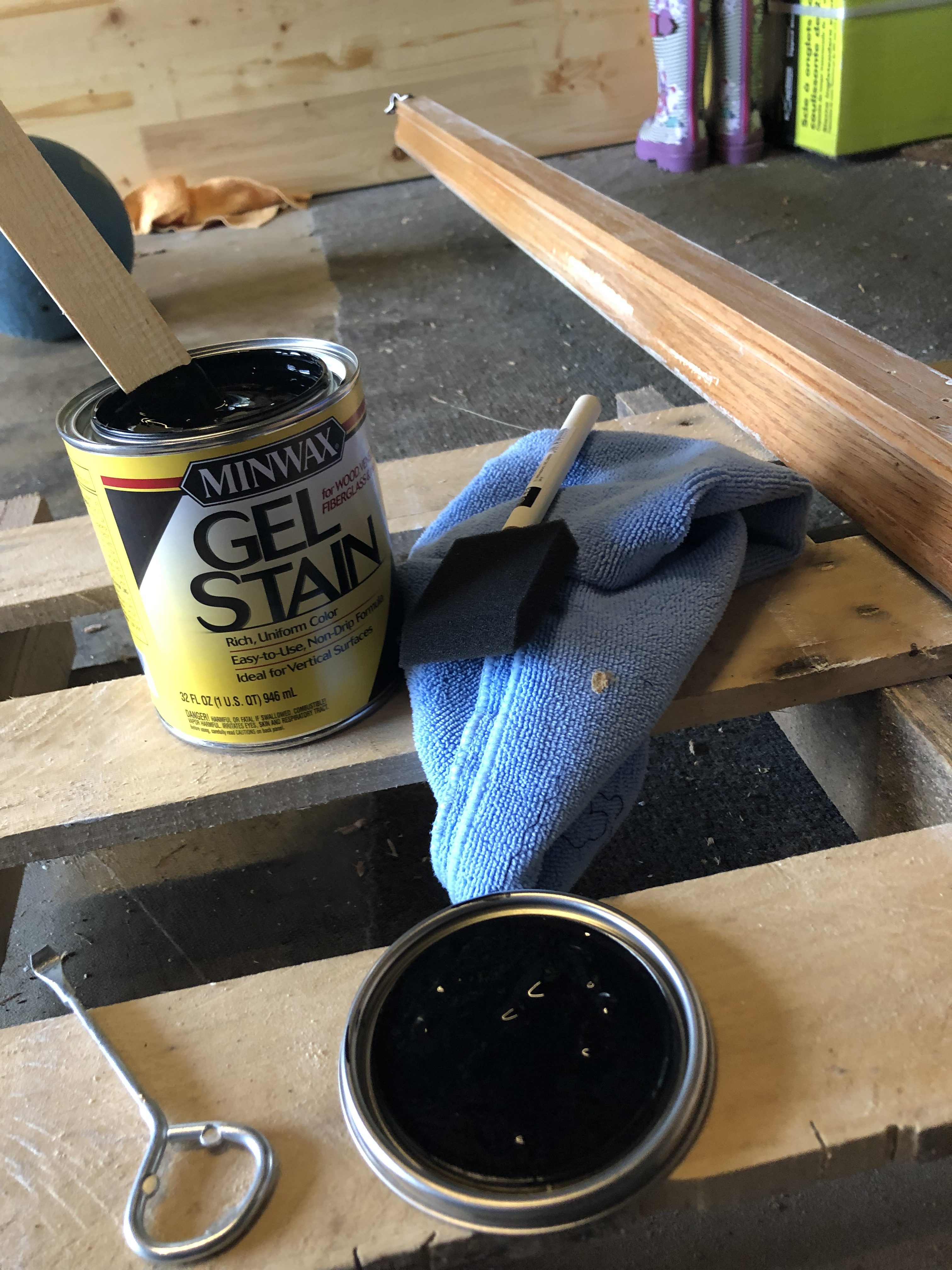 Step 3: Mix up your Gel Stain thoroughly, using your foam brush apply your gel stain with thin coats. Make long brush strokes. Get all your creases around your taped off areas. Allow to dry, recommended time and then add another layer if needed.