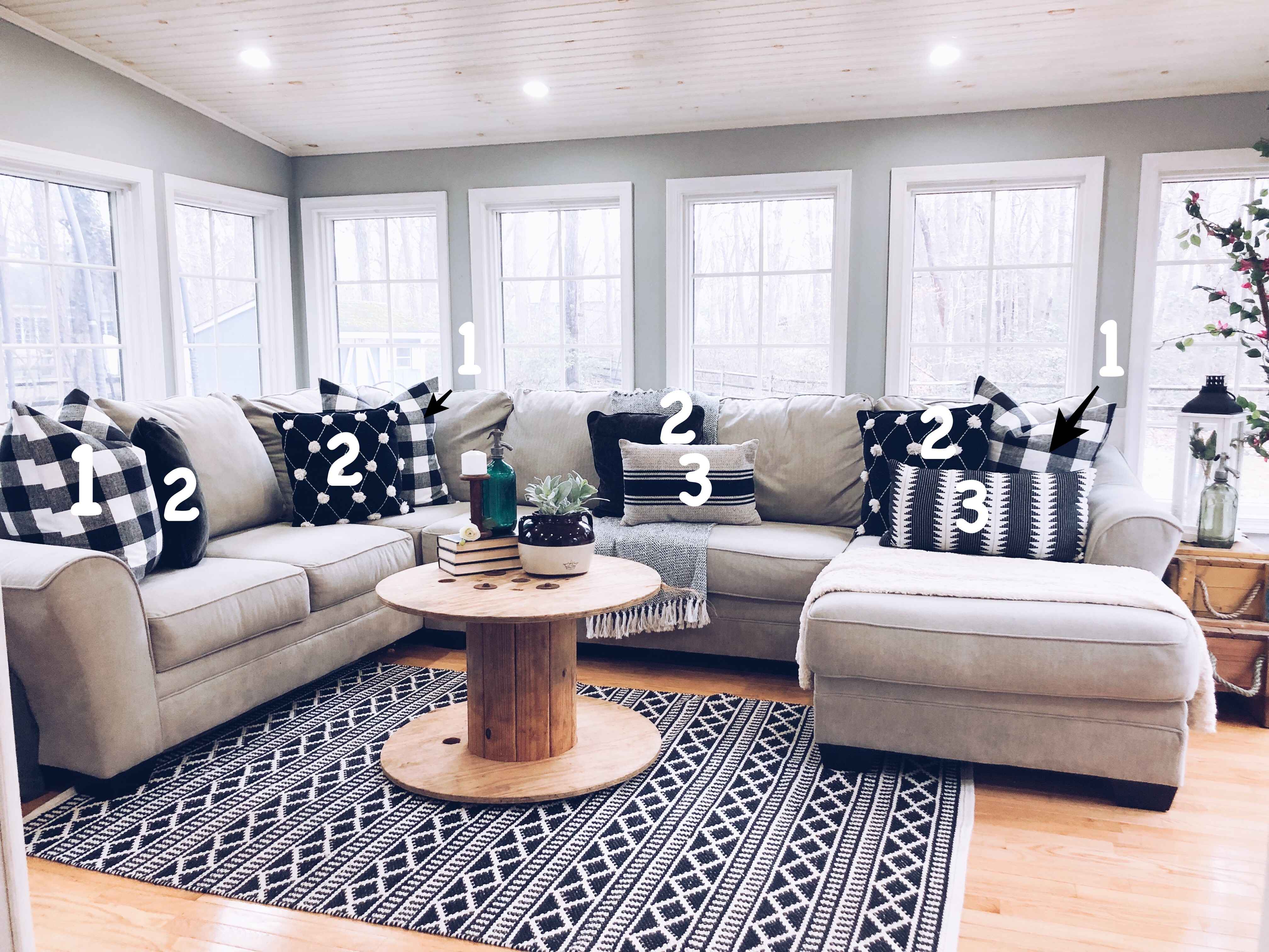If you follow our blog, you would know 3 is my magic number. I like to group things in 3’s. This applies to pillows as well, odd numbers are visually more appealing. There are a variety of ways to style your pillows; the goal for me is it looks chic, clean and welcoming. Remember there is no right or wrong way to arrange your pillows…this is just what works best for me. For a sectional or sofa I always start at the ends with 24″ or 22″ pillows to anchor the space and add balance. Next I layer smaller pillows in front by adding two 20″ pillows in front of the other pillows, for texture. For the center of a sectional I add one 24″ pillow in center and one 20″ pillow or one lumbar pillow. For empty spaces in the sectional that I feel need an extra boost I use one 20″ pillow and add one lumbar or different shape pillow in front.
