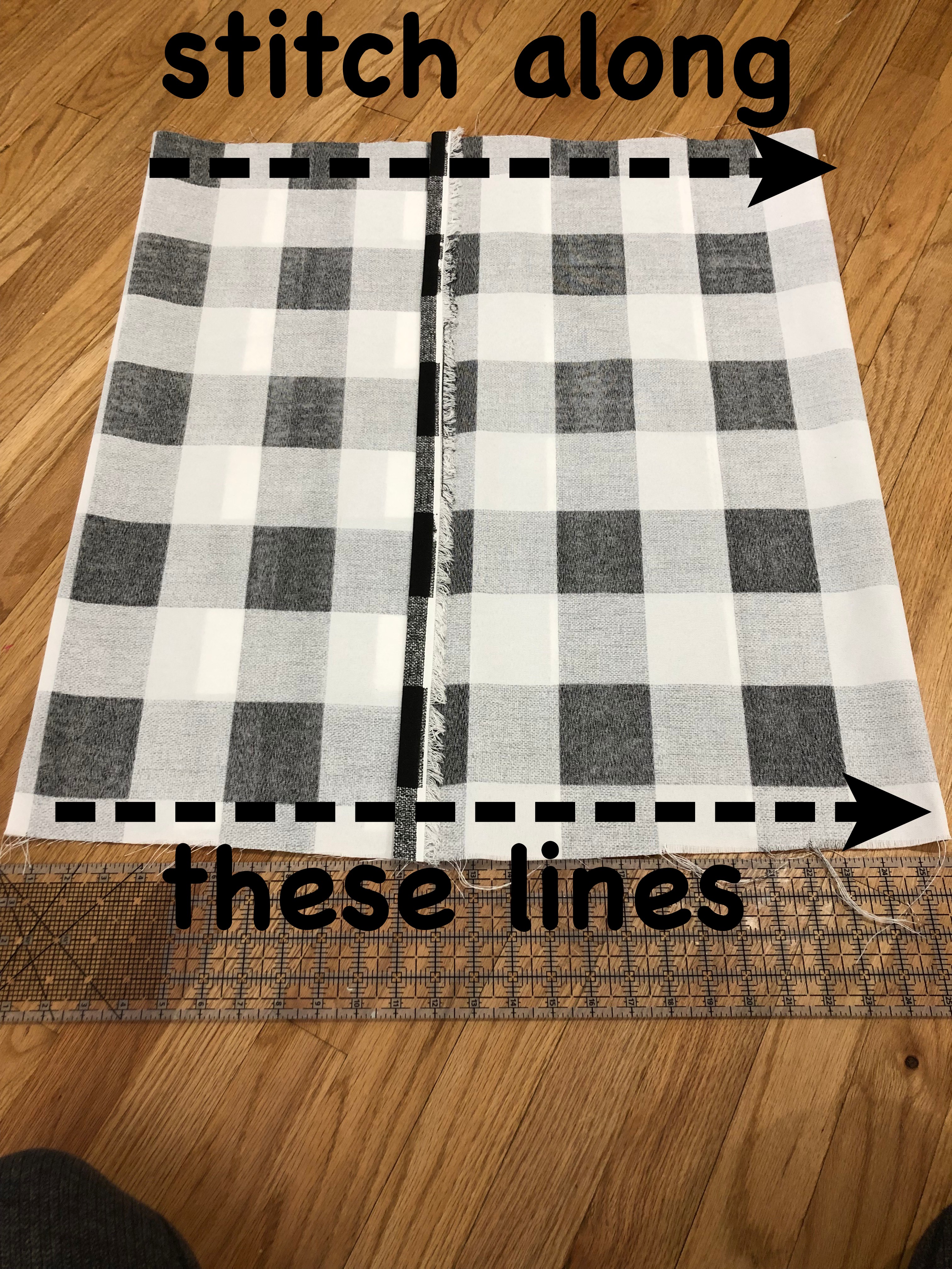 I used my measuring ruler to make sure it ended up at 24″. For this tutorial you only need to sew four straight lines. Pin the overlay into place. Stitch across the upper and lower edges 1/2″.