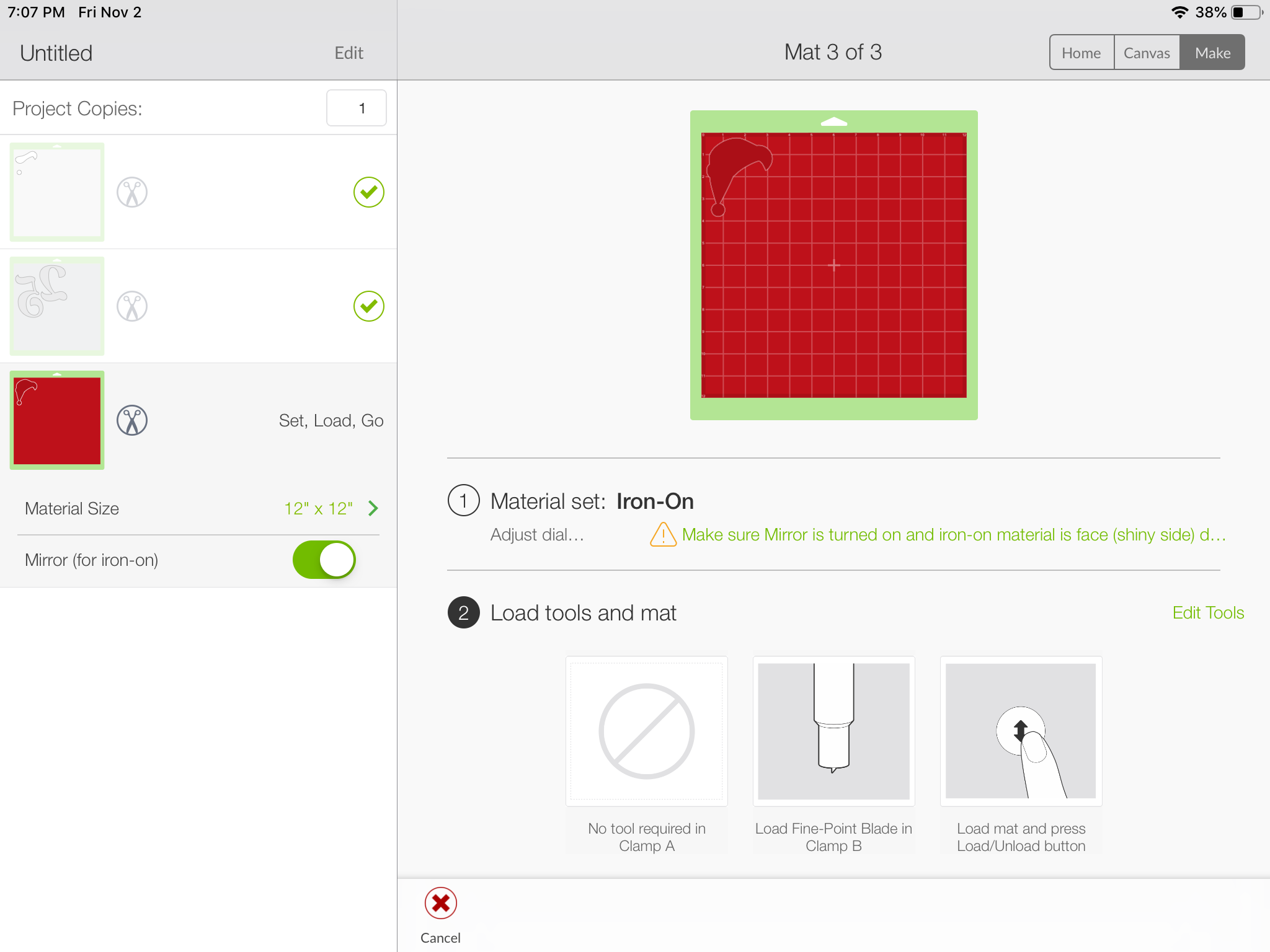 Once your design is done, press the green button that says Make It. That will take you to another screen where the mats will be laid out. When working with iron-on be sure to Mirror the Image (there is a slide button). I have learned the hard too many times to count!!! Also, with iron-on place the shiny side down on the mat so the cut will be on the back side not on the clear top.