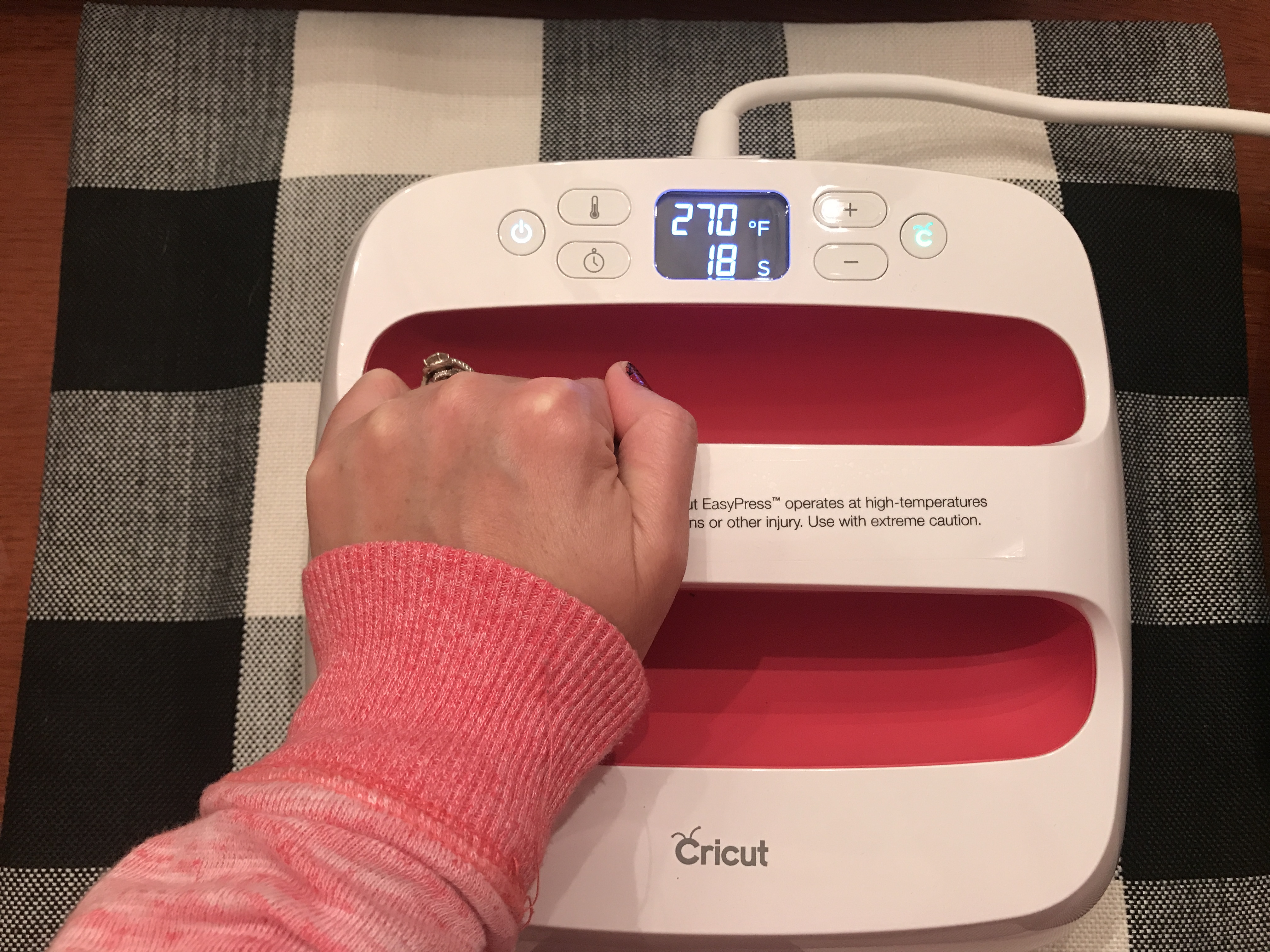 an iron for 15 seconds. Place your design on the warmed area and place the press/iron on top and press the button for 30 seconds. Hold the press with light pressure. There are different temperatures for different materials so just double check that information before you use the cricut press.