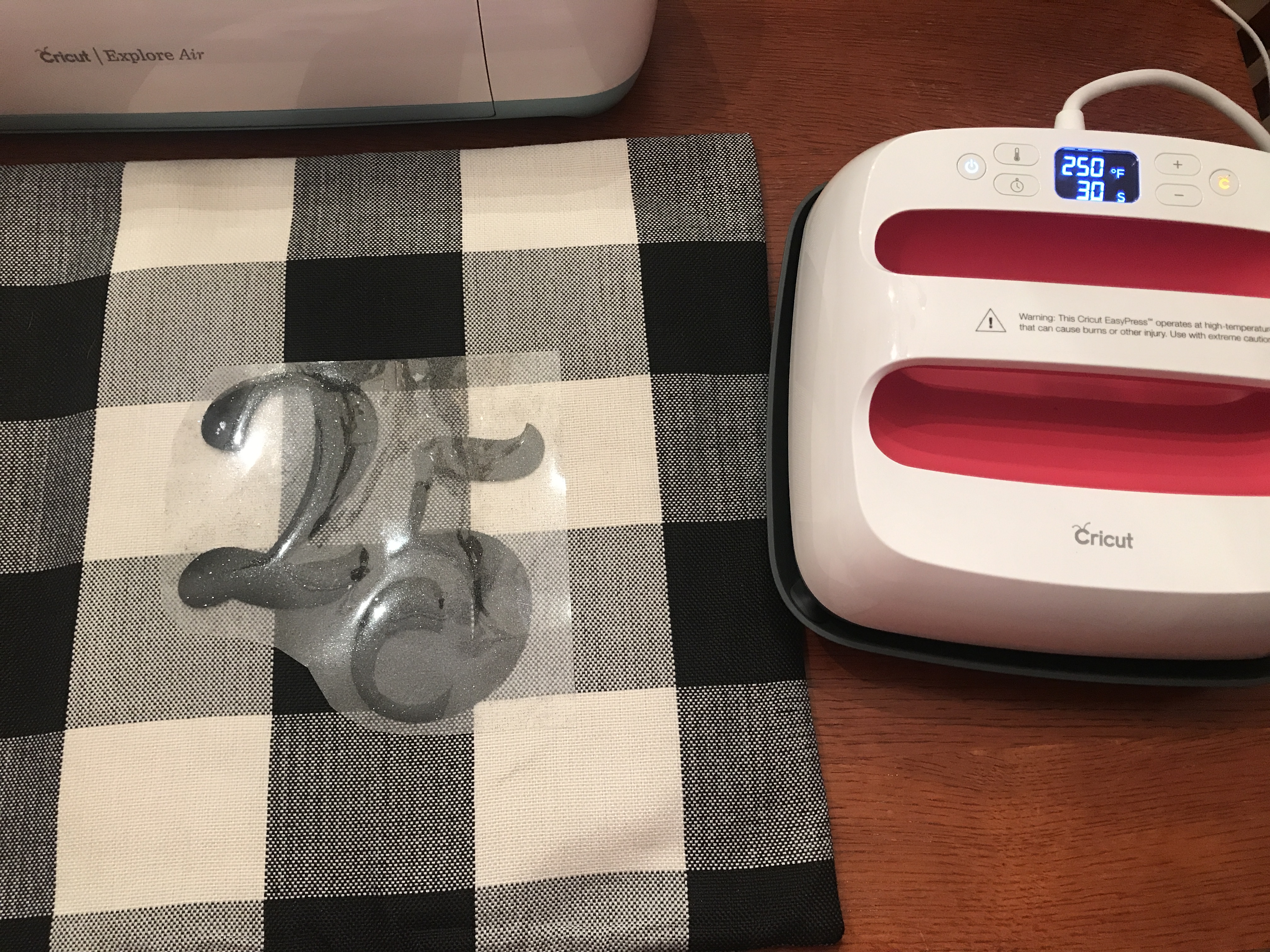 Next, put the pillow on an ironing board or cricut press pad and line up your design to make sure everything fits right. Then remove it and warm the area on the pillow with the cricut press or
